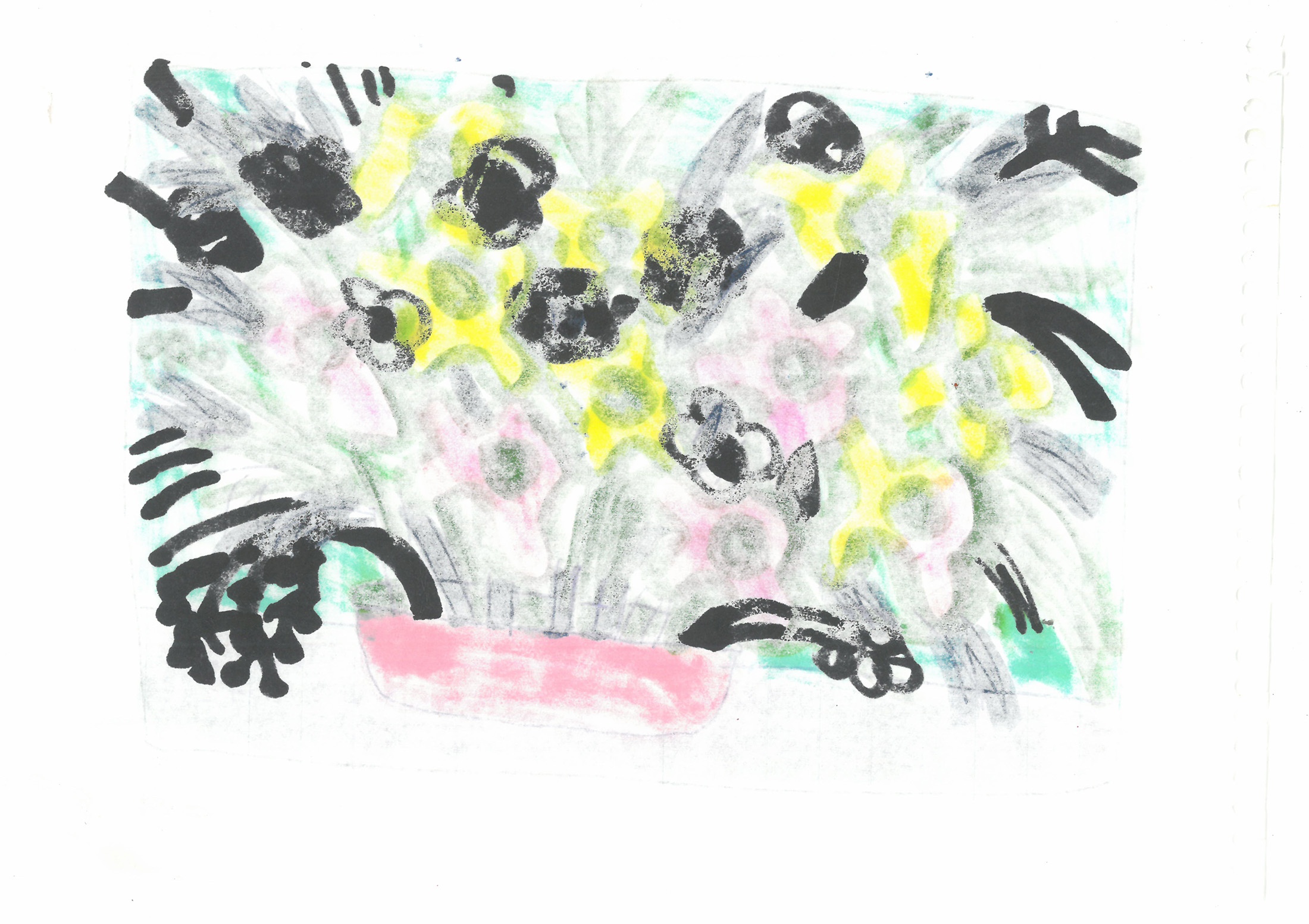 ⌂ Sunday 10 November, visit #2: (Khanya Mashabela has baked cookies, Dan has brought along a cheesecake from New York Bagels, and together with Moshekwa and Josh Ginsburg we are drinking lots of cups of coffee from Georgina’s Nespresso served in pretty teacups and discussing whether we should wait to include a drawing of flowers that is taped to the wall, currently in use towards a giant painting.)