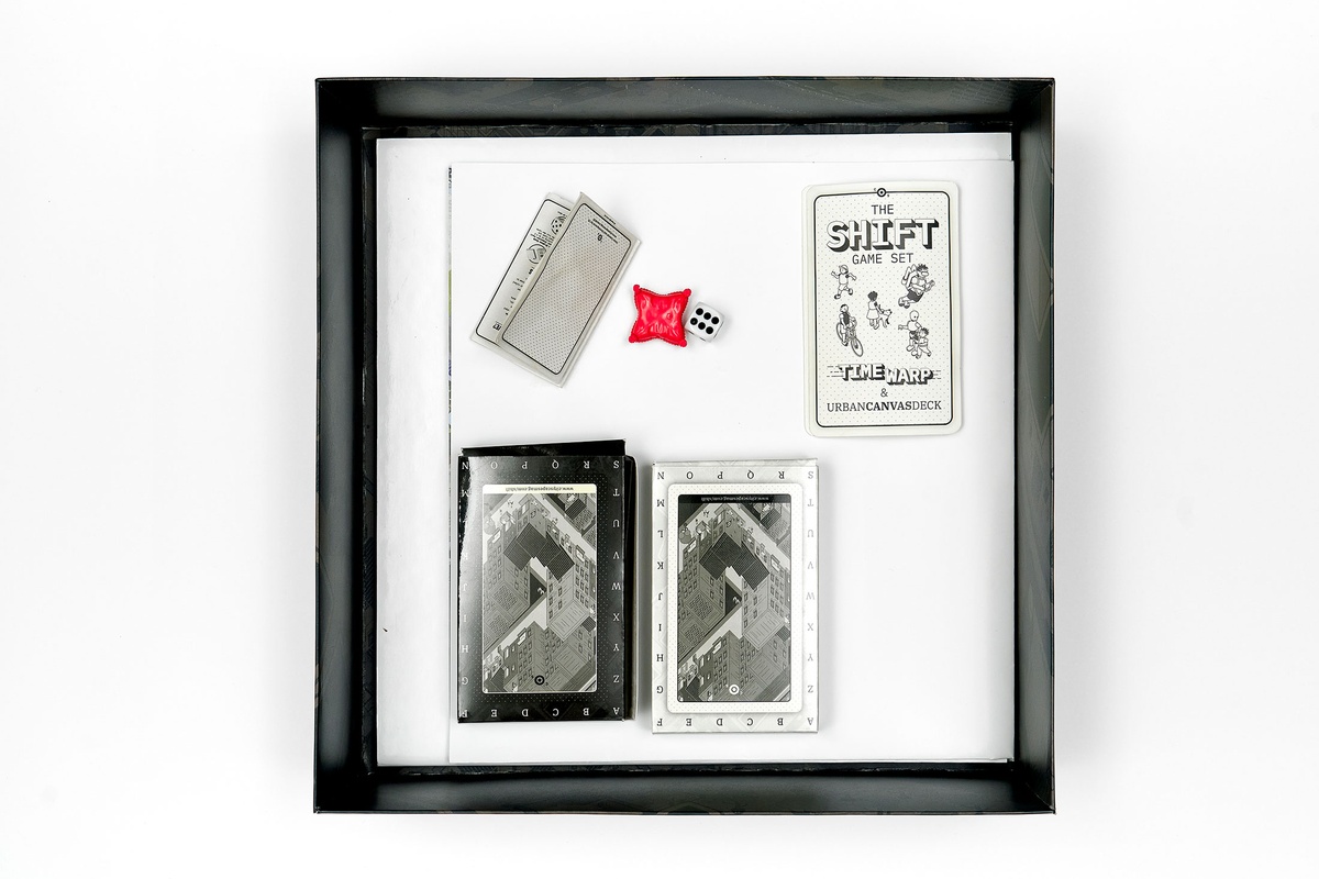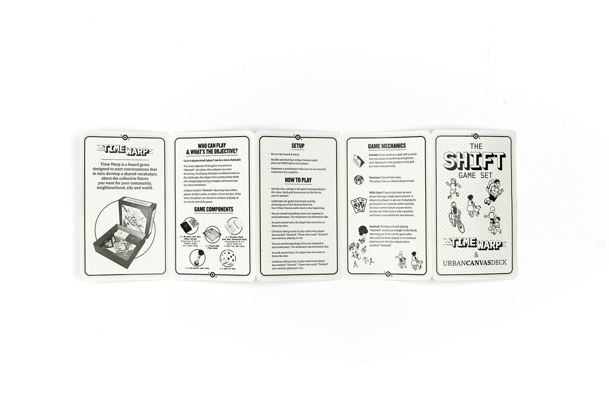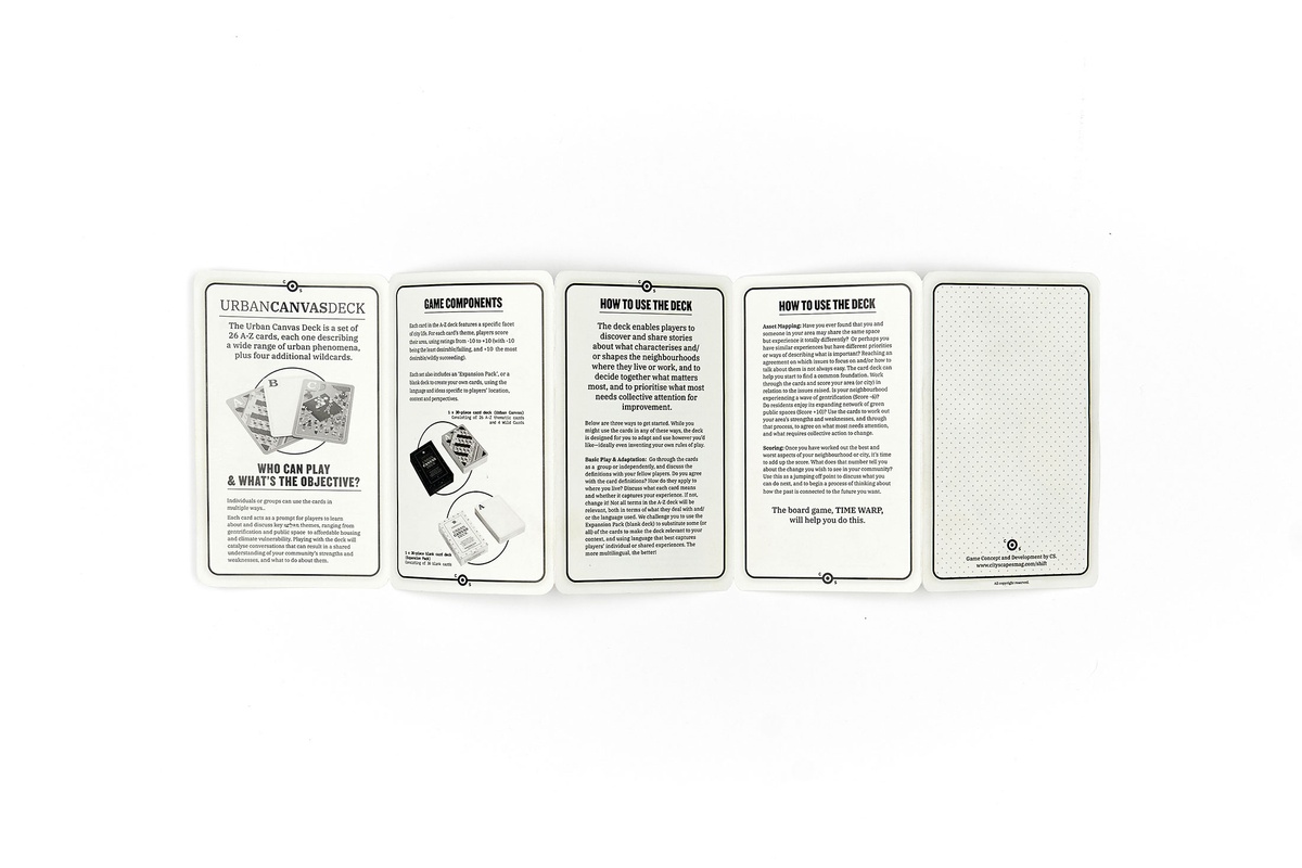 Tavengwa and Pieterse invited A4’s team to become players of The Shift Game Set in its prototype phase. It includes the Time Warp game board and poster, two Urban Canvas Decks and an instructional booklet. Facilitating linear and non-linear play, the Time Warp game board allows players to compare observations across different contexts and timeframes. The Urban Canvas Main Deck provides coordinates for thinking about urban environments in relation to their social and cultural dimensions and urban planning policy, while its Blank counterpart affords the inclusion of individual perspectives.