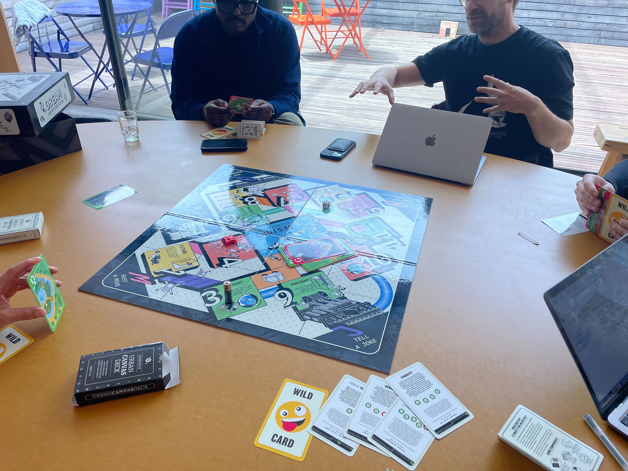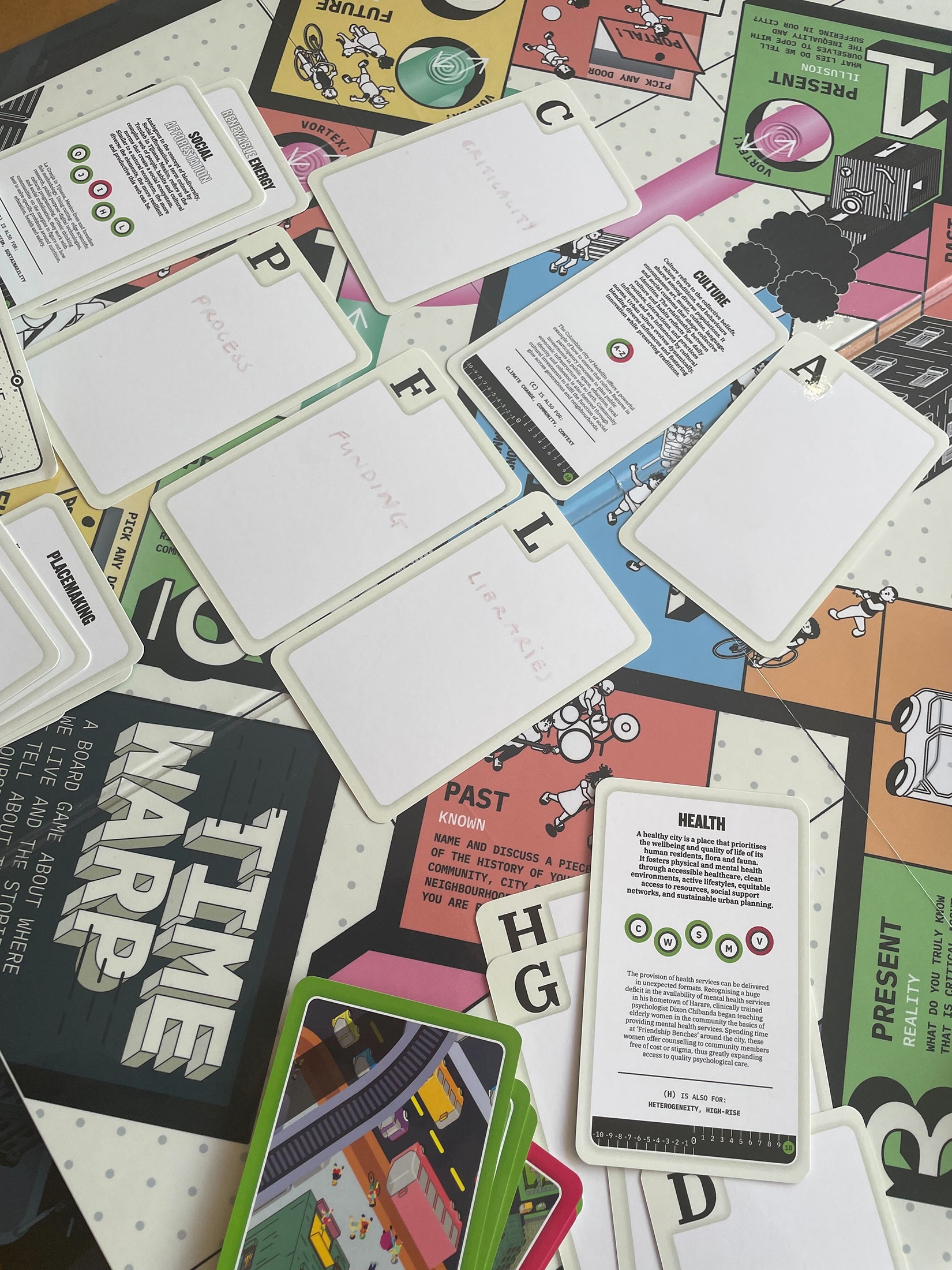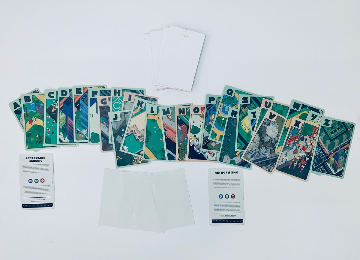 Tavengwa and Pieterse invited A4’s team to become players of The Shift Game Set in its prototype phase. It includes the Time Warp game board and poster, two Urban Canvas Decks and an instructional booklet. Facilitating linear and non-linear play, the Time Warp game board allows players to compare observations across different contexts and timeframes. The Urban Canvas Main Deck provides coordinates for thinking about urban environments in relation to their social and cultural dimensions and urban planning policy, while its Blank counterpart affords the inclusion of individual perspectives.