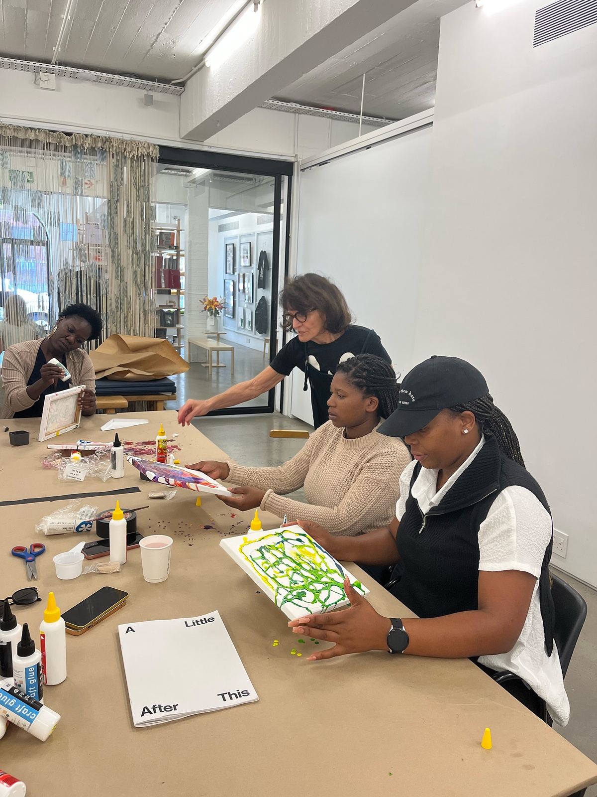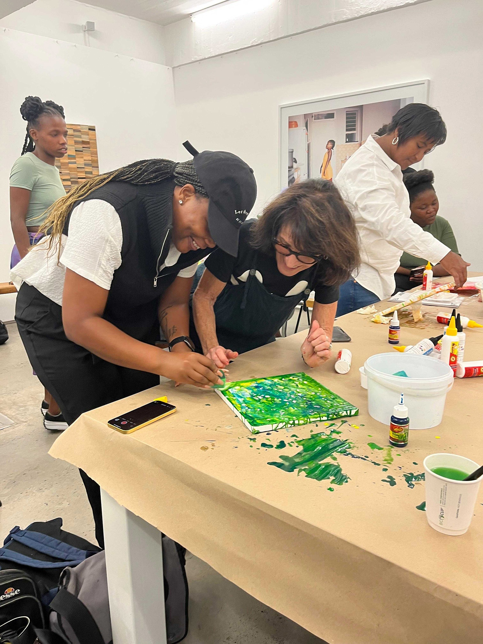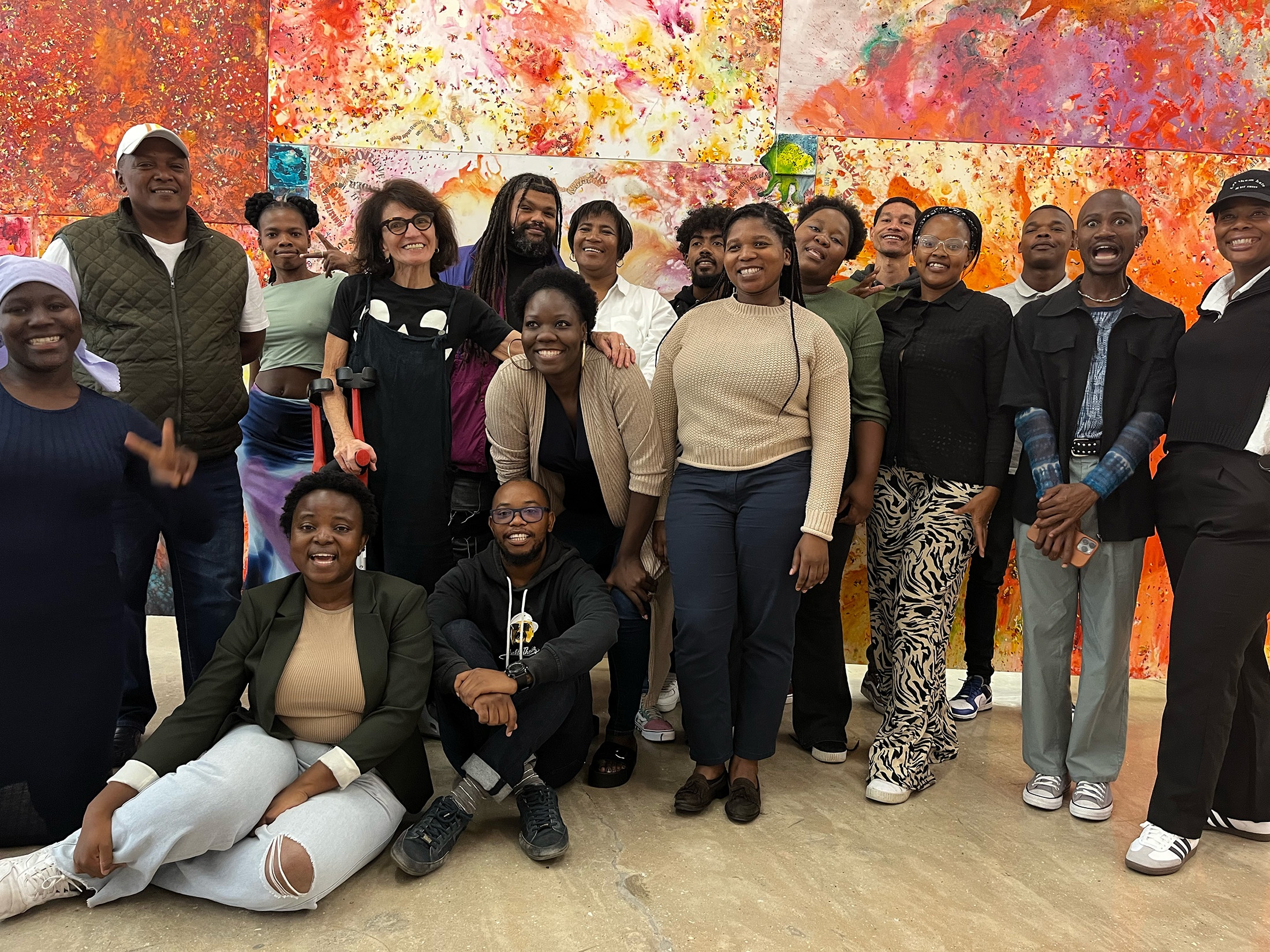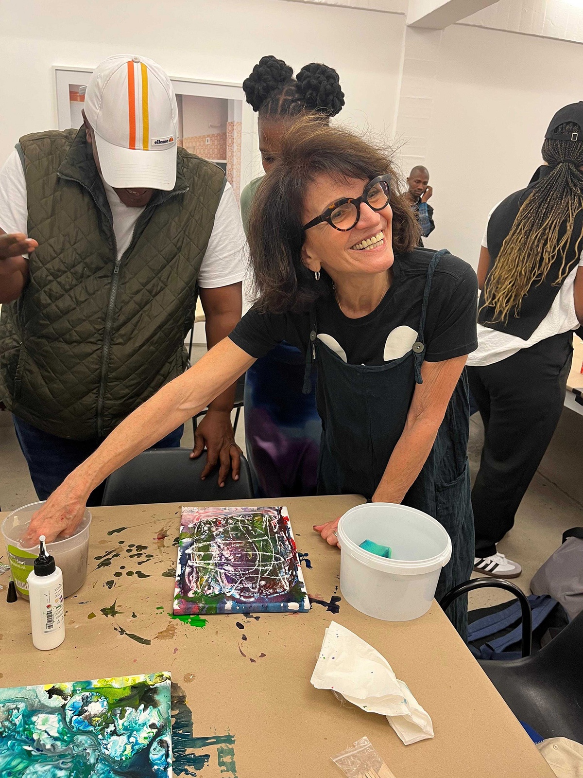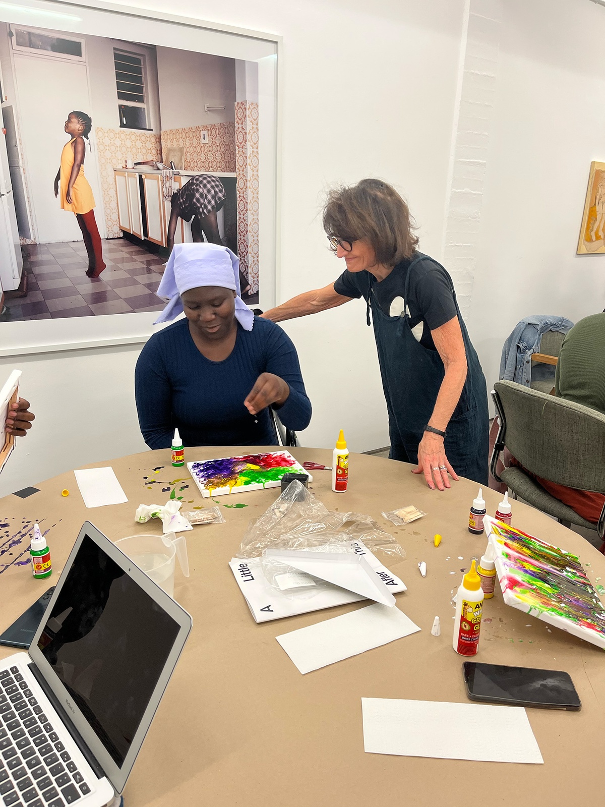 Lalela’s educators work year round to facilitate the educational and emotional needs of the learners in their care. With the wellbeing of these teachers and their professional development in mind, we invited them to join a workshop with Penny Siopis on the occasion of A Little After This. Siopis created a nurturing environment in which to experiment with methods the artist has developed in her own work. Equipped with craft glue, ink, water, sponges, and canvas, Siopis encouraged Lalela’s facilitators to collaborate with their mediums, entering into a conversational engagement with their tools when guiding the glue to pool on the canvas, following the emergent shape within the ink, and sensing form and letting it arise. Emphasising the aliveness of materials, while encouraging the educators to remain open to the process, Siopis eschewed any impulse towards viewing any move as ‘wrong’, rather looking towards trust and improvisation, in this way imparting ways of learning as well as core technical skills that could be added to educators’ teaching toolkits. For Lalela, “Siopis’s wisdom resonated deeply with our facilitators as she emphasised the importance of embracing an open and exploratory process in art.”