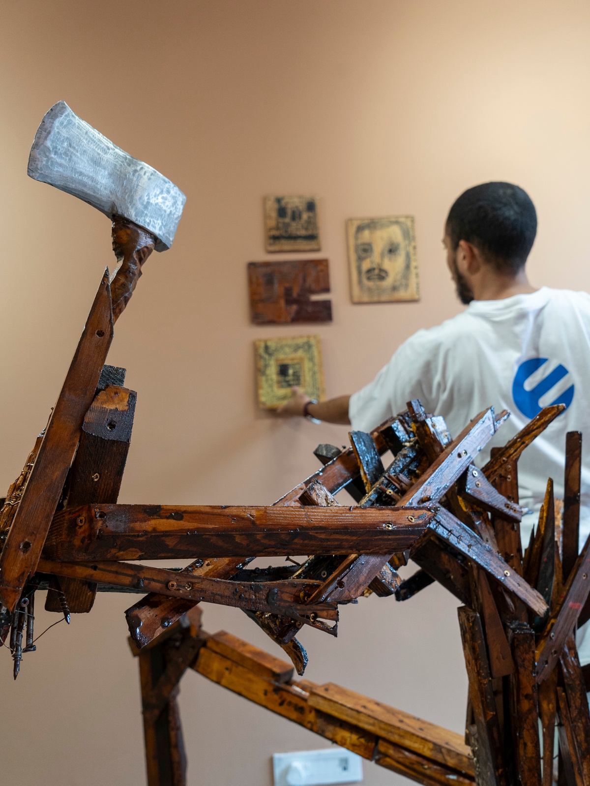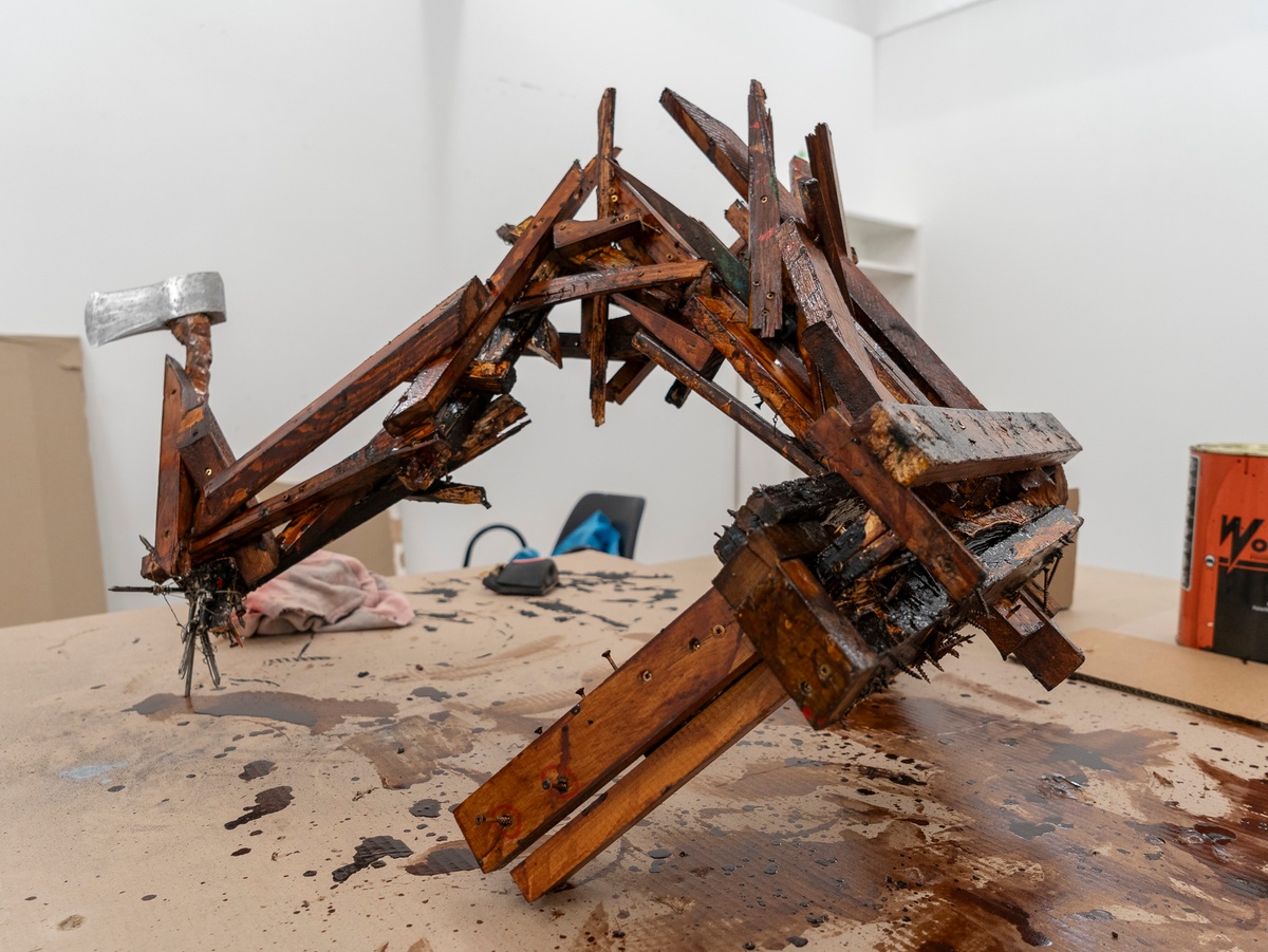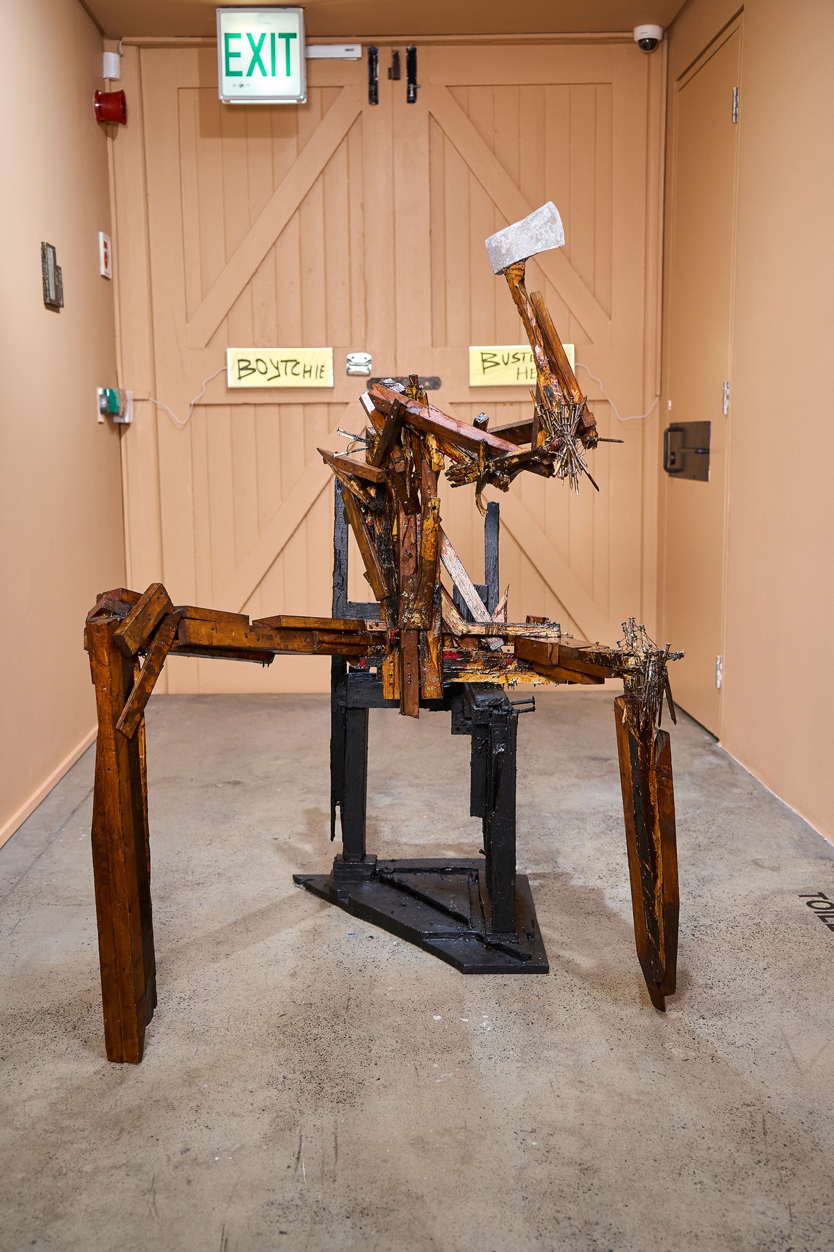 Boytchie (aka Phillip Newman) iterates and reiterates a sculptural installation centred around two specific found objects: a broken chair and an axe. In his initial engagement with these objects, Phillip found a compelling tension in their ability to evoke both aggression and fragility when combined. This tension, he suggests, reflects the public perceptions and inner emotional turmoil that characterise the experiences of many young men of colour in Cape Town. Phillip uses his time in Goods to play with materiality, exploring the limits of the sculpture’s fragility, without the pressure of permanence.