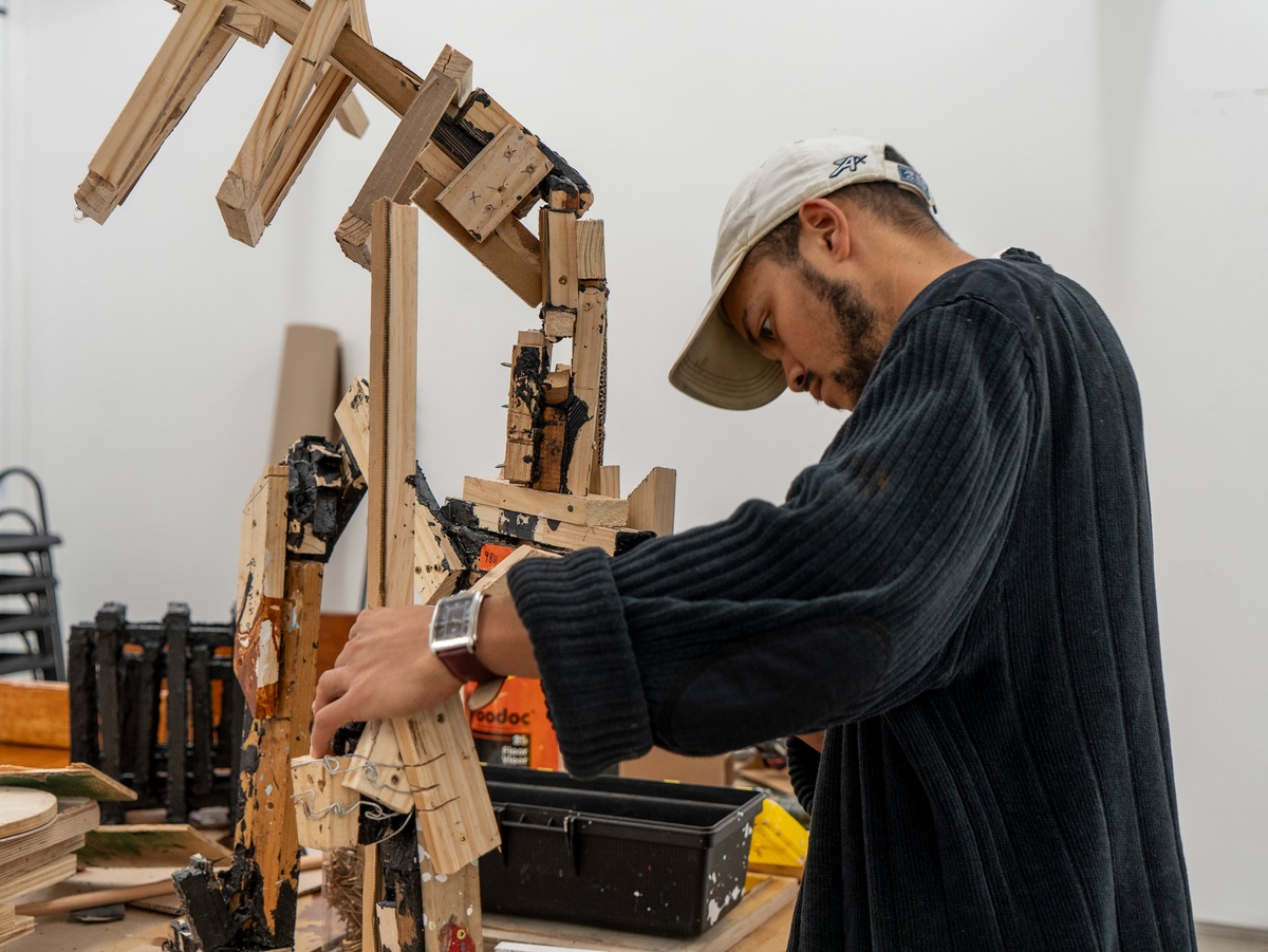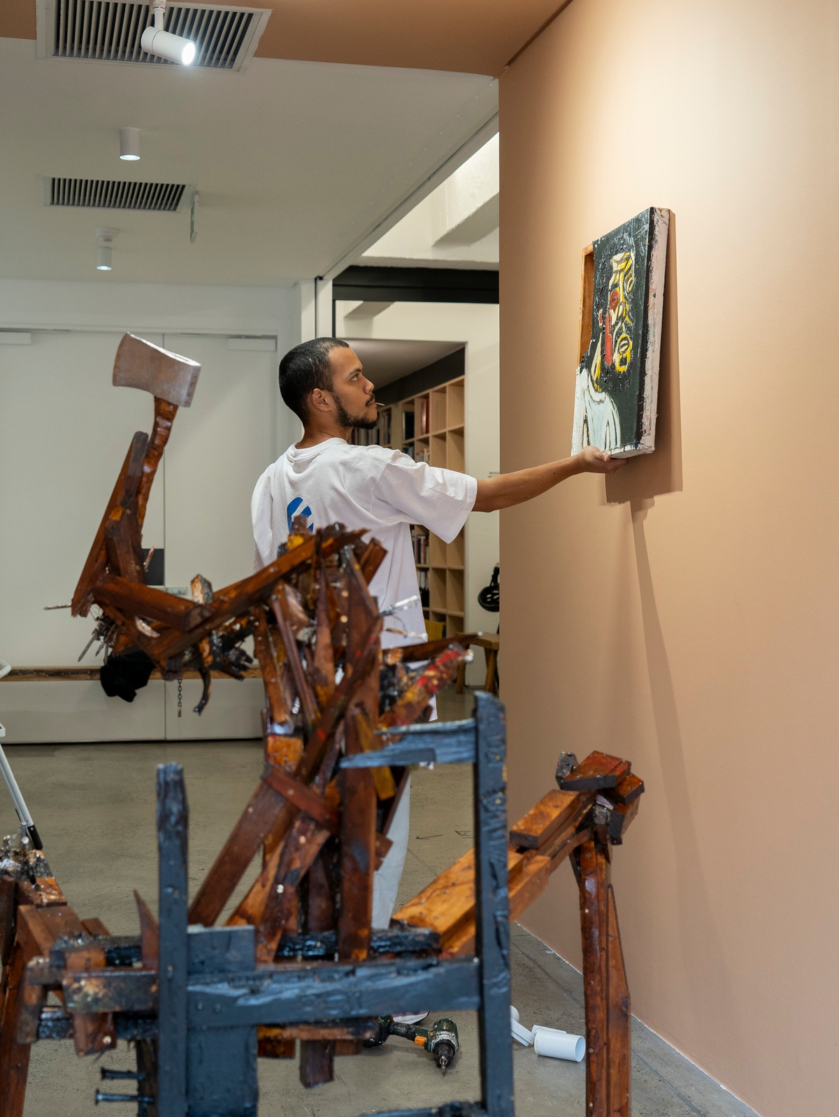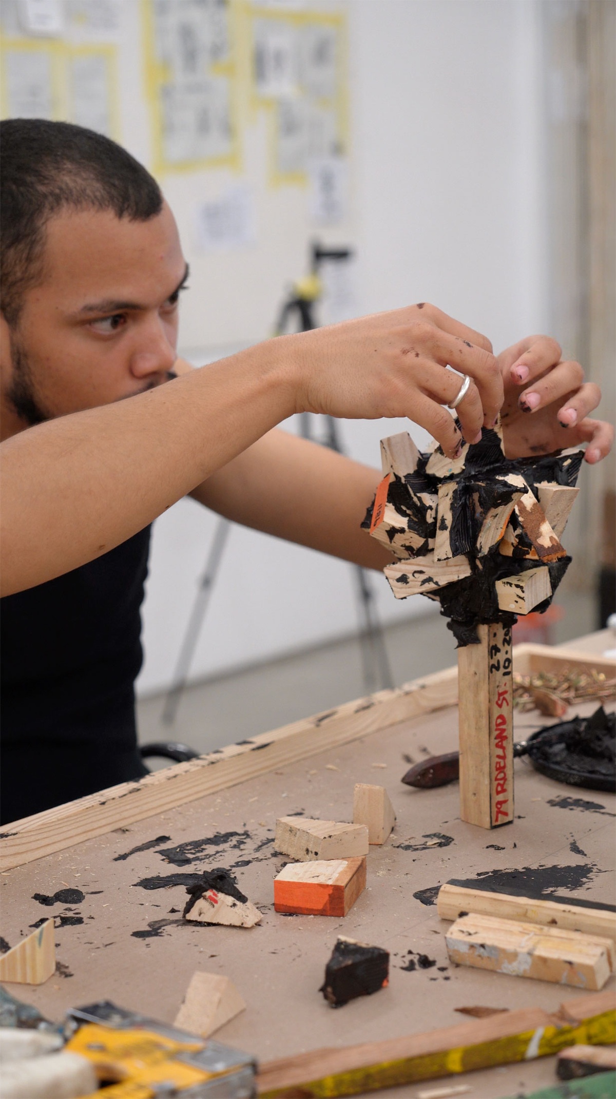 Boytchie (aka Phillip Newman) iterates and reiterates a sculptural installation centred around two specific found objects: a broken chair and an axe. In his initial engagement with these objects, Phillip found a compelling tension in their ability to evoke both aggression and fragility when combined. This tension, he suggests, reflects the public perceptions and inner emotional turmoil that characterise the experiences of many young men of colour in Cape Town. Phillip uses his time in Goods to play with materiality, exploring the limits of the sculpture’s fragility, without the pressure of permanence.