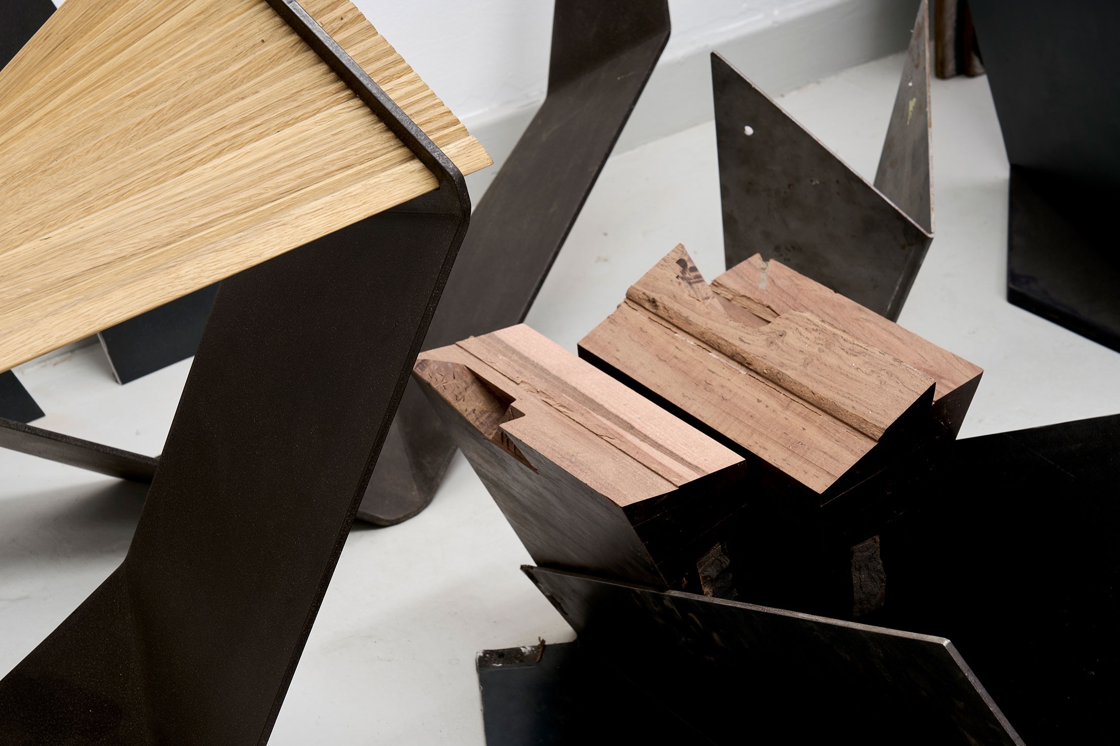 Alongside the broken surfboard is a pile of assorted parts that can be slotted and stacked together to assemble The Piek. A smaller version of Kriel’s Chapel Chair, it too requires a straight-backed sitting that inspires reflection. Where the Chapel’s aesthetic is ‘church’, and its use ascetic, Piek is imagined as a foyer chair, a piece to aid the transition between inside and outside worlds. When the mind is between states, The Piek is a place to take a moment to sort yourself out. “It has a mechanical sensibility, it can be sat on, and its use is tool-like,” says Kriel – for untying shoes, hanging a coat upon Piek’s steep back, and in the performance of those actions’ opposites. Kriel hand-brushes its aluminium surface seven times, a way of welcoming or getting ahead of the inevitable scratching that will mark the Piek's surface through use.