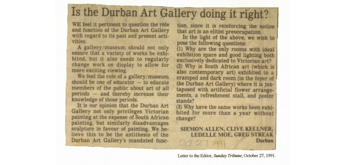 In October 1993, four flatmates – Ledelle Moe, Niël Jonker, Thomas Barry, and Siemon Allen – began FLAT, with the intention of hosting exhibitions in their lounge. Their flat was in Durban, on Mansfield Road (now Steve Biko Road), and walking distance from Technikon Natal (now the Durban University of Technology) where most of them studied Fine Art. Unlike many of the cultural organisations in Durban at the time, FLAT aimed to offer a platform for experimental art within a local community of practitioners. In 1999, Allen documented the history of FLAT in a book. Describing FLAT’s founding mission, he writes that they “began as a project to mount exhibitions without censure and to maintain a free space without the traditional selection system.”6 FLAT’s lifespan straddled the 1994 elections. “It was eight months before and eight months after. It was a dynamic, crazy time in South African history, and we felt like anything was possible: Yeah we’re gonna start a gallery!”7 Like FIG, the artists involved with FLAT were also frustrated with the limitations of the existing institutions. However, while Johannesburg had limited options to exhibit conceptual art, the conservatism of Durban’s established gallery scene went further. In a letter sent to the Sunday Tribune in 1991, co-authored by Allen, Moe, together with Clive Kellner, and Greg Streak, they criticised the Durban Art Gallery for prioritising Victorian painting and largely ignoring contemporary South African art. This frustration extended to many of the regional cultural institutions at the time, including the Natal Society of Art (now known as KZNSA), and has been described as a battle between the old guard and young, emerging artists.