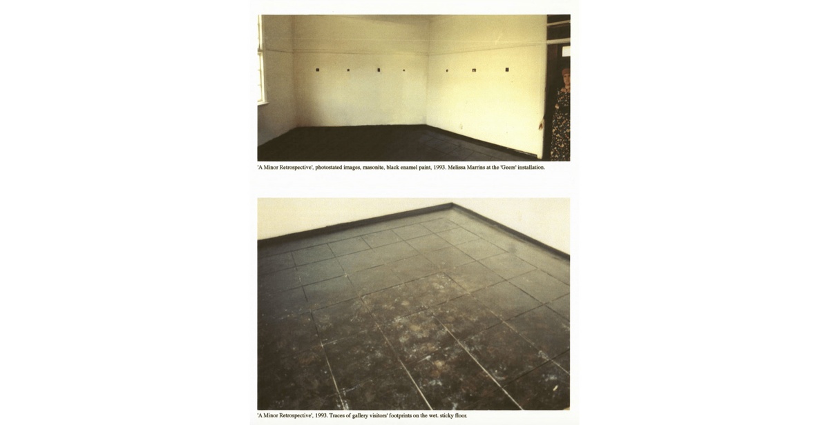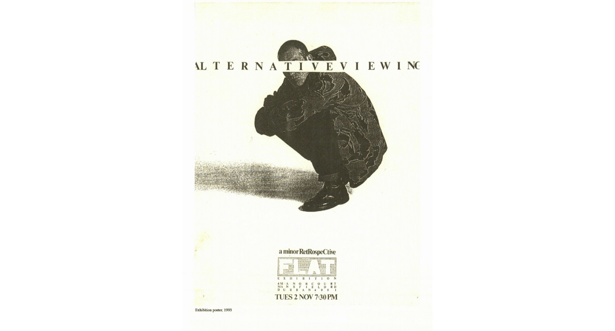 In the first eight months of FLAT’s life, exhibitions were largely made up of sculpture and painting, “traditional in media if not in content.” Further into FLAT’s life, artists began to explore more conceptual, performative, site-specific installations. This experimental attitude is demonstrated by their exhibition titled A Minor Retrospective (November 2, 1992). The co-founders photocopied catalogue images of Kendell Geers’ past works, mounted them on masonite boards, and announced a “faux retrospective” which deliberately coincided with Geers’ ‘real’ exhibition at the Natal Technikon’s art gallery. Seeing the FLAT’s advertisements posted in the streets, Geers believed that they were produced by Technikon Art Gallery for his exhibition. The Technikon Art Gallery curator Frances Van Melsen, believing that Geers was involved in the FLAT exhibition, announced at the opening that more of his work could be viewed across the street. Adding to the comedy of errors, the FLAT co-founders attempted to fix their damaged floor by giving it a fresh coat of black enamel paint with the optimistic hope that it would dry in the three hours before the exhibition opened. Visitors’ shoes stuck to the floor as they navigated the exhibition, which they thought was another of Geers’ witty, site-specific interventions. The illusion was sustained because Geers never disowned the exhibition.8