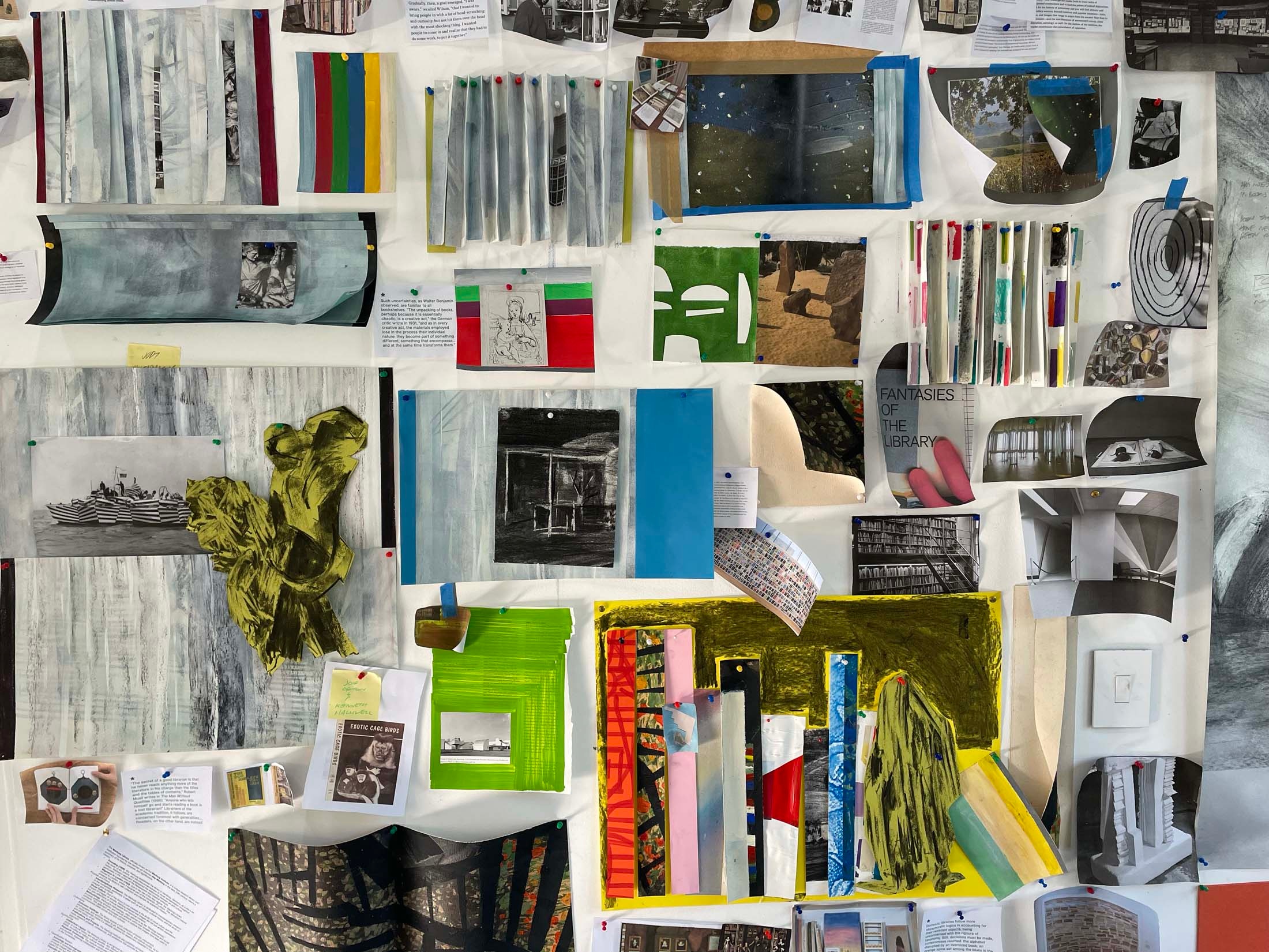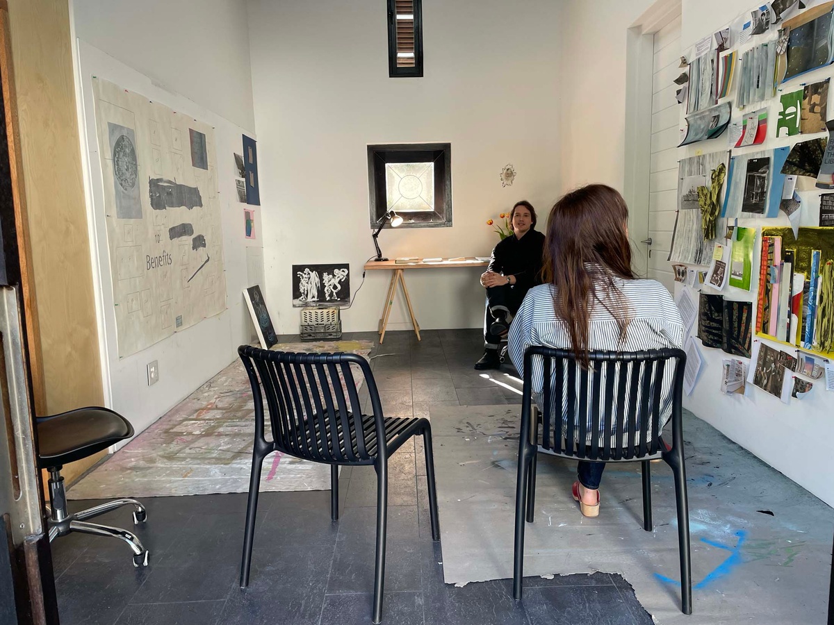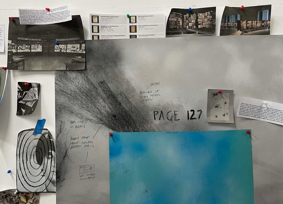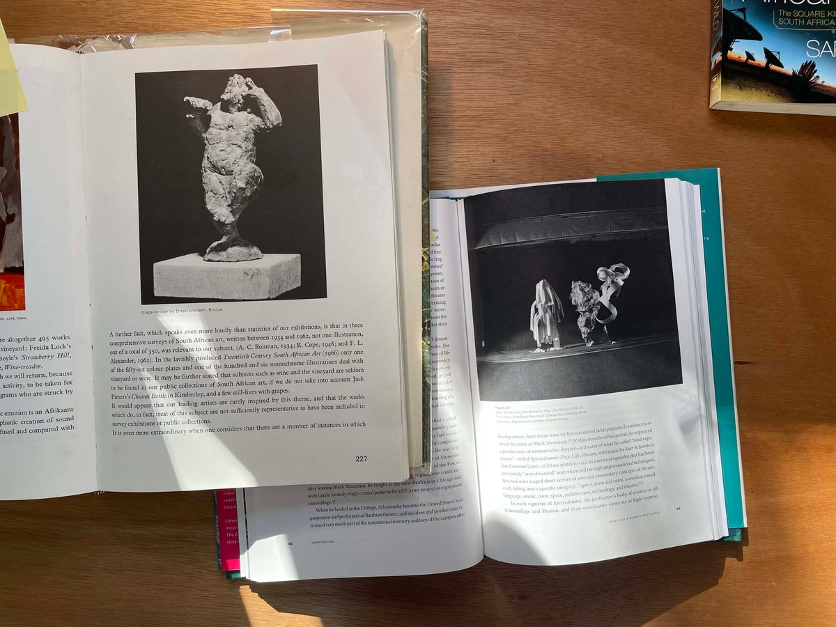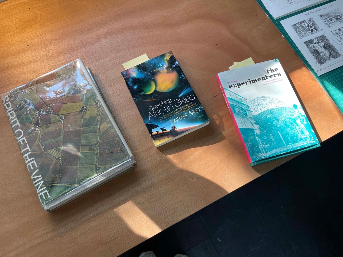 Daniel Malan’s time at the retreat is spent exploring the aesthetics and associations of library making, creating a game for the communal reading and sharing of books. He is uniquely positioned at Three Bones, having been tasked with selecting the two fellow artists who join him there (Jody Brand and Callan Grecia) in his role as curator of books and the store at A4. Malan also curated the Three Bones’ Library for Tarik Yildirim, and he chose to begin with these books as his material while in the studio, arranging books by colour and exploring more esoteric systems of categorisation by way of thought experiments and serendipity, such as shuffling cards. He soon realised he needed to come up with rules to this approach. Conversations with his fellow residents about their particular concerns with land, memory and dispossession (Jody Brand) and time spent with found data as idea generator toward abstraction (Callan Grecia) sparked thinking about “books that are closest to here, and books that are furthest away.” A book about the history of Groot Constantia, the retreat’s next-door neighbour, proved closest; a book about space mapping the farthest distance. Between those two coordinates, Malan placed a book that seemed to carry visual resonances of both. “What is the role of a librarian?” he asked. “It could be similar to the role performed by a page number in a book. A librarian directs people to things, to the page.” Idiosyncratically sourcing image and text proved a way of orientating his artistic practice in the studio, coordinating his role as book collector with his identity as an artist. Leveraging the artwork’s capacity to make information present to the senses, while slyly alluding to absences, he restages the act of mimicry as instructional.