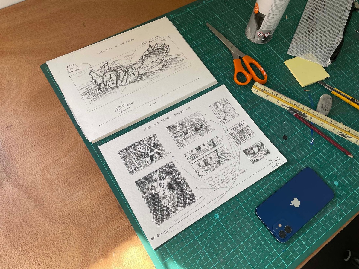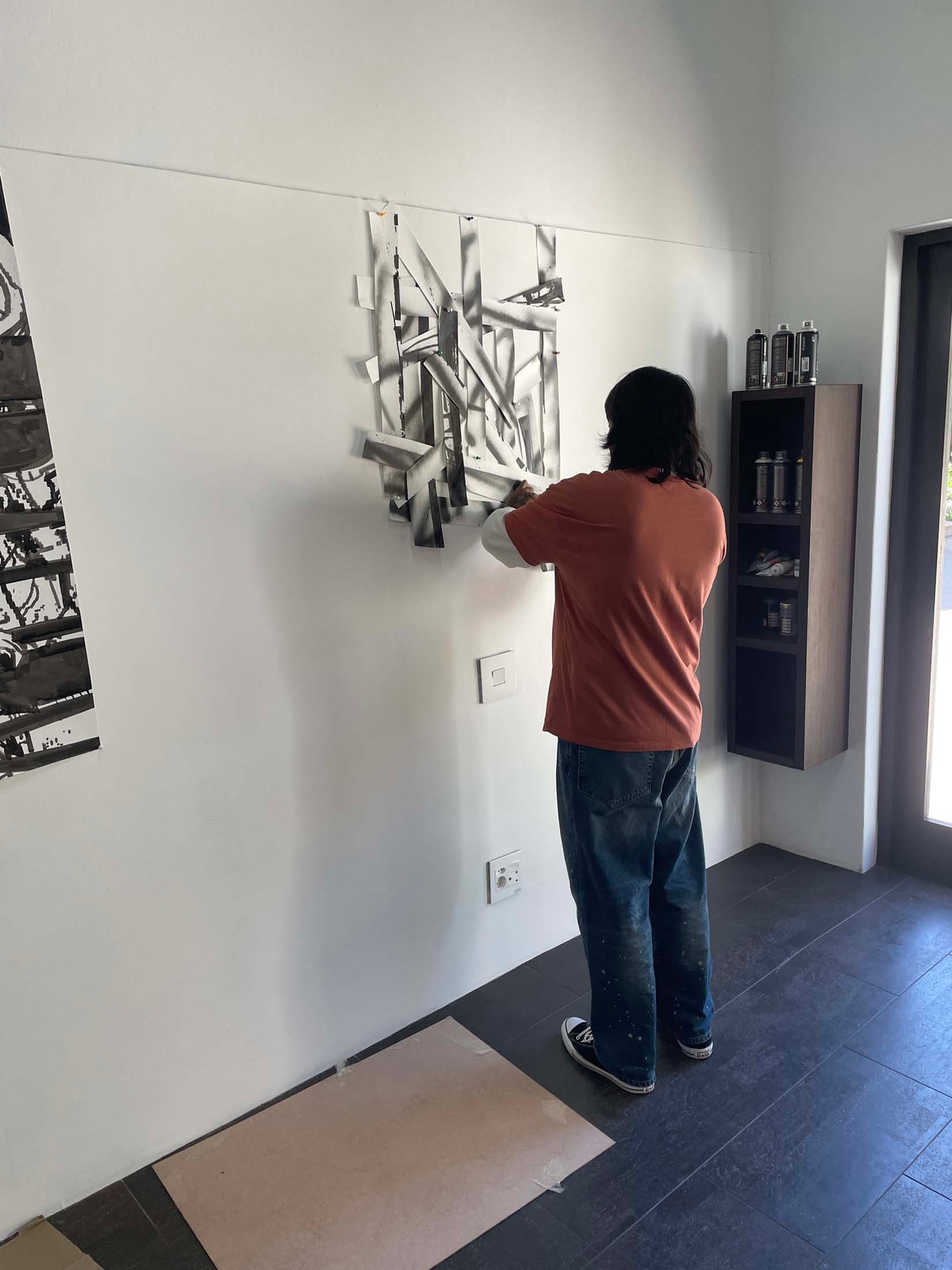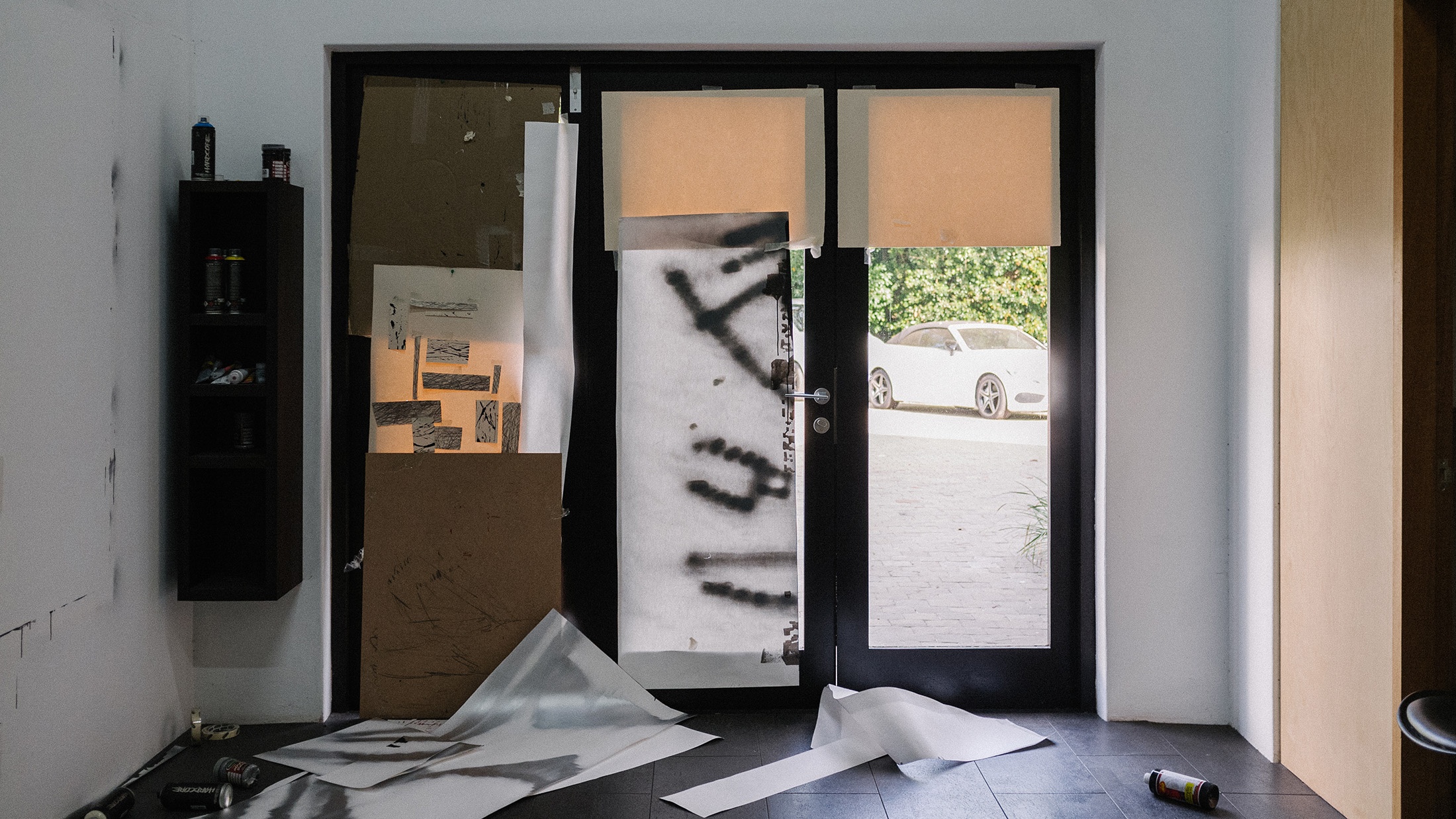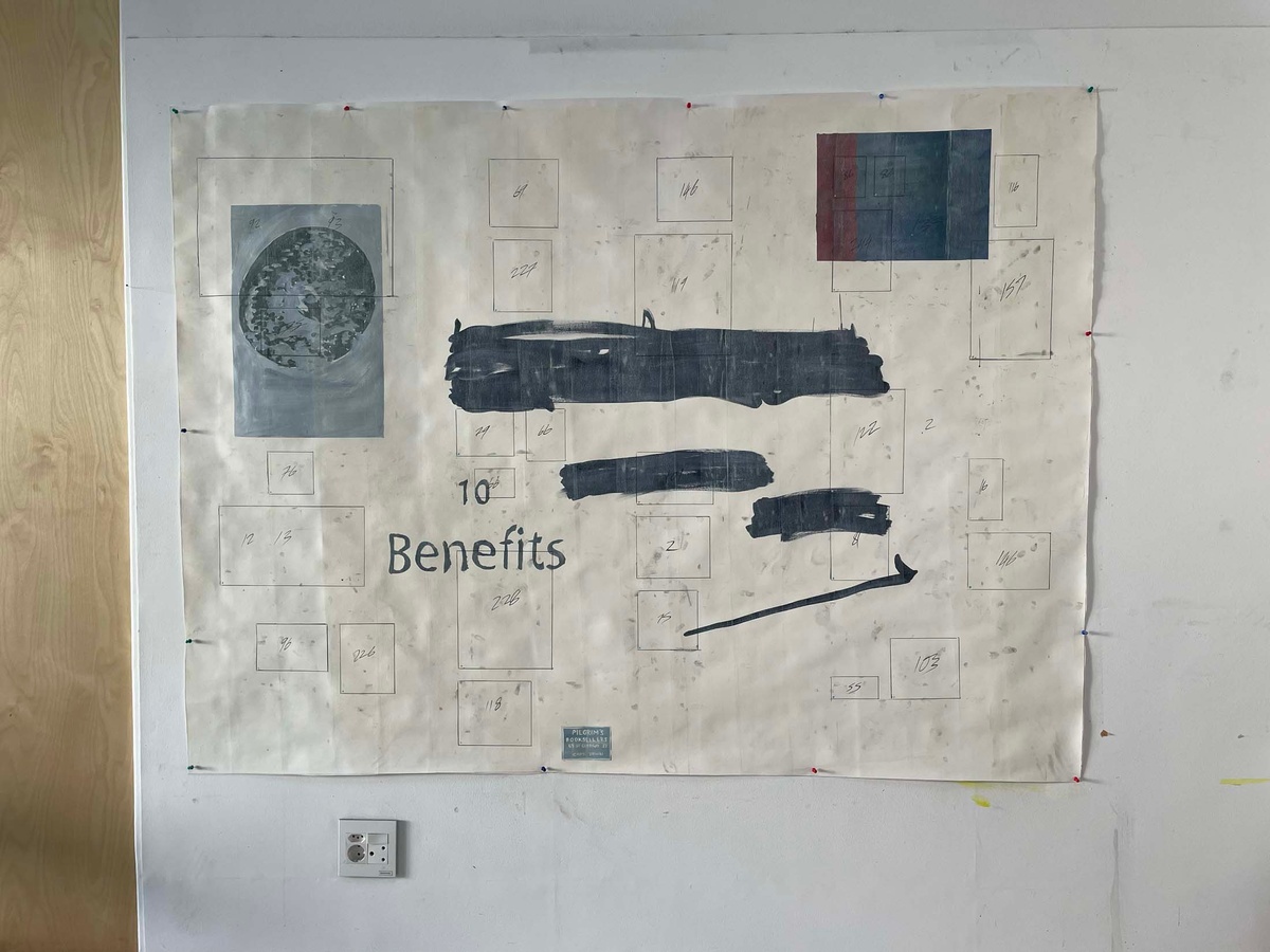 Daniel Malan’s time at the retreat is spent exploring the aesthetics and associations of library making, creating a game for the communal reading and sharing of books. He is uniquely positioned at Three Bones, having been tasked with selecting the two fellow artists who join him there (Jody Brand and Callan Grecia) in his role as curator of books and the store at A4. Malan also curated the Three Bones’ Library for Tarik Yildirim, and he chose to begin with these books as his material while in the studio, arranging books by colour and exploring more esoteric systems of categorisation by way of thought experiments and serendipity, such as shuffling cards. He soon realised he needed to come up with rules to this approach. Conversations with his fellow residents about their particular concerns with land, memory and dispossession (Jody Brand) and time spent with found data as idea generator toward abstraction (Callan Grecia) sparked thinking about “books that are closest to here, and books that are furthest away.” A book about the history of Groot Constantia, the retreat’s next-door neighbour, proved closest; a book about space mapping the farthest distance. Between those two coordinates, Malan placed a book that seemed to carry visual resonances of both. “What is the role of a librarian?” he asked. “It could be similar to the role performed by a page number in a book. A librarian directs people to things, to the page.” Idiosyncratically sourcing image and text proved a way of orientating his artistic practice in the studio, coordinating his role as book collector with his identity as an artist. Leveraging the artwork’s capacity to make information present to the senses, while slyly alluding to absences, he restages the act of mimicry as instructional.