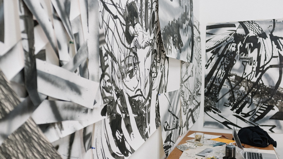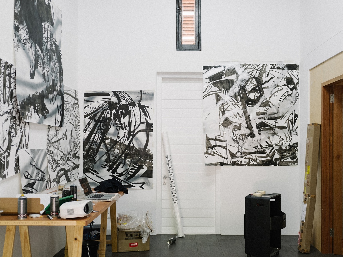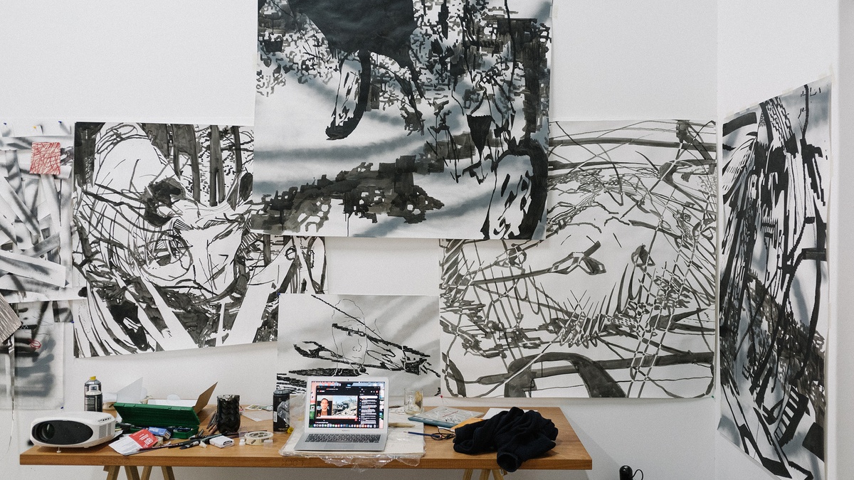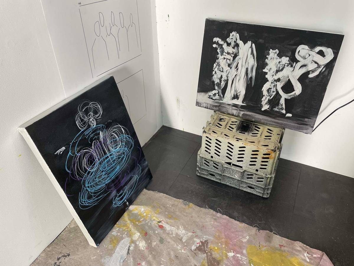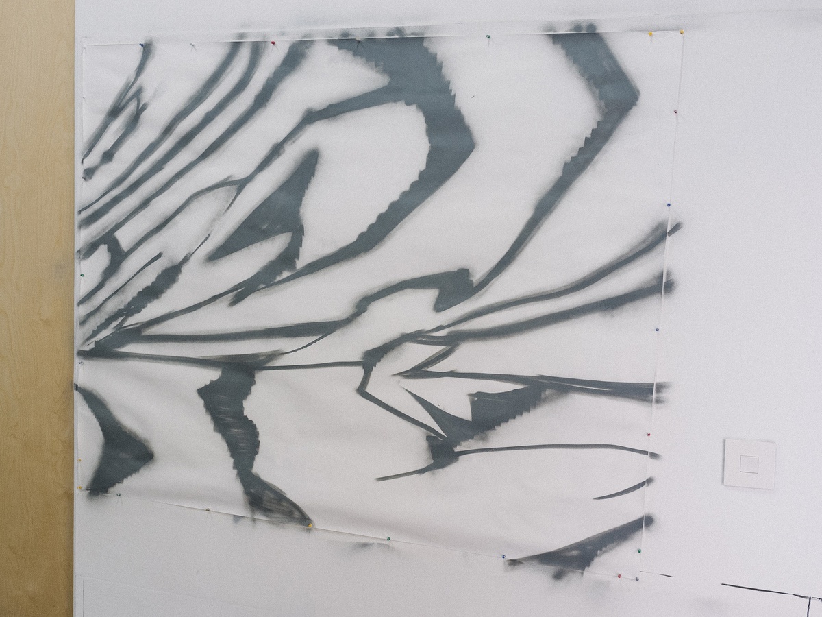 Revisiting previous experiments with formal composition and a monochromatic palette, Callan Grecia’s abstractions find their source in “too much time spent on the internet.” Found digital images are ‘crushed’ by the artist. Rendered indecipherable from their origin, they act as ‘found ideas’; the artist working with the plethora of already available online material as a generator to thinking. In an age of information overload, digital fatigue, and AI bewilderment, the artist’s familiarity and comfort working with data (where he wonders after, for example, capture codes as a tool for empathy) may offer a panacea. Do these compositions, reminiscent of Futurist experiments, afford an alternative insight into the profound ambivalence surrounding current expectations of and emotional investments in networked media?