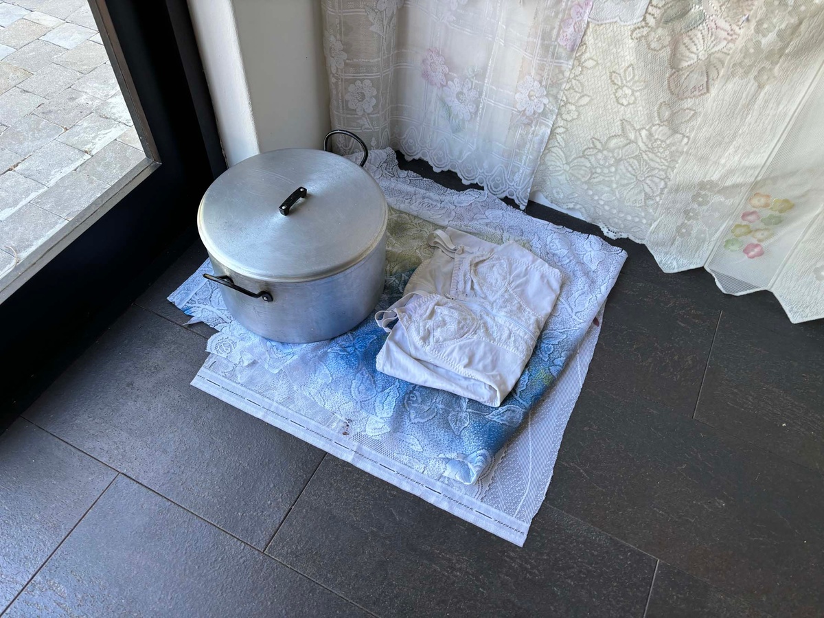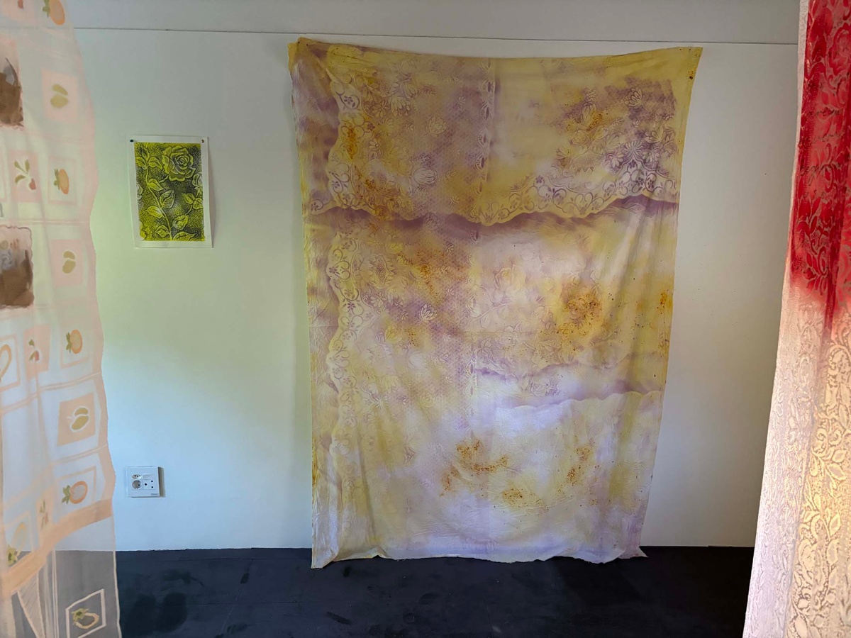 Where forced removals legislated entire communities as landless, Brand calls on her childhood memories of camping with her family in Kleinmond, of entire summers spent out in the land, as an act of culture building that evidences being of a place, embodying its knowledge and traditions. And yet, the artist is keenly aware of the threats of continued dispossession that face coloured peoples to the present day. In the small fishing village of Kleinmond where those childhood summers were spent, the fishing community is increasingly threatened by quotas and exports. Foodstuffs like perlemoen (abalone) are delicacies for an export market, disrupting the sustained relationship communities have held with the oceans from which they subsist. “How do you talk about something difficult?” Lemeeze Davids asked, suggesting that Brand’s work offers a sensory encounter as a possible answer, where pickled and aromatic foodstuffs as dye on homemade fabrics touch environmental, political and personal concerns.
