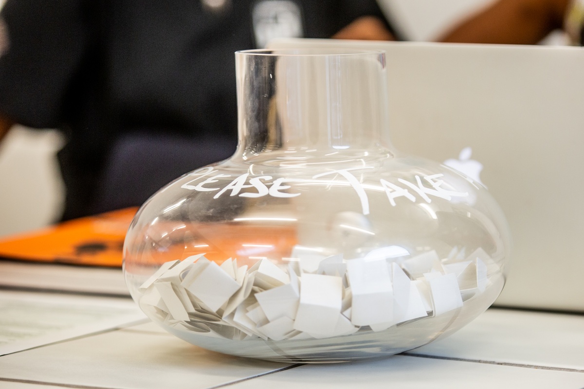 On arrival, participants are invited to pick a number linked to a FAQ out of a large bowl.