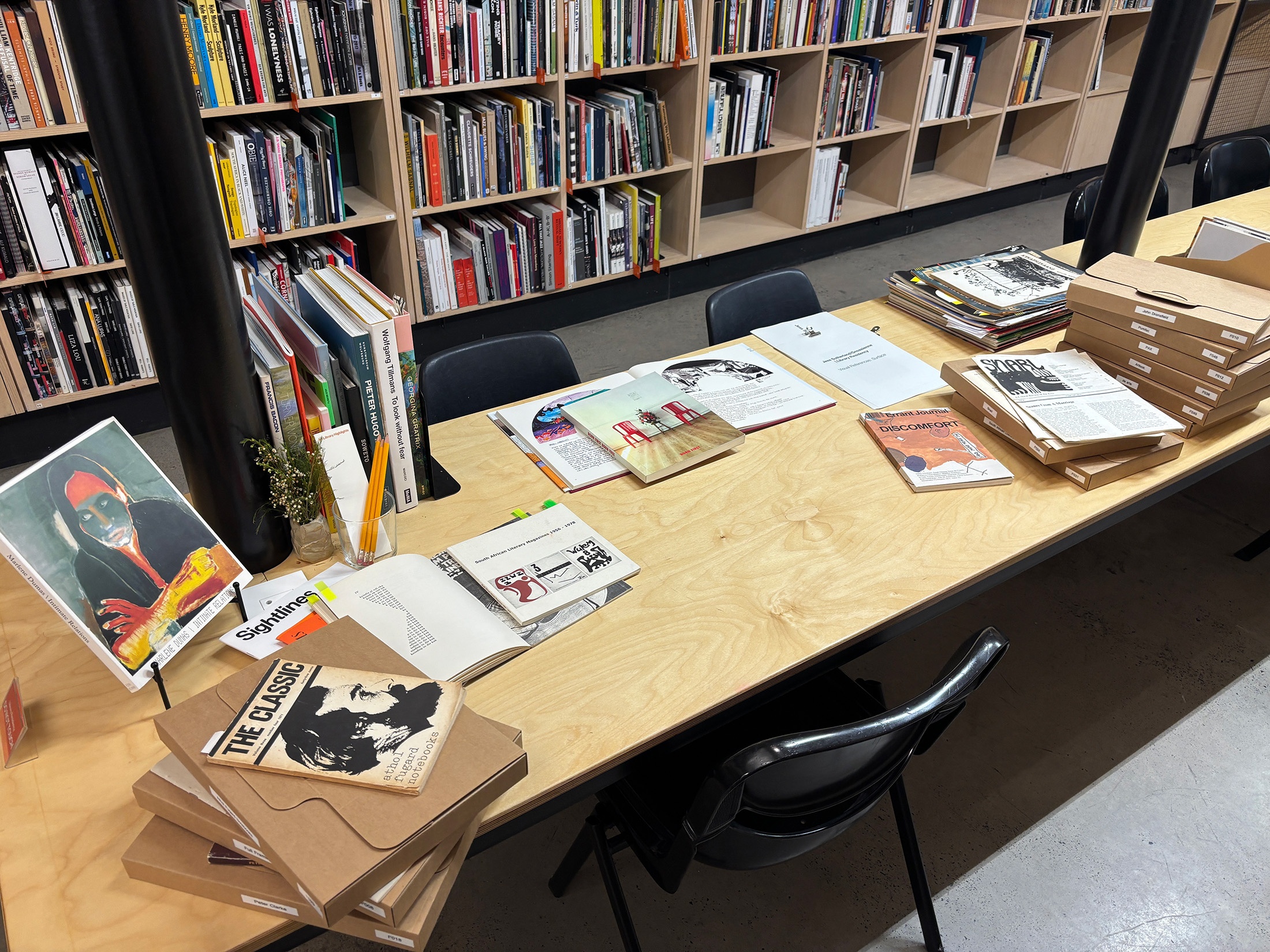 The Library residency offers practitioners time and space to pursue their particular research queries and interests, working in and among our expansive collection of publications and miscellaneous printed matter. Residents have access to all our books and ephemera, the collaborative assistance of Daniel Malan in the role of librarian, and the support of the curatorial team over a two-week period. A4 is interested in sharing modes of research and investigation with our community, exploring ways of showing practitioners' process. We encourage residents to ‘think out loud’ via marginalia, recording their meanderings through books, essays, excerpts, and images, making the often opaque work of research visible. Towards the residency's end, practitioners are invited to develop a small programming component or engagement with the library's users and invited guests.