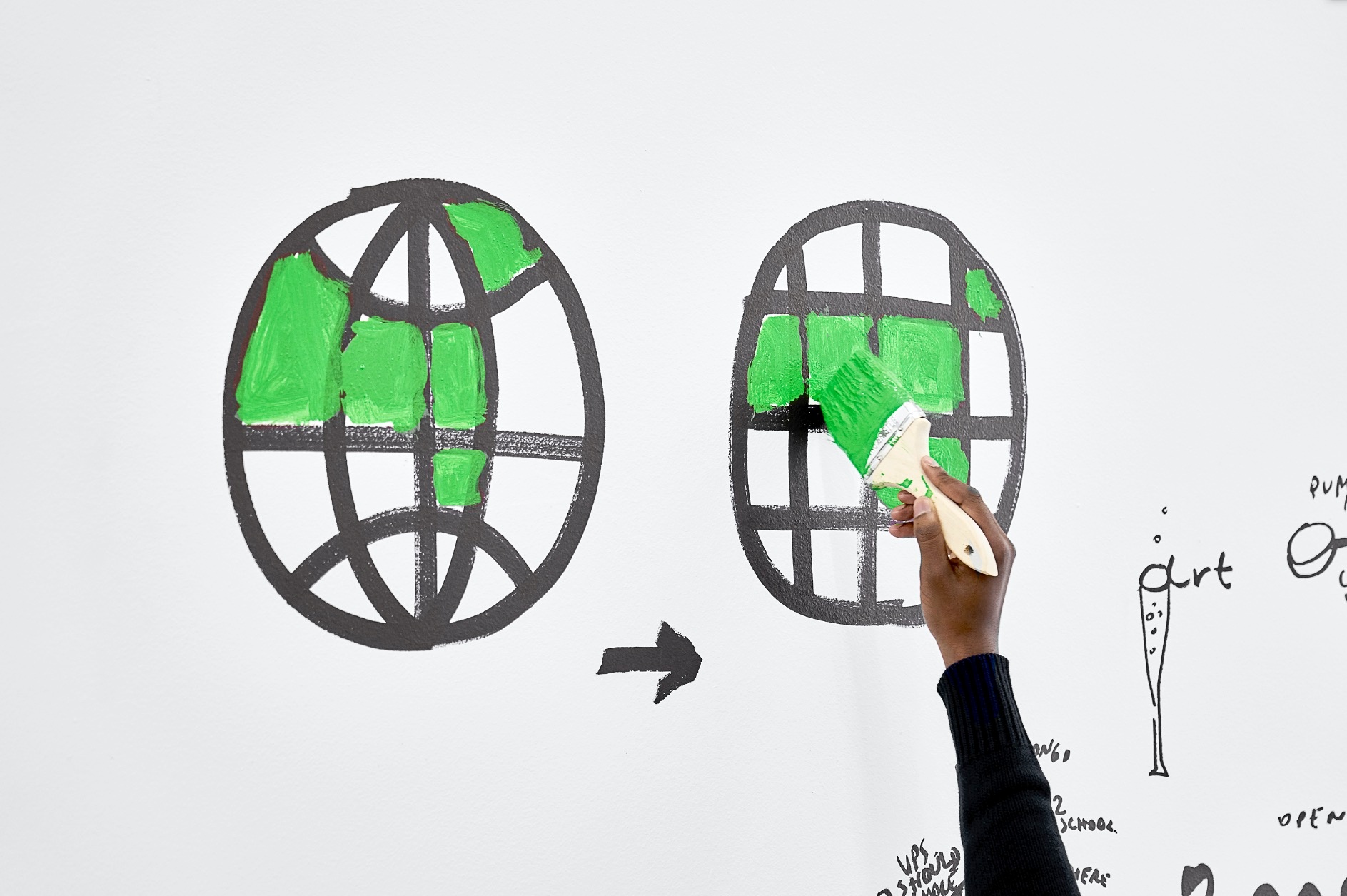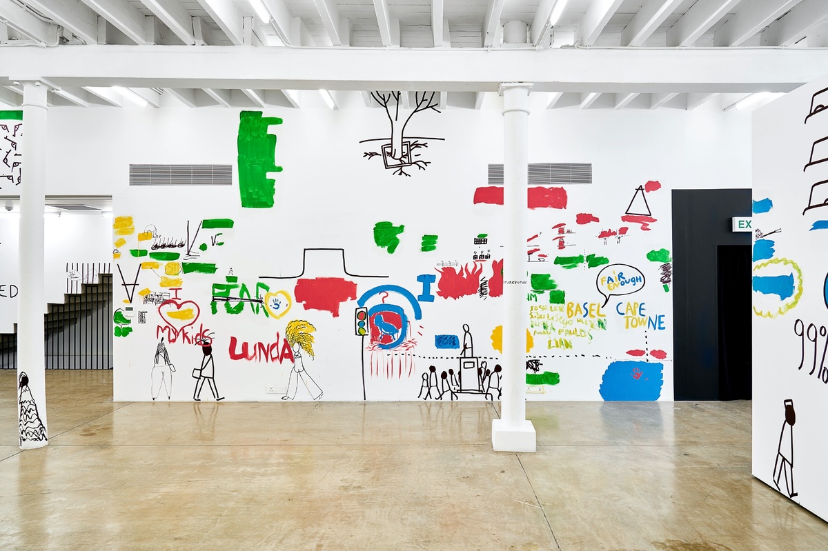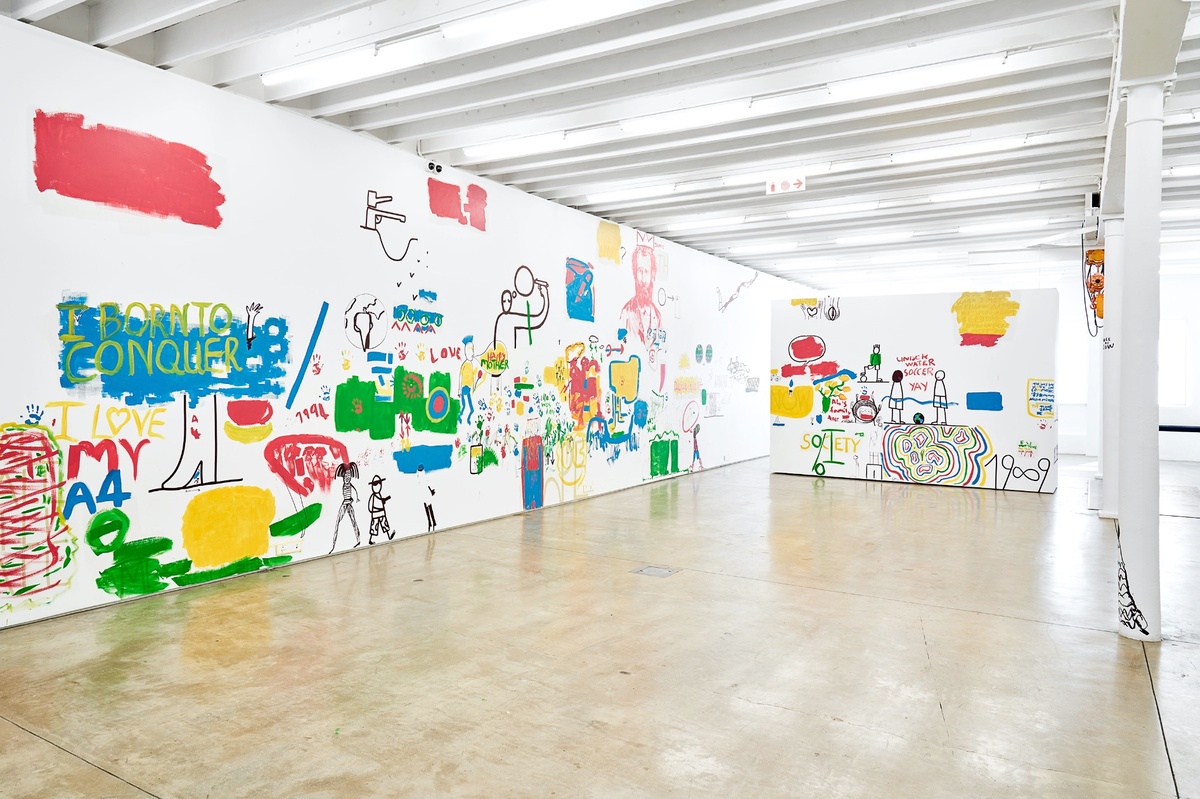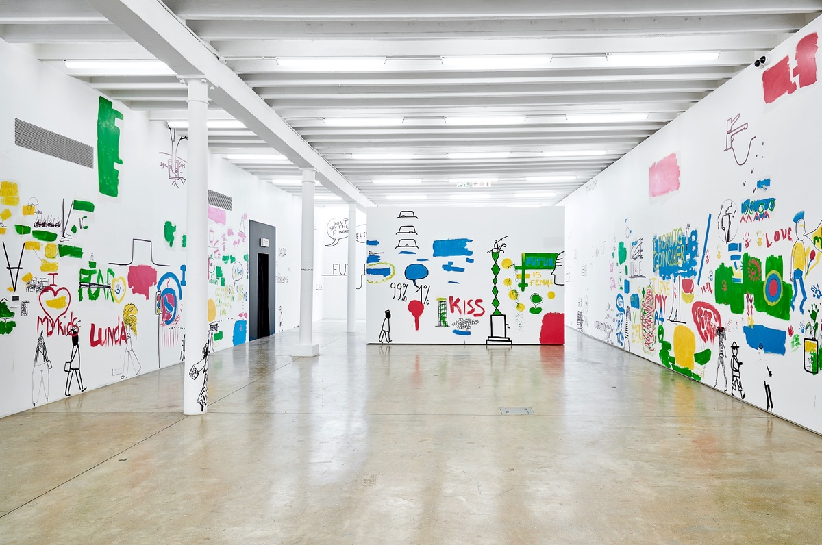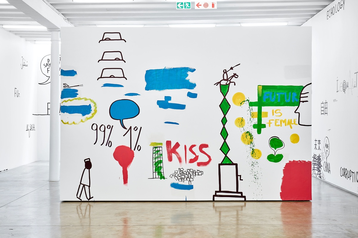 Dan Perjovschi’s projects involve drawing directly onto the walls of institutions around the world. Following the exhibitions, the drawings are erased. This typically involves painting over the drawings and scraping the walls. Perjovschi collects photos of the erasure process – treating it as a component of the greater project – itself concerned with the right to speak freely and a defence against censorship.