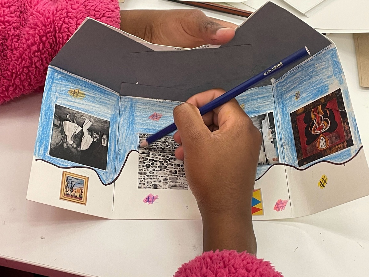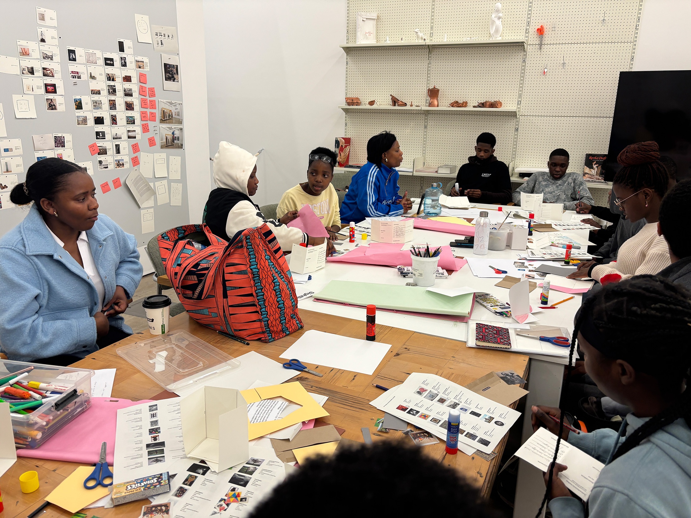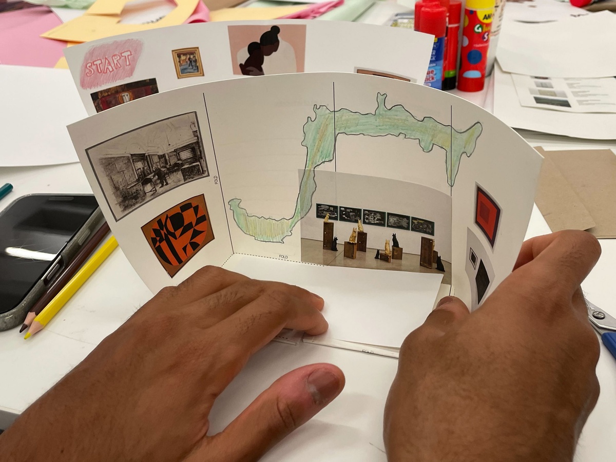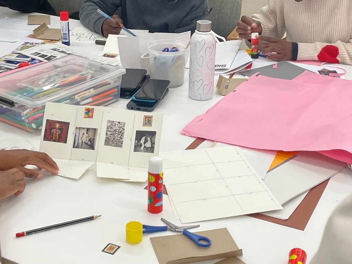 The workshop begins with learners presenting their Personal Development Plans (PDPs), developed alongside their Lalela facilitators. These plans, mapping strengths, values, and future aspirations, serve as thematic foundations for each participant’s curatorial thinking. Using a foldable template with adjustable configurations, learners build ‘dummy’ exhibition rooms and choose artworks from a selection of cut-outs, with the option to request additional ‘works’ to be printed.