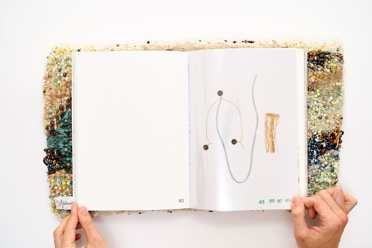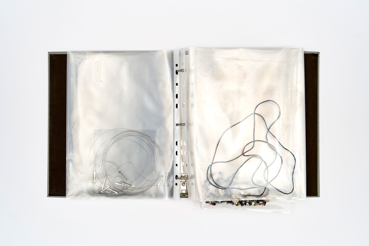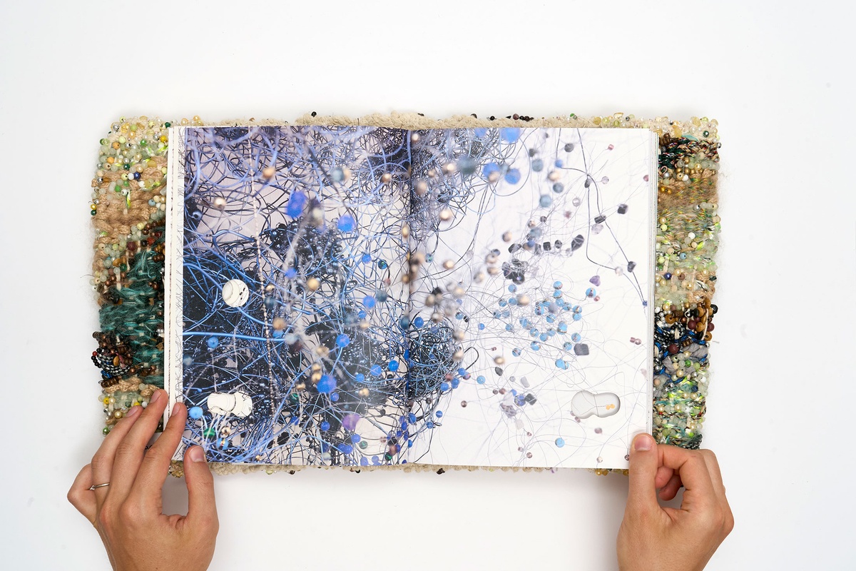 The book’s opening pages are laser-cut, revealing images of beads, thread, and wire.
