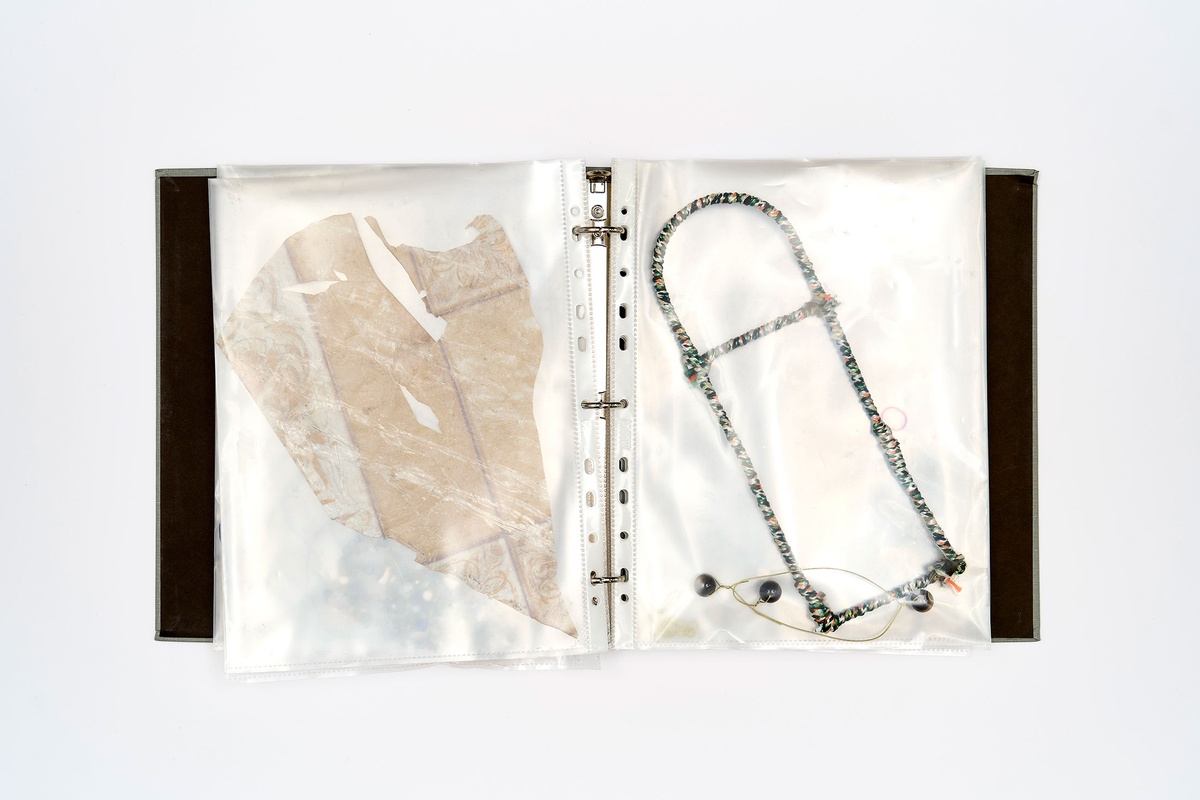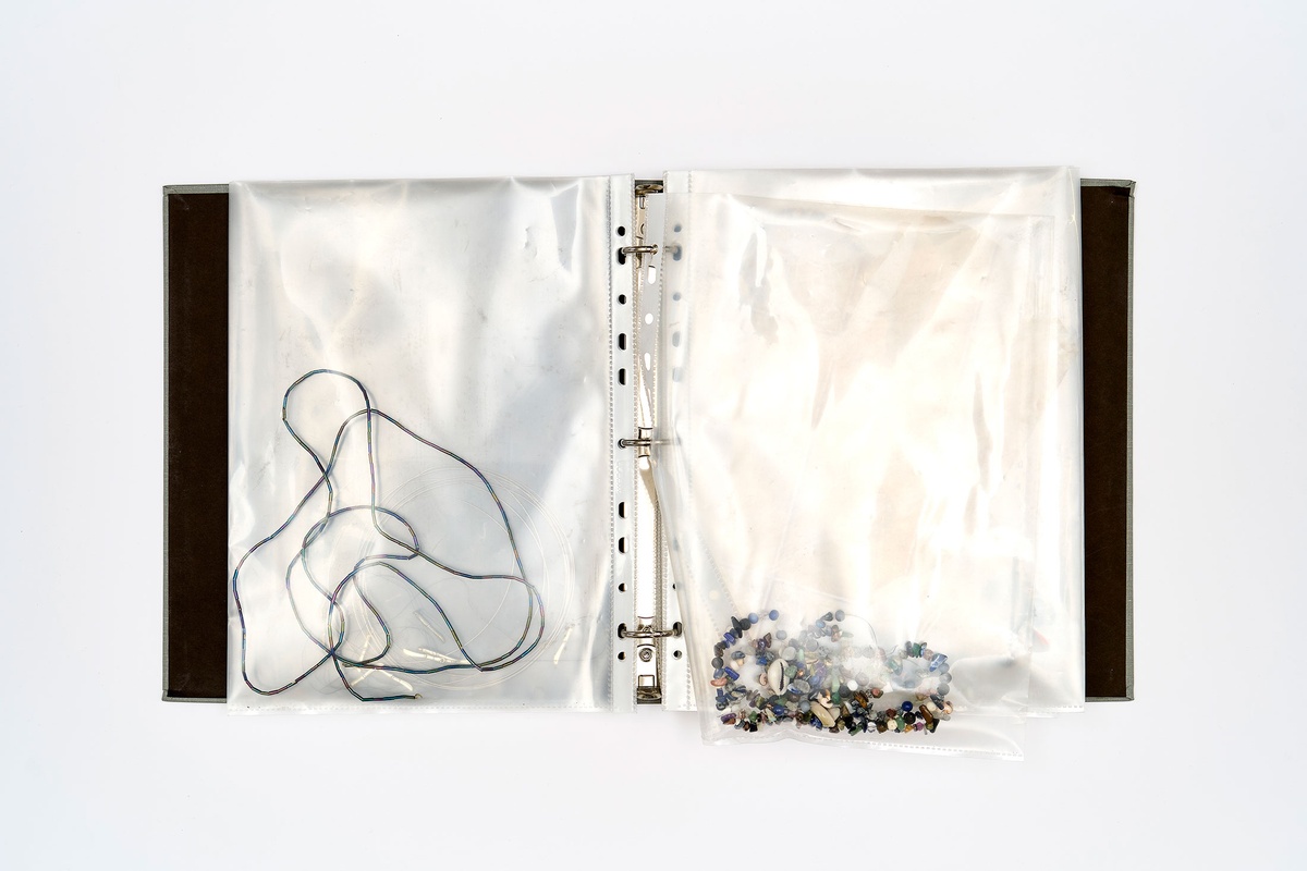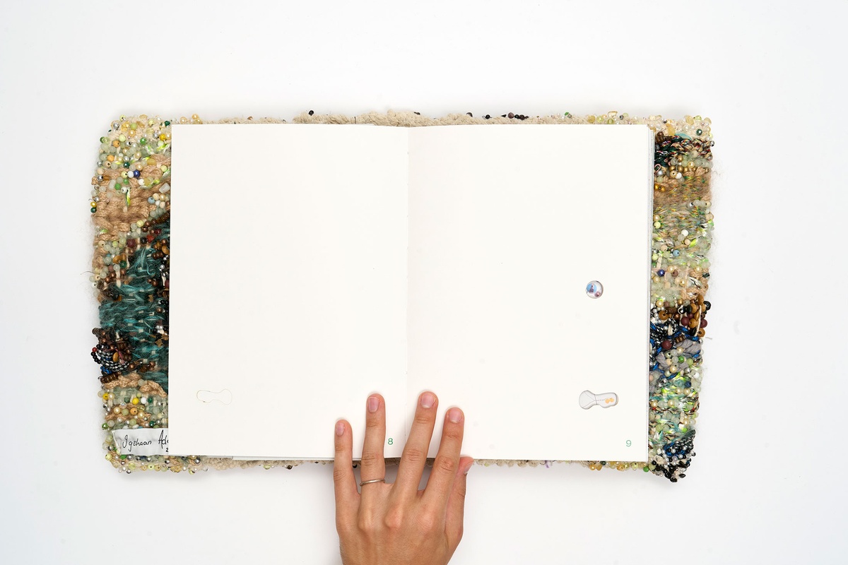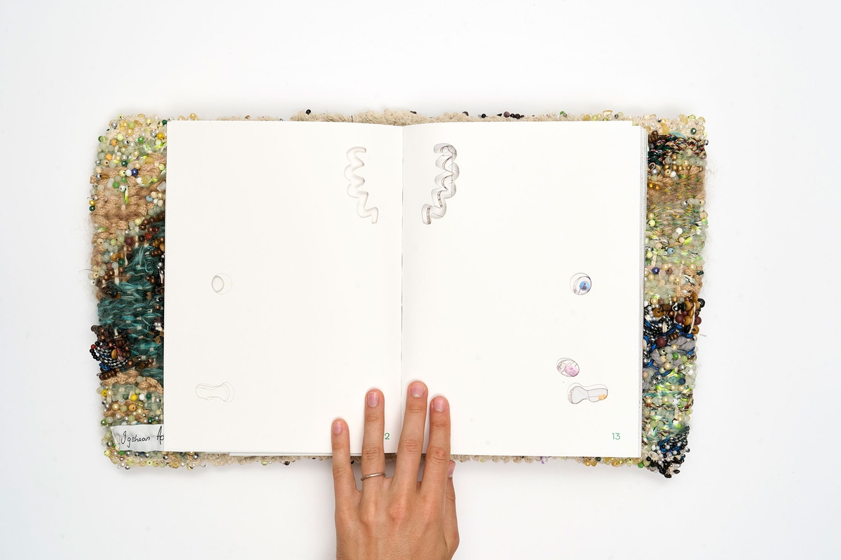 The book’s opening pages are laser-cut, revealing images of beads, thread, and wire.