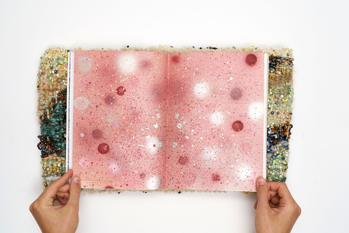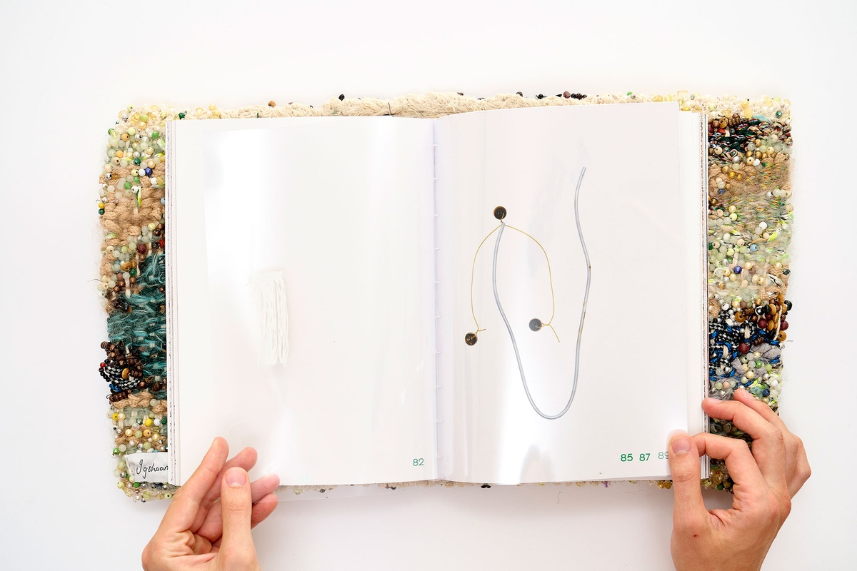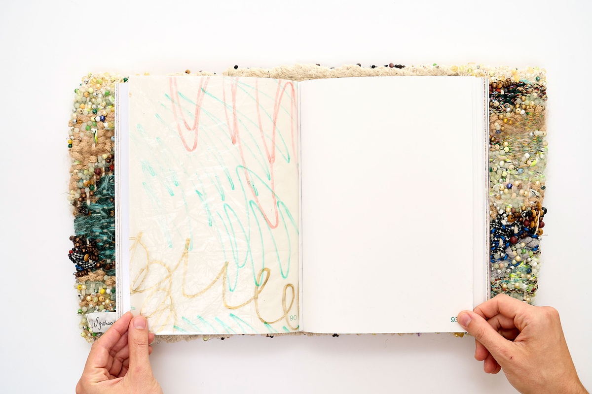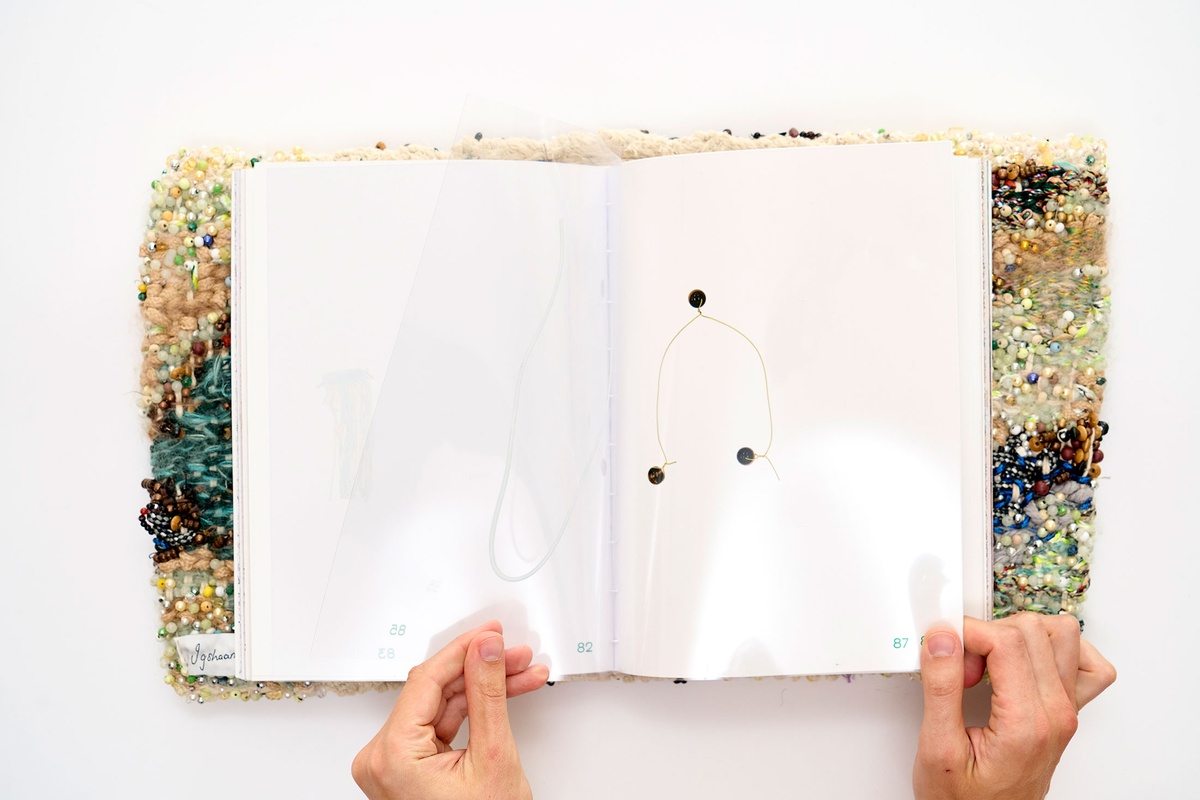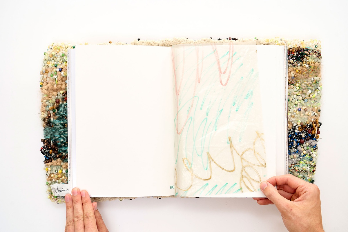 Sections of transparent acetate, UV-printed and hand-stitched into the book, register traces gathered and archived by A4’s team across the project. The artist's studio directly draw or paint onto select pages.