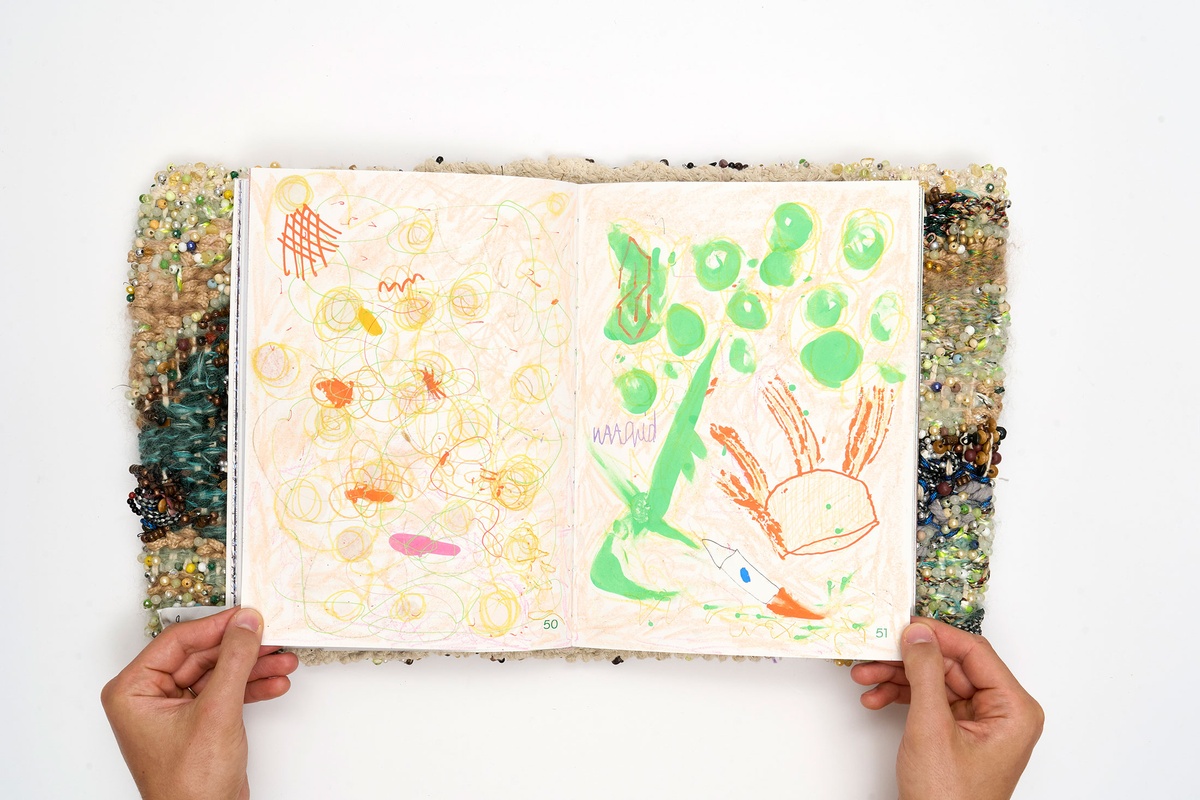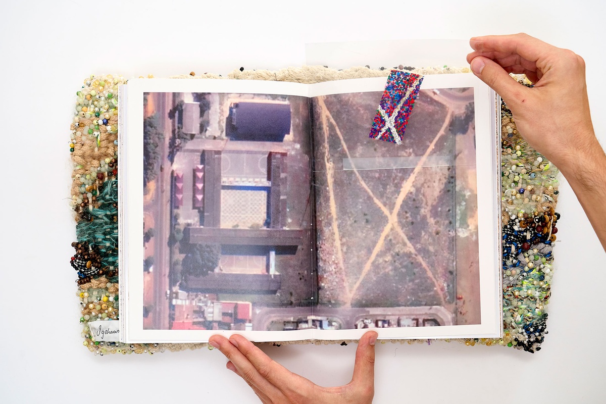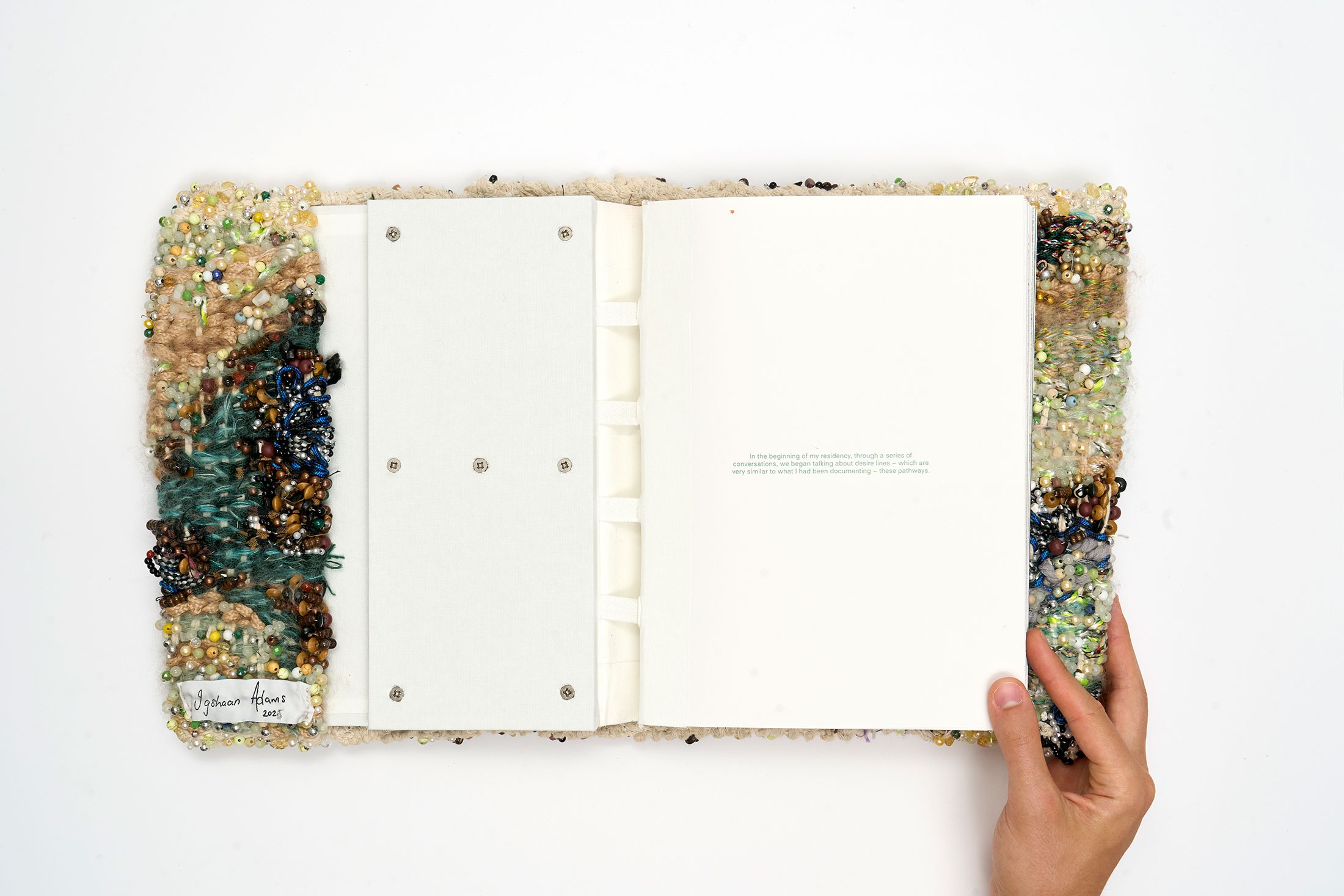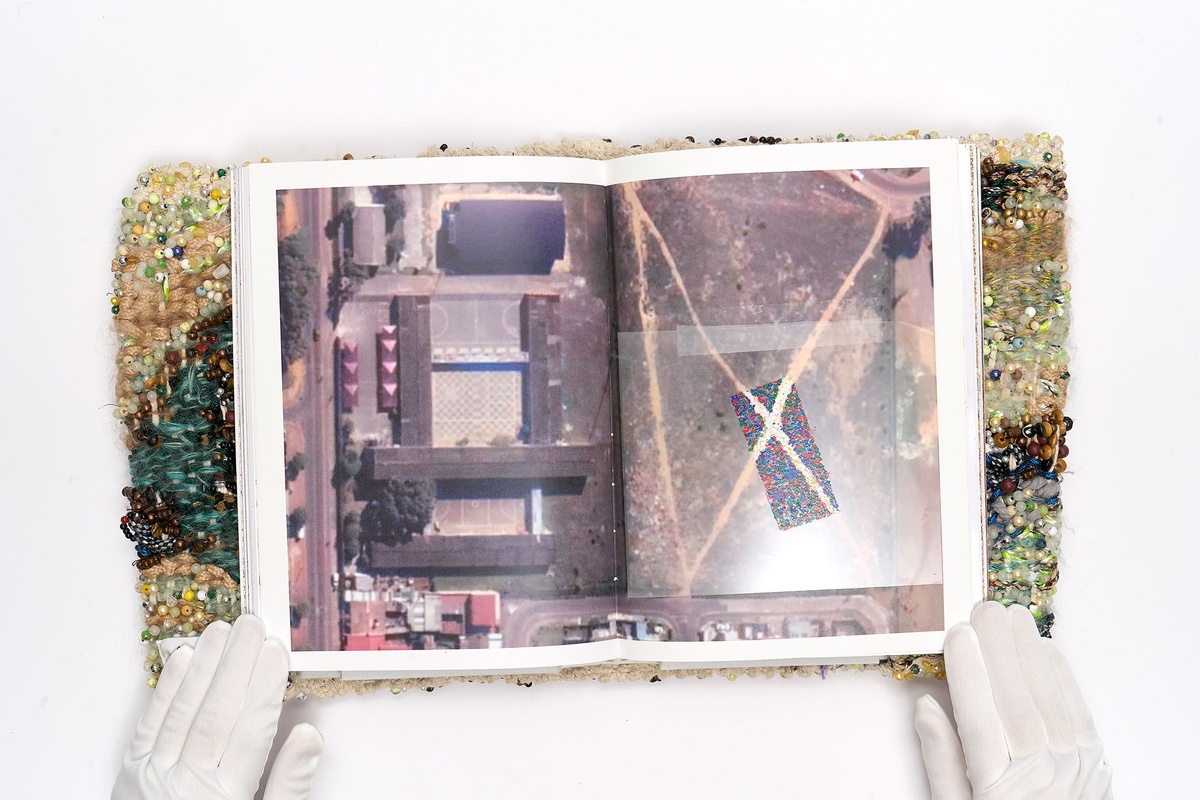 Sections of transparent acetate, UV-printed and hand-stitched into the book, register traces gathered and archived by A4’s team across the project. The artist's studio directly draw or paint onto select pages.