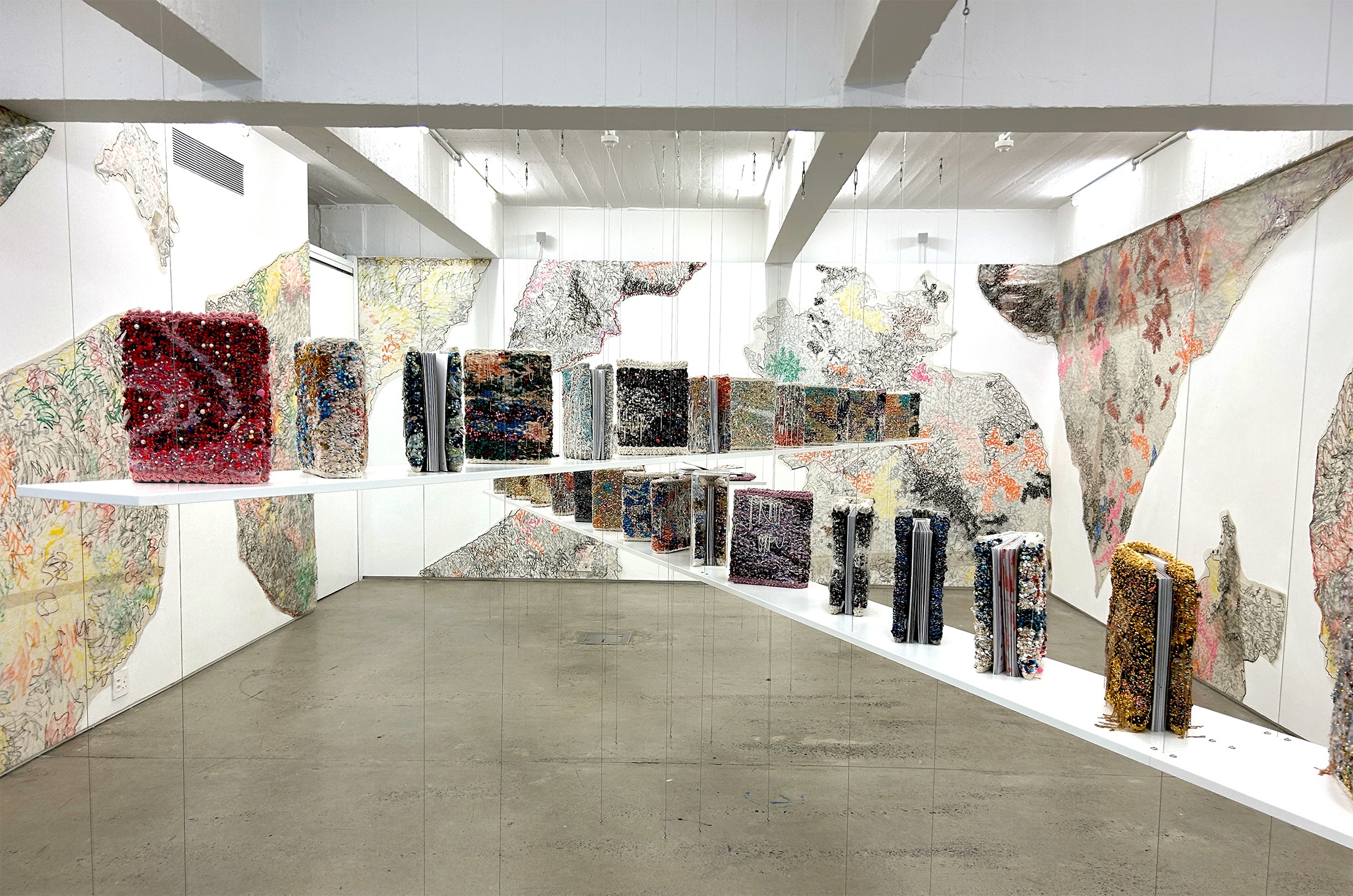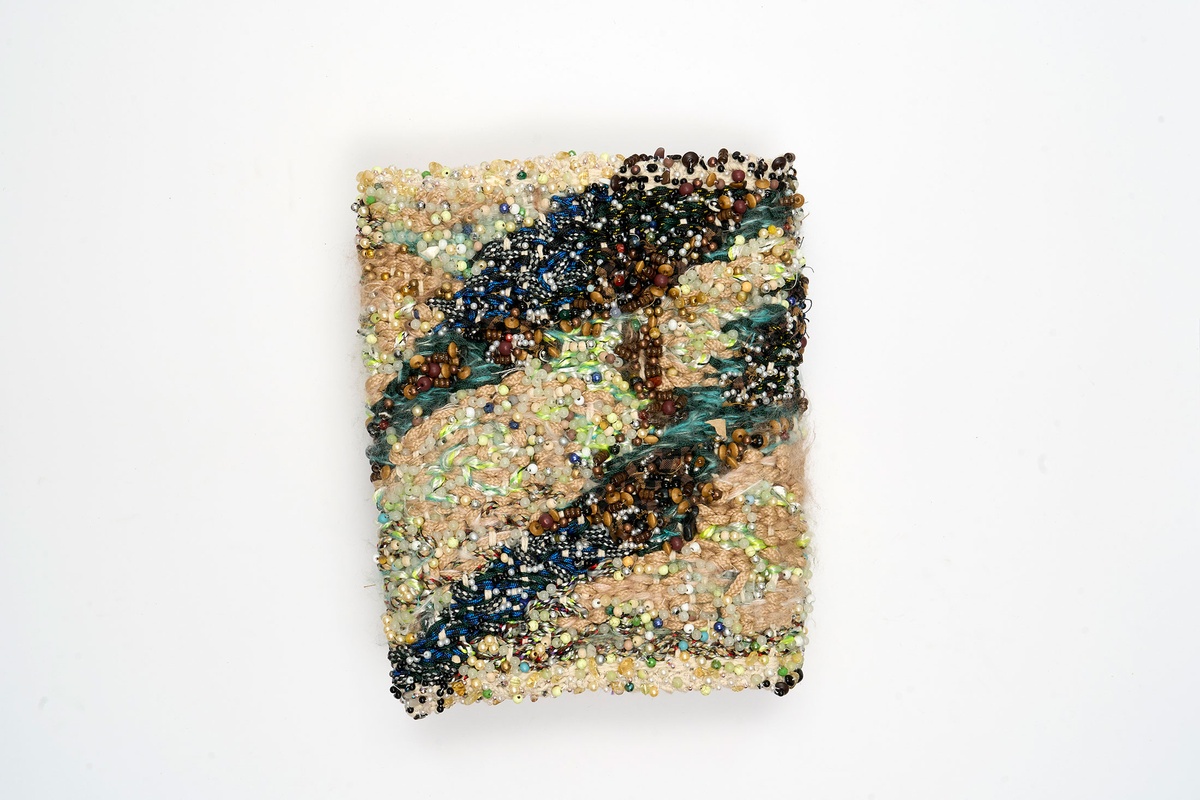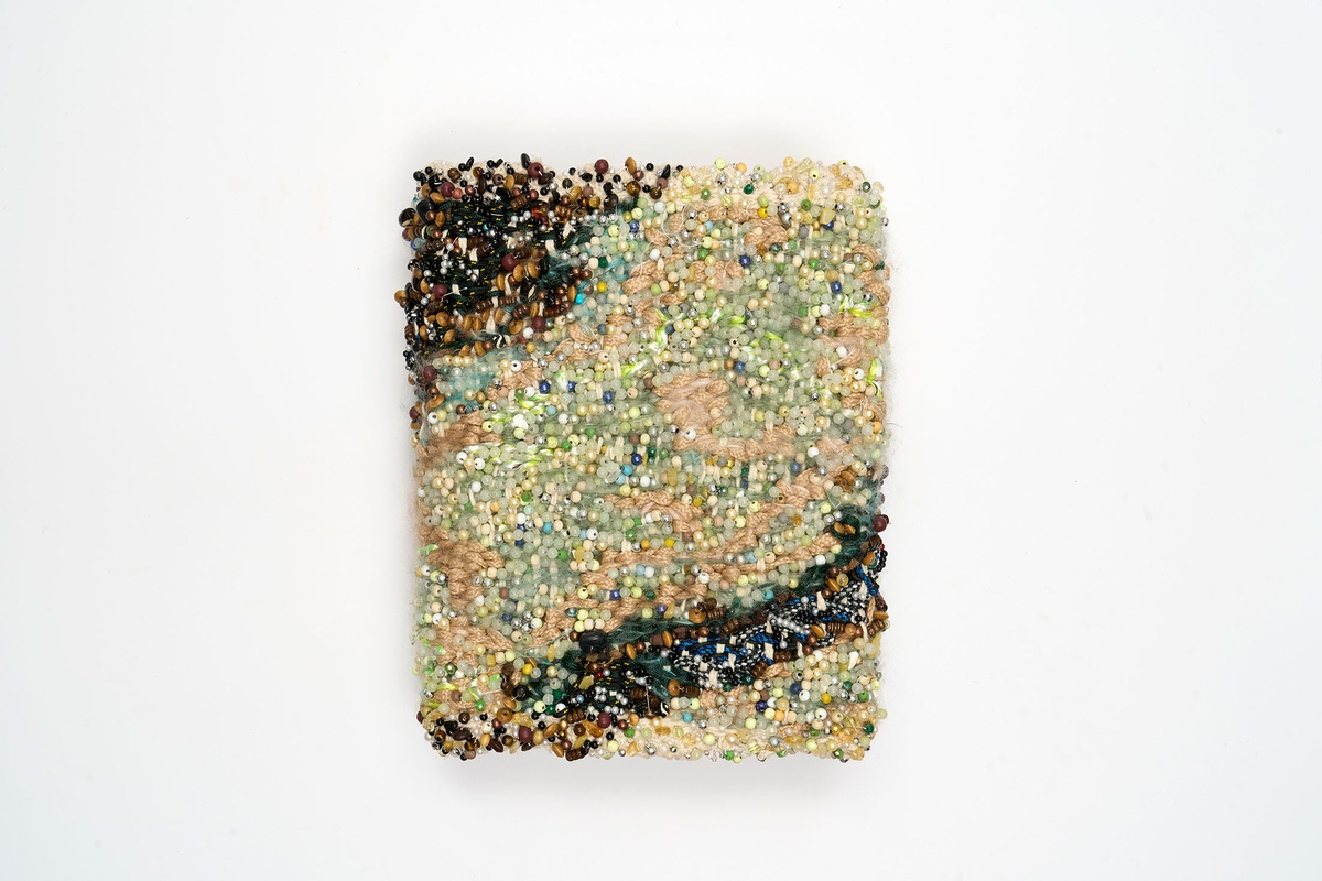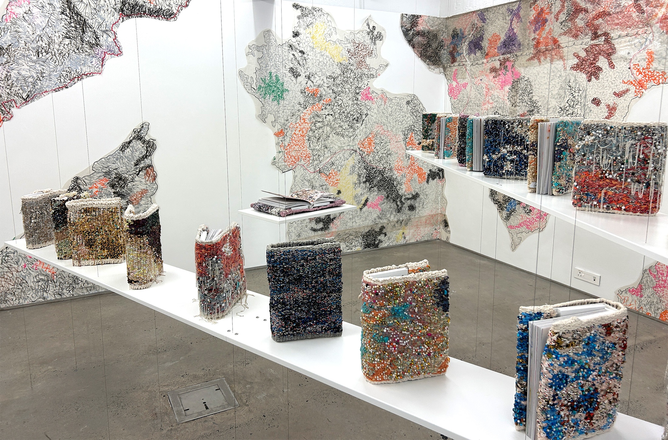 Encased in bespoke woven slipcovers, each edition of Tapyt (2024) was woven in Igshaan Adams’ Cape Town studio and directly references an artwork (those past and others propositional). Experimenting with a variety of construction methods in numerous prototypes, Adams settled on a robust design of continuous weaving across the spine and cover boards – commensurate with his intricate methods and tactile sensibility.