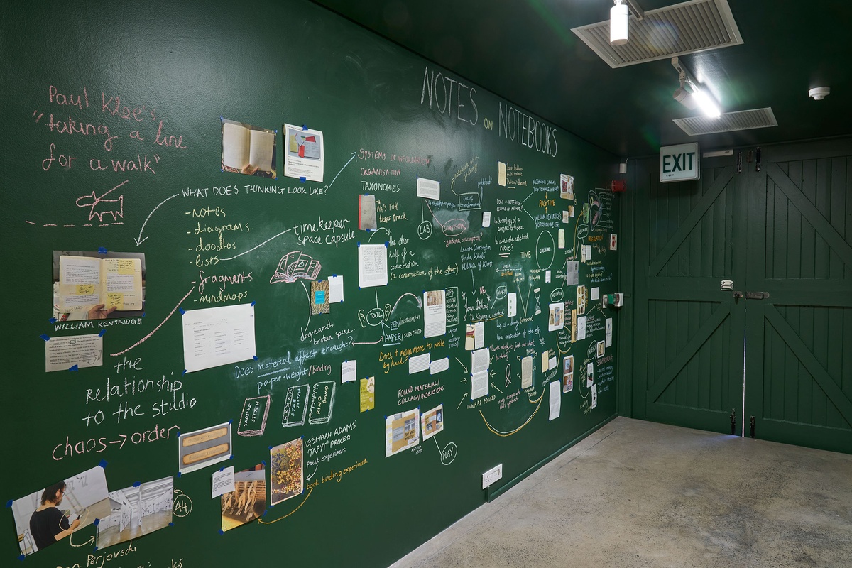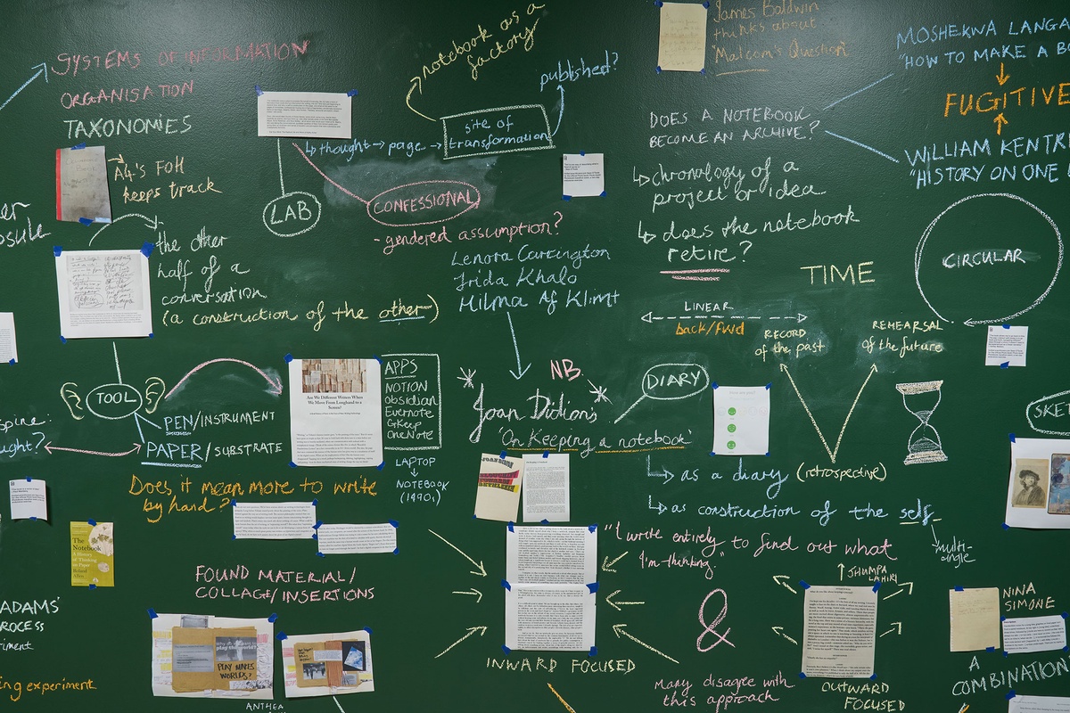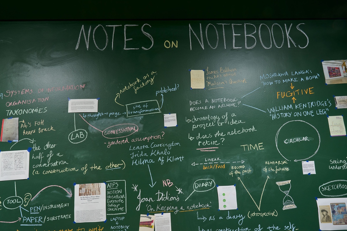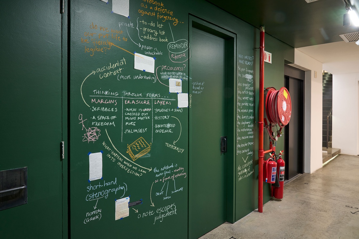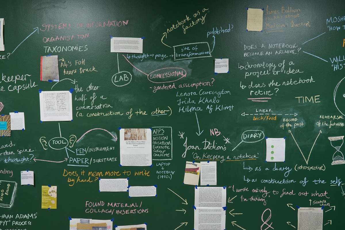 These strands of exploration – from debated diary-keeping motivations to entomology sketching methodologies; from bookbinding experiments to architecture journals – are scrawled in chalk across a floor-to-ceiling blackboard, connoting the immediacy and impermanence of a thought. In this material choice associated with learning and teaching, the notebook is examined as an ‘open studio’ where ideas straddled the boundary of public vs private.