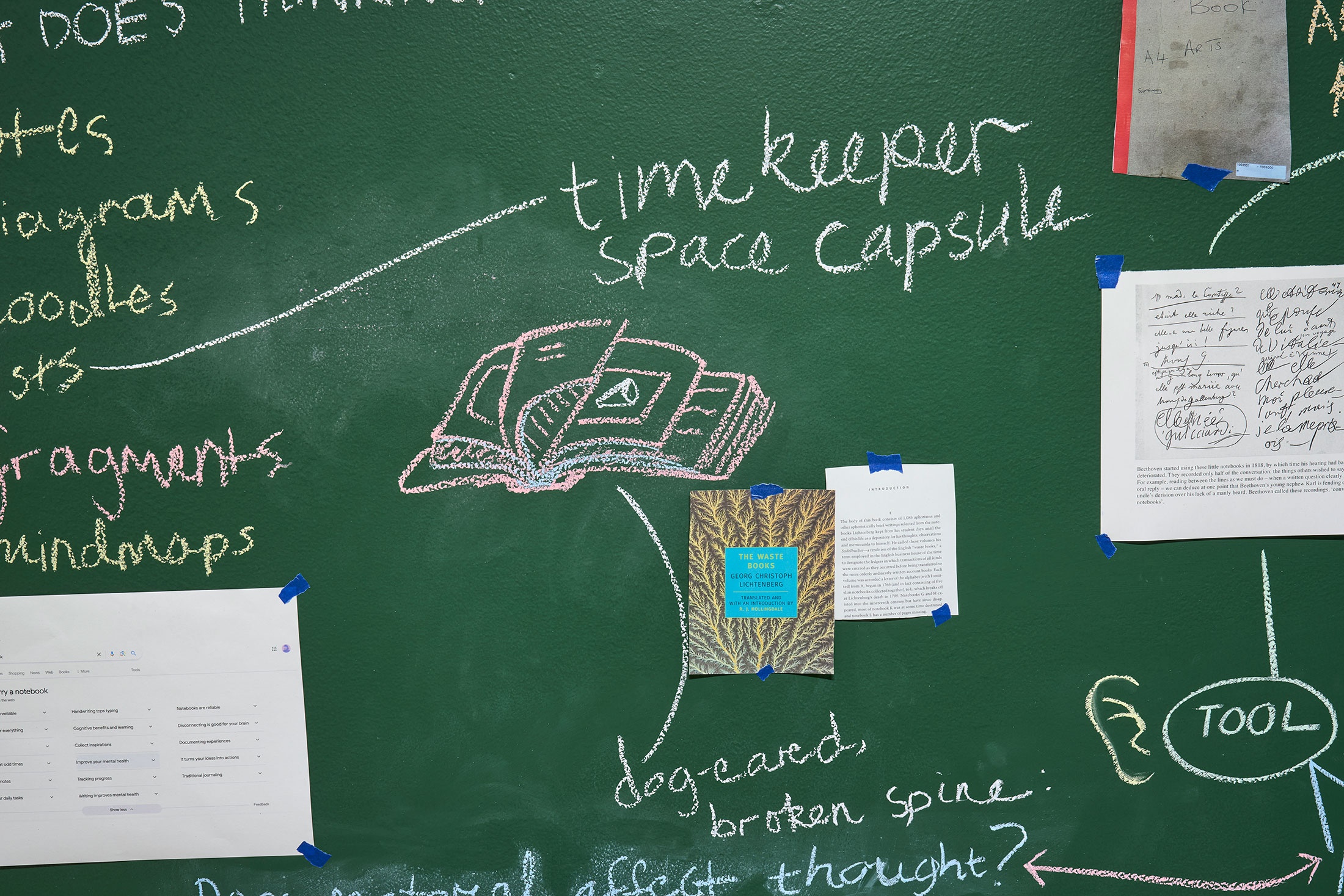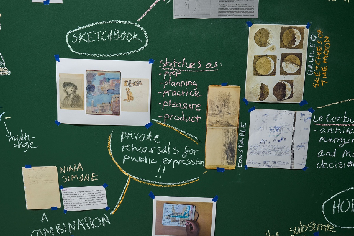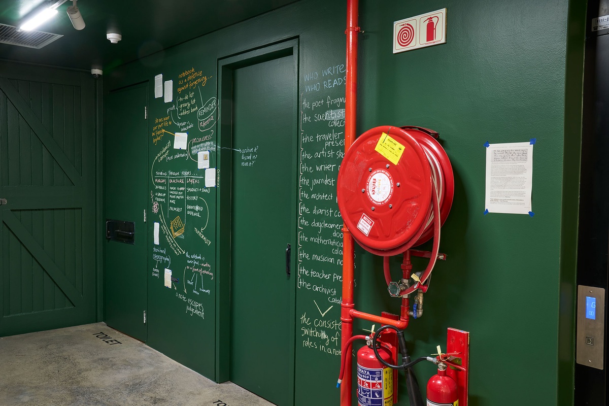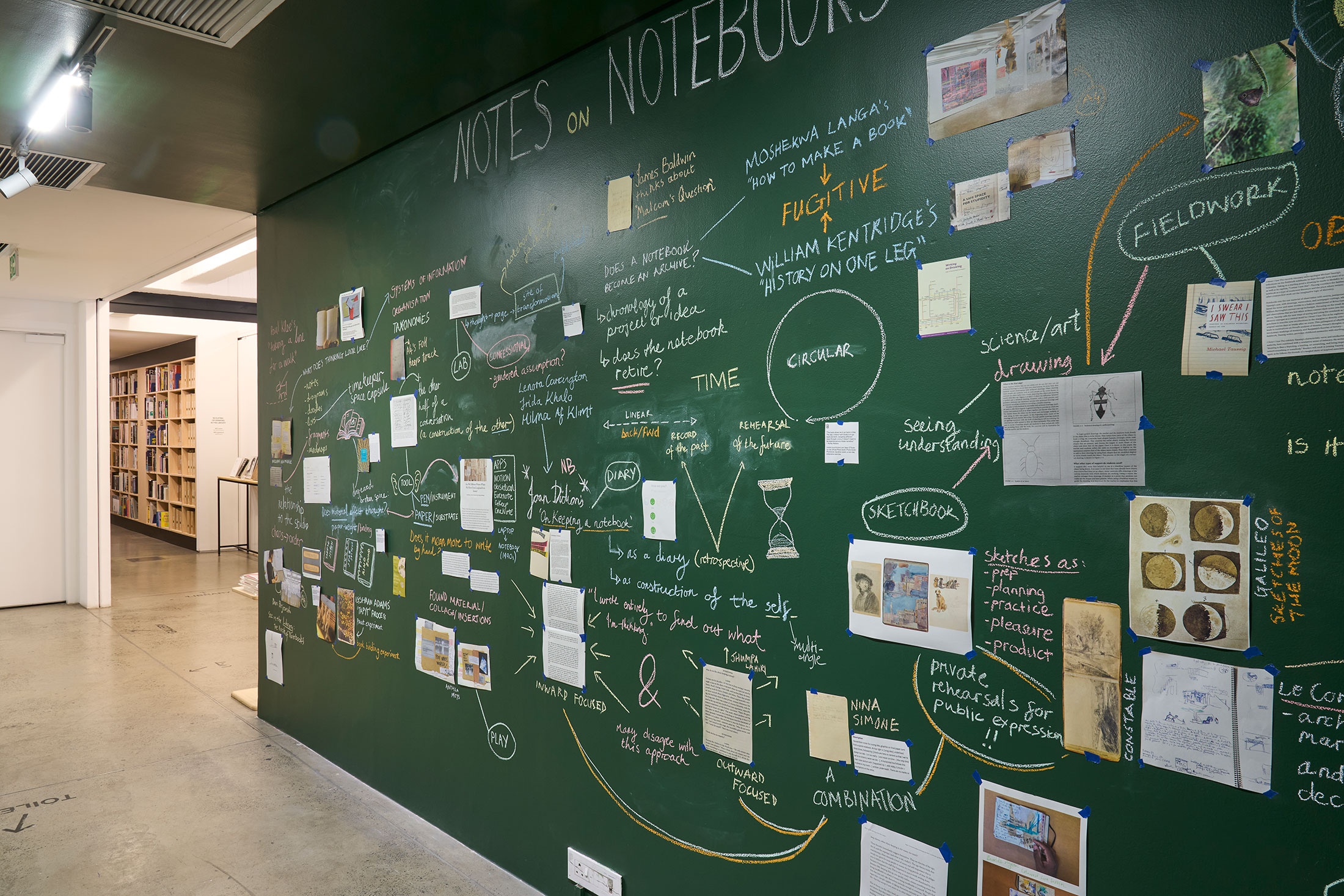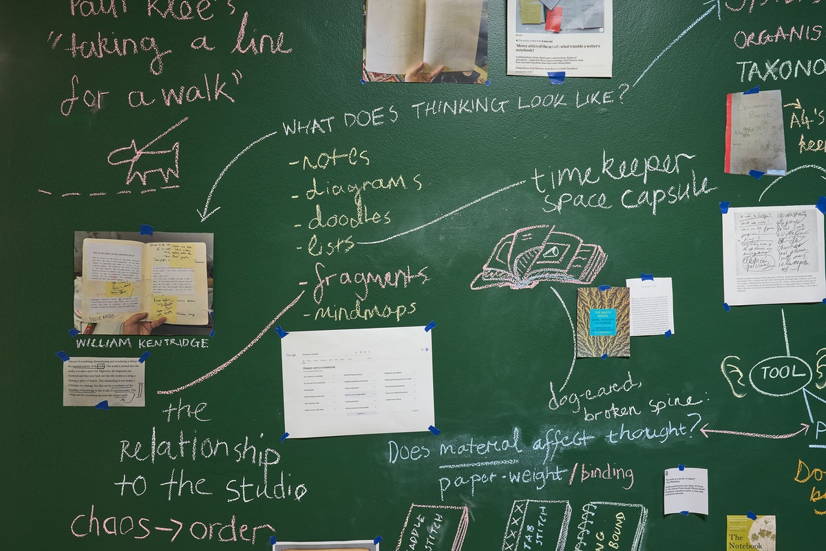 These strands of exploration – from debated diary-keeping motivations to entomology sketching methodologies; from bookbinding experiments to architecture journals – are scrawled in chalk across a floor-to-ceiling blackboard, connoting the immediacy and impermanence of a thought. In this material choice associated with learning and teaching, the notebook is examined as an ‘open studio’ where ideas straddled the boundary of public vs private.