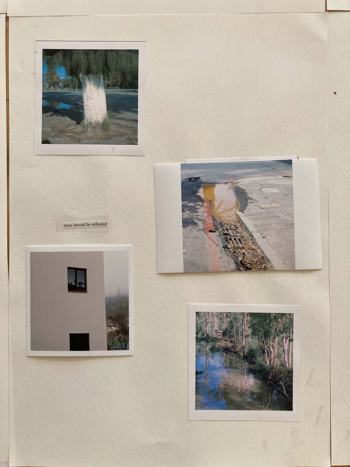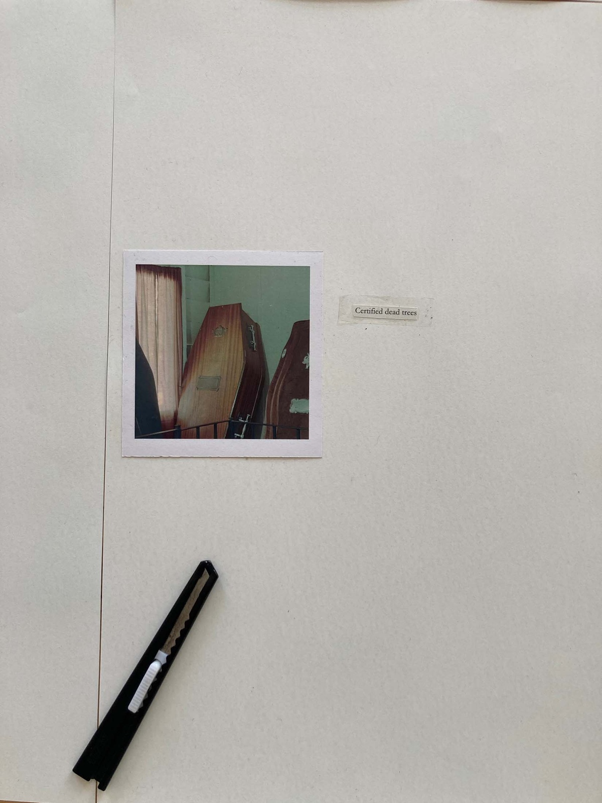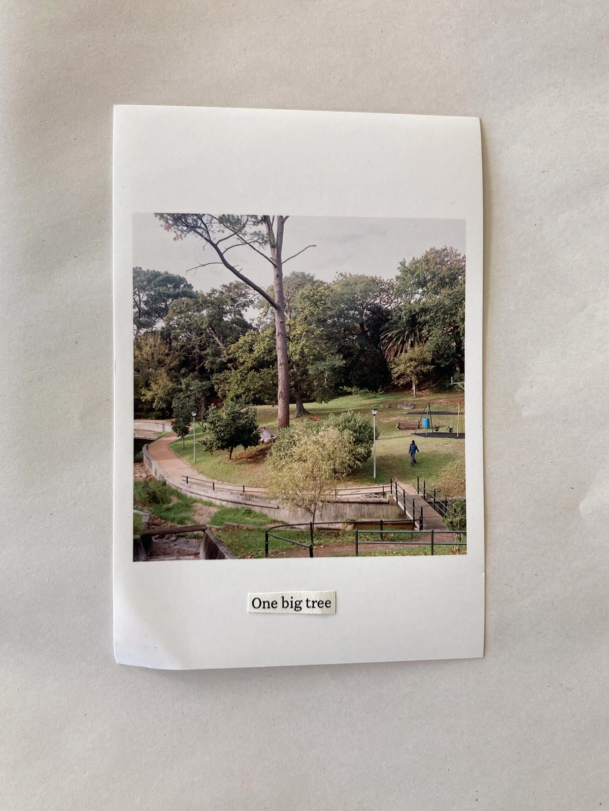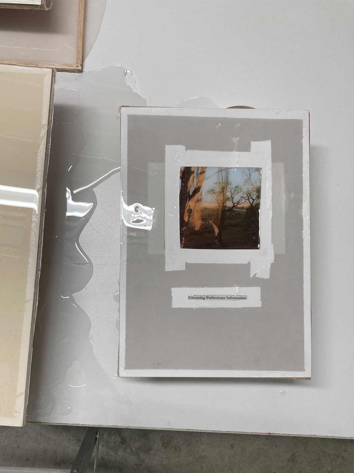 M.T. That began in dialogue with the archived envelopes. Honestly, I think we're all very taken with those little envelopes, with the way they exist as objects rather than photographs or reproductions or books, the ways in which you’d usually engage with such images. The envelopes are novel. Everyone falls in love with them. They combine image, text, ground – the ground being the envelope itself – and information, the facts sheets that are filled out. The experiments at Jared’s studio, which only happened in the last day or two of my residency, were an investigation into how to join image and text together, which is something I do a lot as a designer. Usually, this is purely graphic and done in InDesign. I was looking at other means of joining text from the legislation with my own photographs. How could I put them together? All the time, I was thinking about these envelopes. Because my photographs of trees are not serial, I don't have 12 pictures of each. I realised early on that's not going to work.