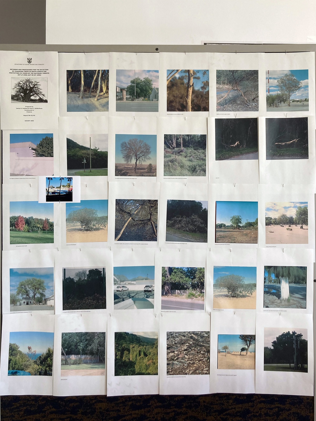 M.T. What I figured out while I was at A4 was that the photographs that I’d inherited were used to create a register of what was then called the National Register of Big Trees, which was a project they undertook, I think, on their own volition in that period, so mid-80s to early 90s. This project mimics other dendrological undertakings in other parts of the world where people create these indexes of big trees. I think it's worth mentioning here that dendrology is the study of individual trees, discrete specimens rather than whole geneses or families or tribes of trees. Dendrologists look at the individual tree for its unique characteristics – its height, whether or not it was naturally occurring or planted, and so on. What I discovered in my research at A4 was the National Register of Big Trees – about a decade later in the New South Africa – is cited in a piece of legislation produced, I think, by the Ministry for Forestry (or whatever it's called now, or was called then, the Department of Forestry and Environmental Affairs). In 2003, that department in the new dispensation drafted a piece of legislation formalising the state's relationship to these big trees. That was the link. The archive I had inherited was created for this tree report, for this National Register of Big Trees, and the National Register of Big Trees became the bedrock for this champion tree legislation. I forget the title of the paper –