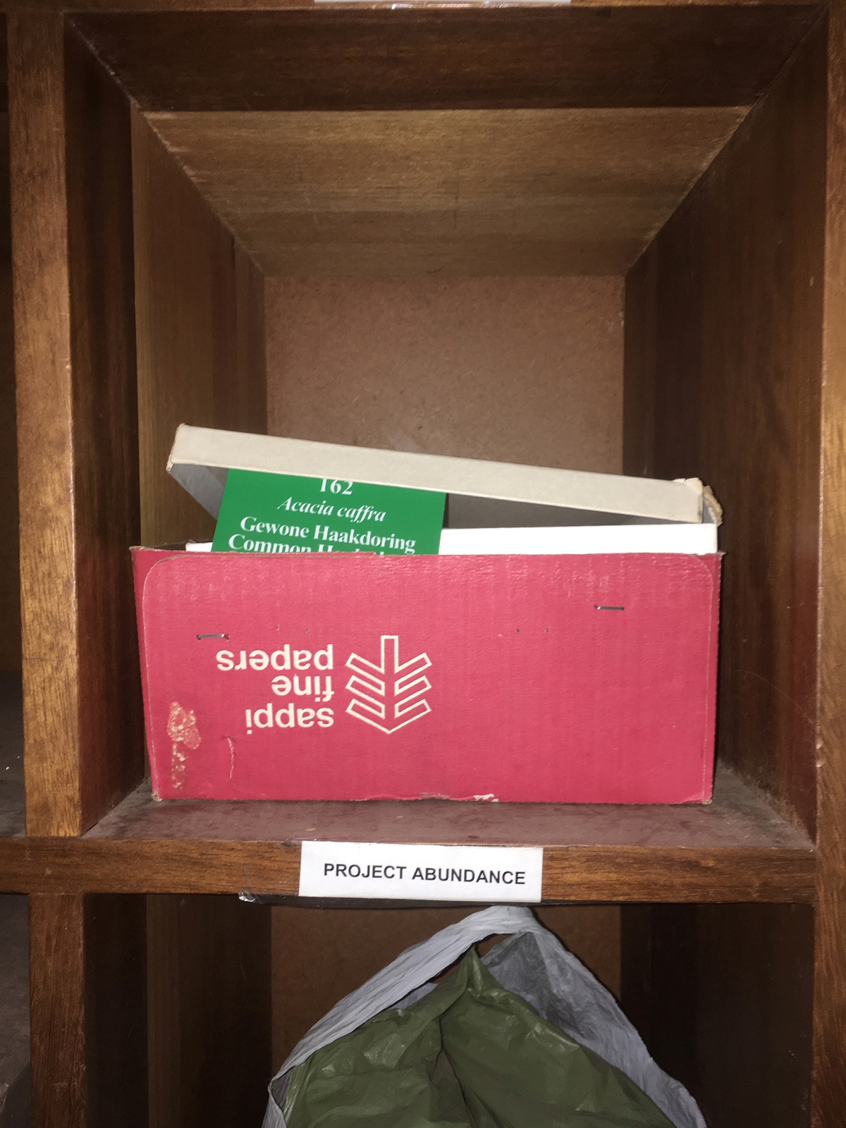 M.T. Out of… I have no idea. I mean, that house was so full of stuff. Three garages of things – it was a proper Pretoria North spec house. You know – three bathrooms, four bedrooms, really made for a growing family. And it was just these two childless, elderly people and lots and lots and lots and lots of material. So I rang my godfather up, and I was like, finally, I have an opportunity to – this is in my head – do something, I suppose, in the footsteps of, or emulating, some people whose work I really admire, or maybe do something in dialogue with them, rather. And he was very matter-of-fact: I've destroyed the pictures. He mentioned that he tried to donate them to the University of Pretoria and that they weren’t interested in the archive; it would be too much of a burden for them to store and digitise them. Other members of the Dendrological Society, of which my godfather is still a member, suggested they just destroy them. They're of no use. They're over 30 years old. The trees are, if not dead, larger – and these photographs, which served a very scientific purpose at the time, no longer apply.