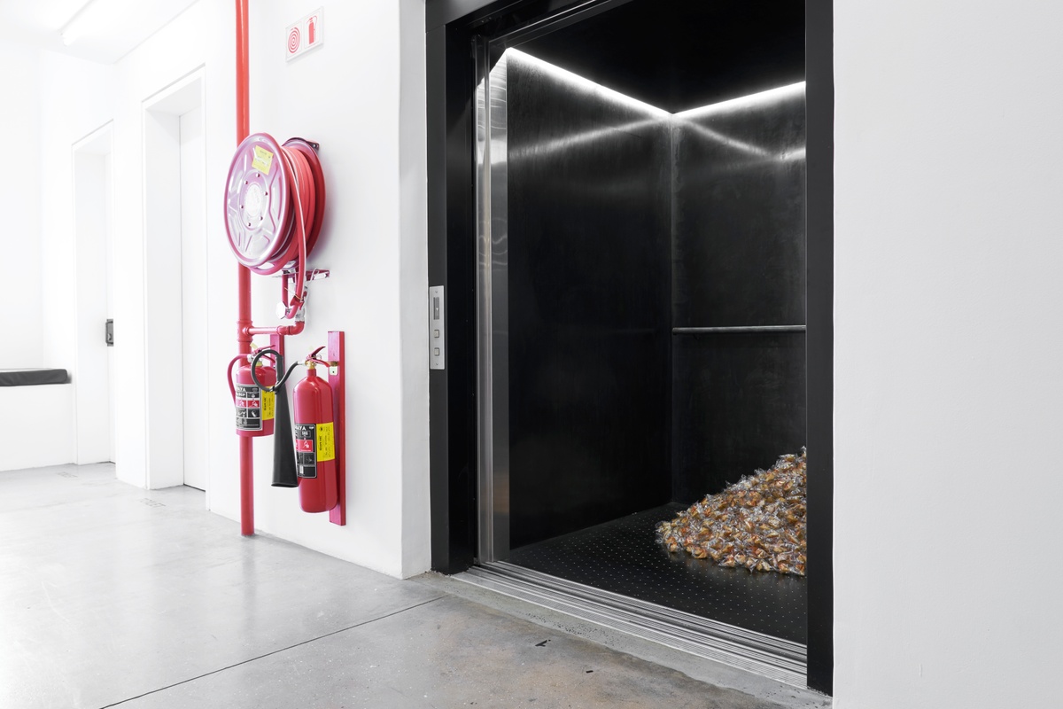 The elevator at A4 Arts Foundation became a 'place' in the global group exhibition of Félix González-Torres' "Untitled" (Fortune Cookie Corner) (1990) re-imagined for May 2020.