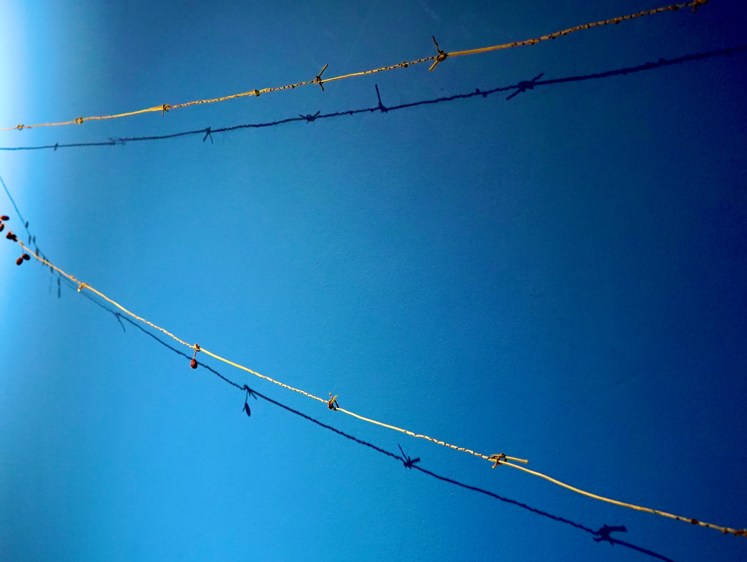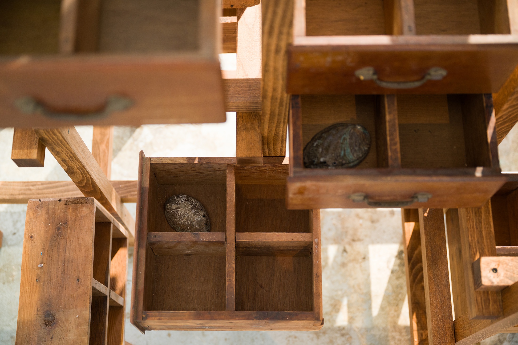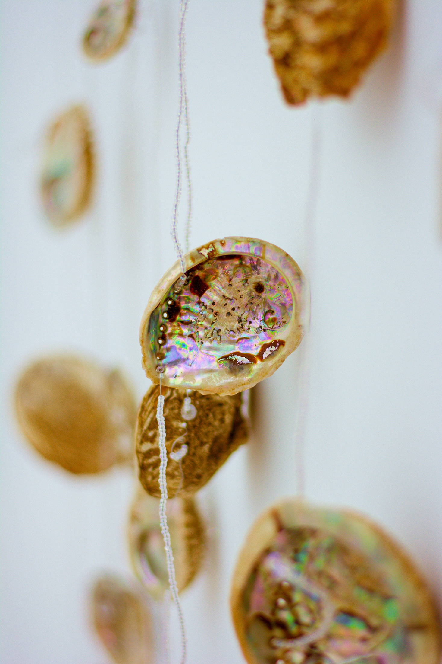 The snails’ striking iridescent shells are discarded as soon as they’re shucked. Jody Brand, who lives and works in Kleinmond (an abalone poaching hotspot), pointed out some remnants on a river bank during a studio visit. She repurposed these shells to create a rosary-like work in remembrance of her late grandmother and as a meditation through a turbulent time in her family.