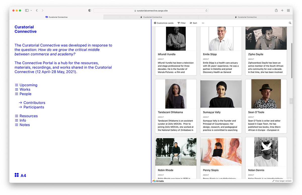Following an application inviting an ‘expanded definition of the curatorial’, twelve curators were chosen by an appointed selection committee to participate in a programme consisting of bi-weekly intensive online seminars. The CX sought to create opportunities for ‘access’, negotiated here as a significant obstacle to curatorial work in the region. Over thirty cultural practitioners working across the arts ecology shared their projects, processes and practices with the cohort through conversations and exchanges that took place over nine weeks.