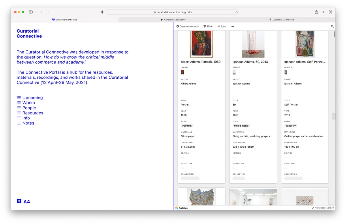 Supporting and extending the Connective’s virtual sessions, the purpose-built Portal offered a hybrid resource environment with selected works shared by participating collectors, a library of recommended readings, a detailed programme with introductions to each contributor, and a collaborative, real-time document for note-taking and -sharing.