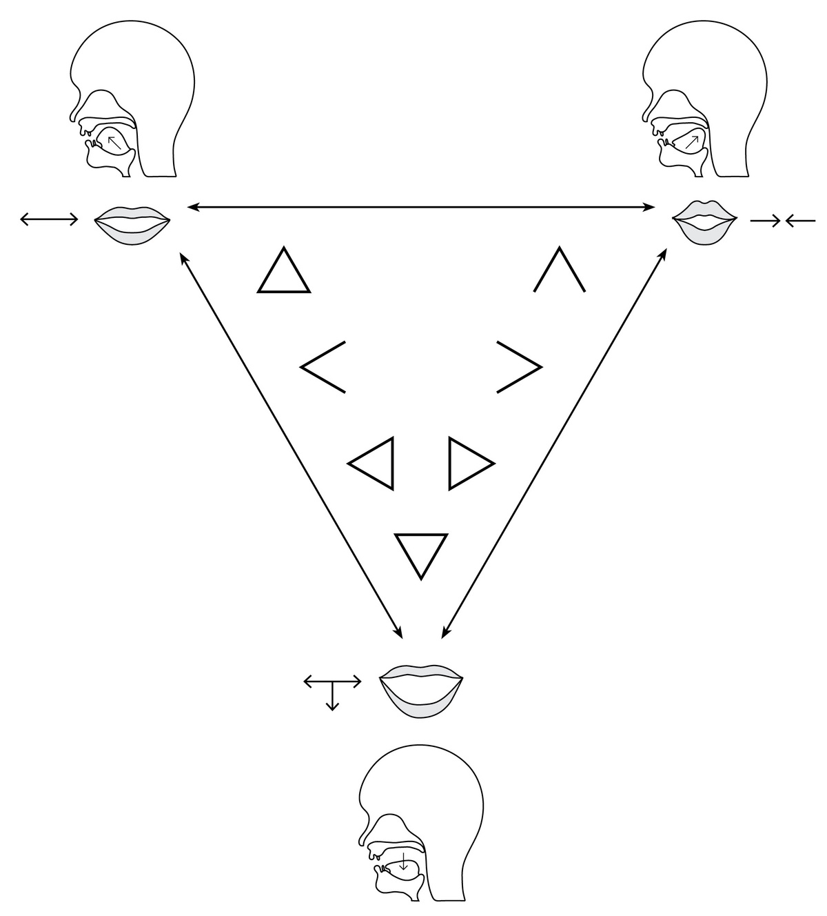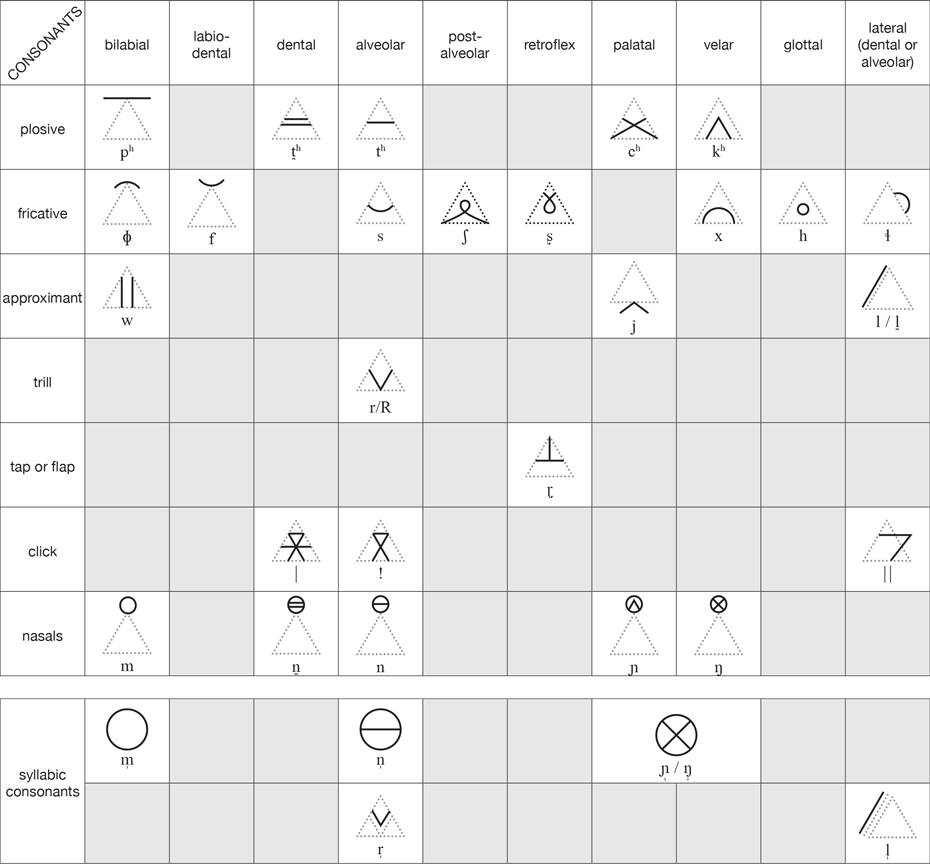 IsiBheqe functions as a syllabary, with each character or grapheme denoting an individual syllable. Using triangles of different orientations to designate vowels, additional shapes and lines converge inside and around these to indicate consonants. The form of the system is iconic rather than arbitrary, with design features observing longstanding visual, semiotic traditions within South Africa, as well as the physical mechanics of speech.