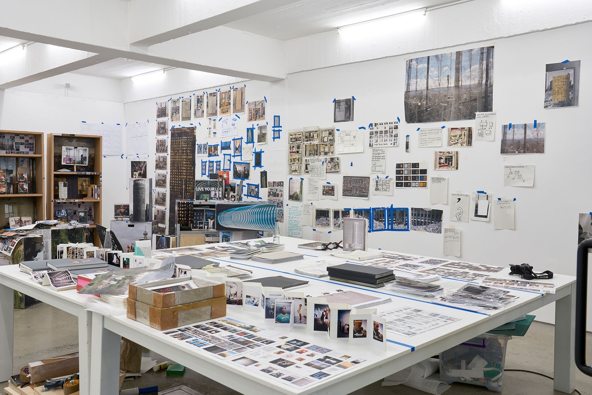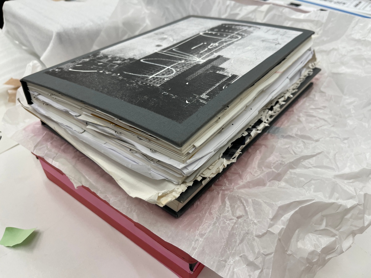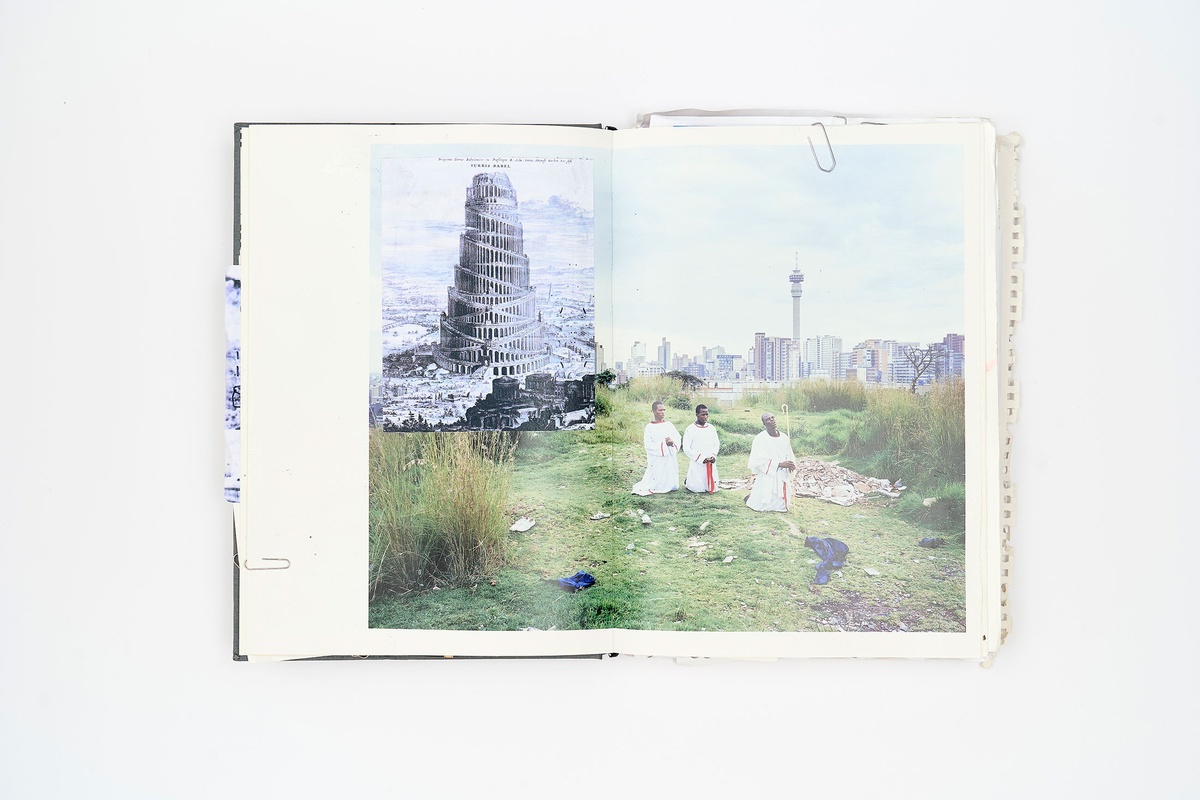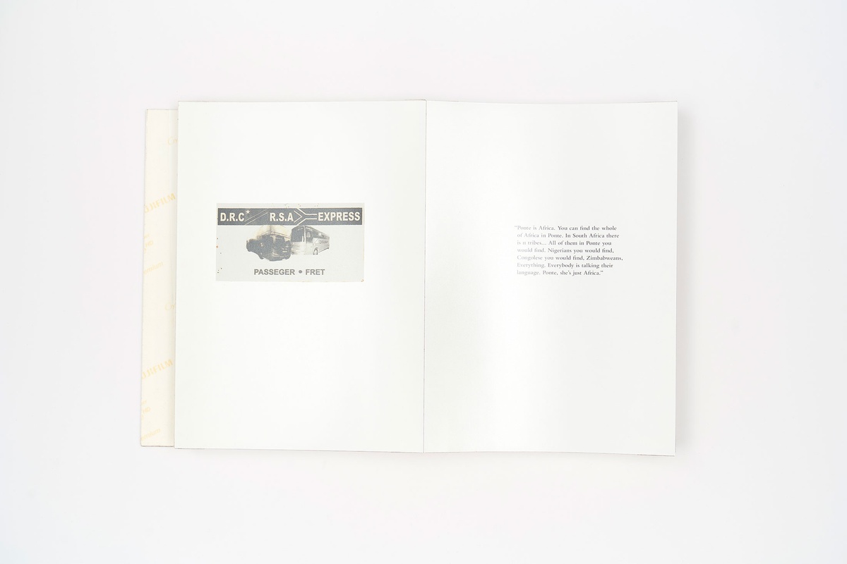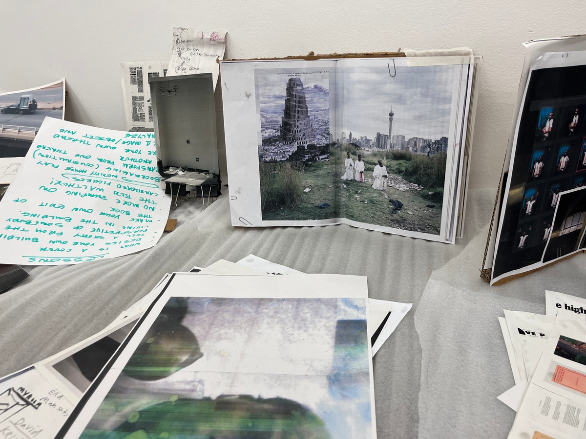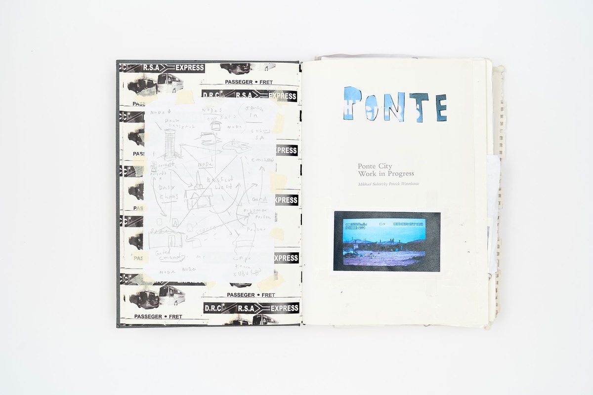 Four distinct book towers are in production. A dummy for tower one, The Book to Begin, is on display at A4 in February 2025 during the Cape Town Art Fair. (The previous year, during the Cape Town Art Fair 2024, the artists invited visiting curators and local practitioners into workshop environments to explore strategies of installation and use for book towers that were then in their prototype phase.) The Book to Begin relates to the period 2008–2012 and contains notebooks, dummies and prototypes of the artists’ earliest attempts at editing the Ponte photographs and associated printed-matter debris into a book.