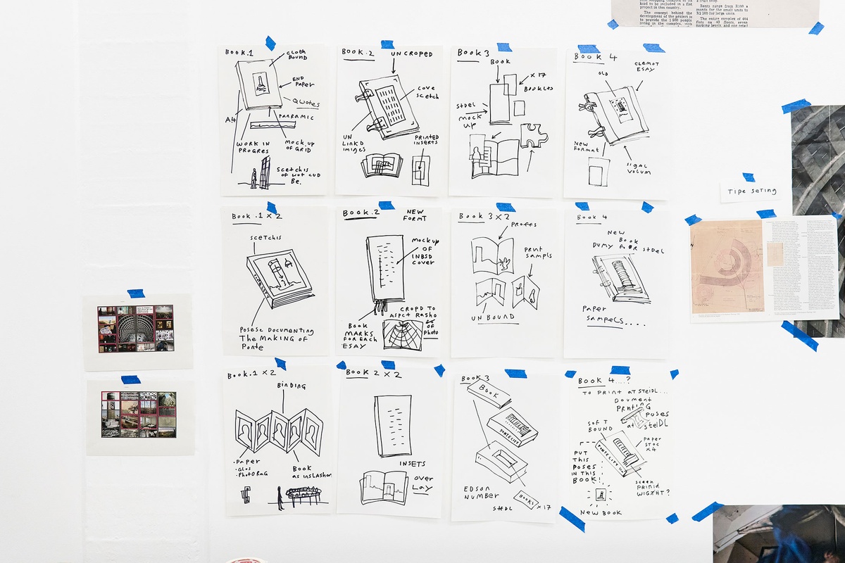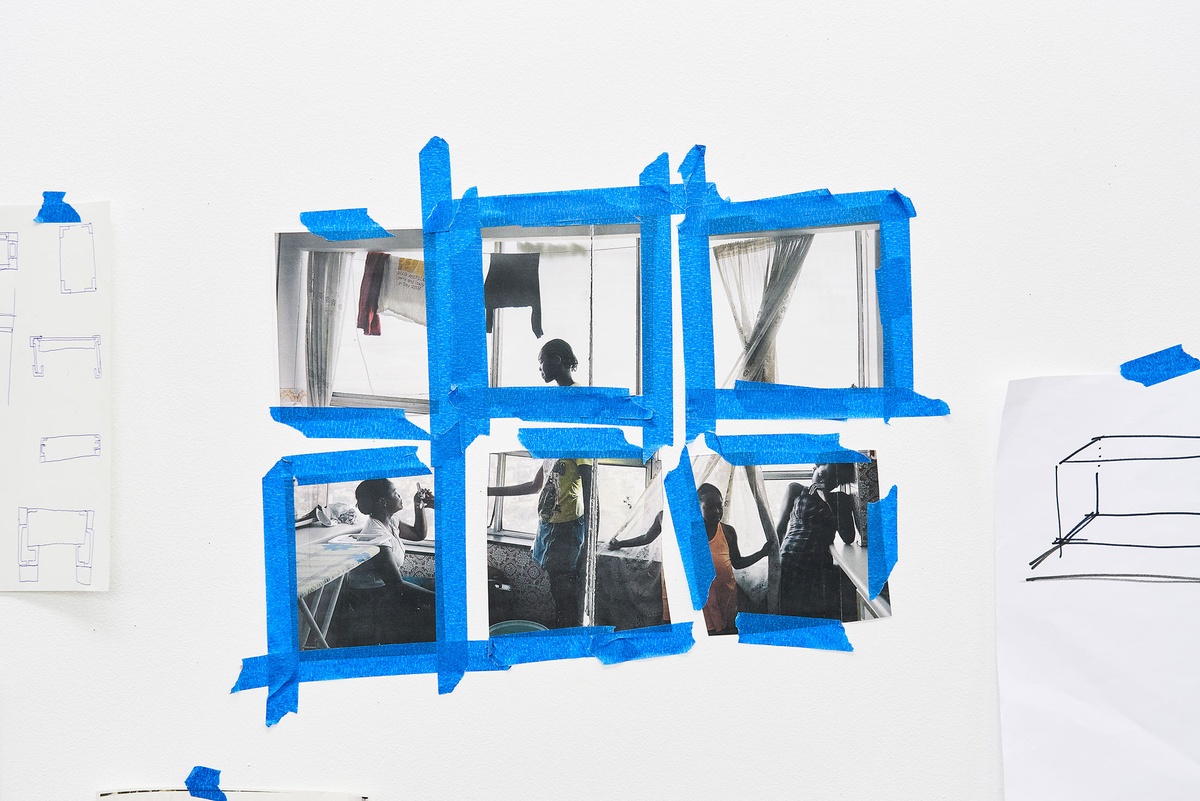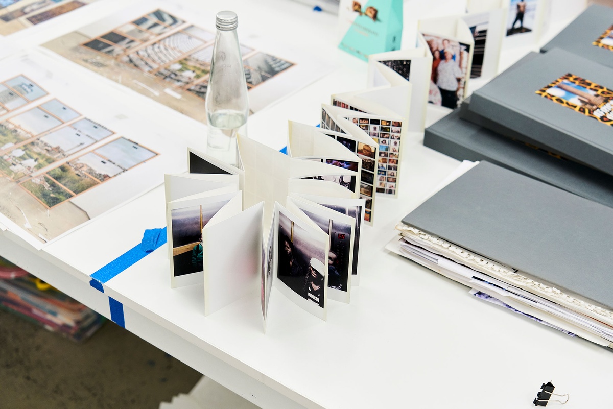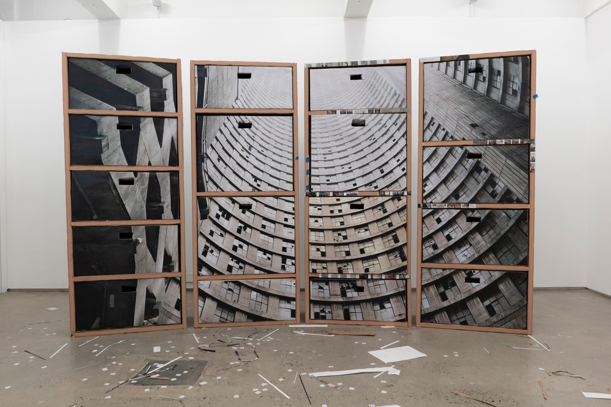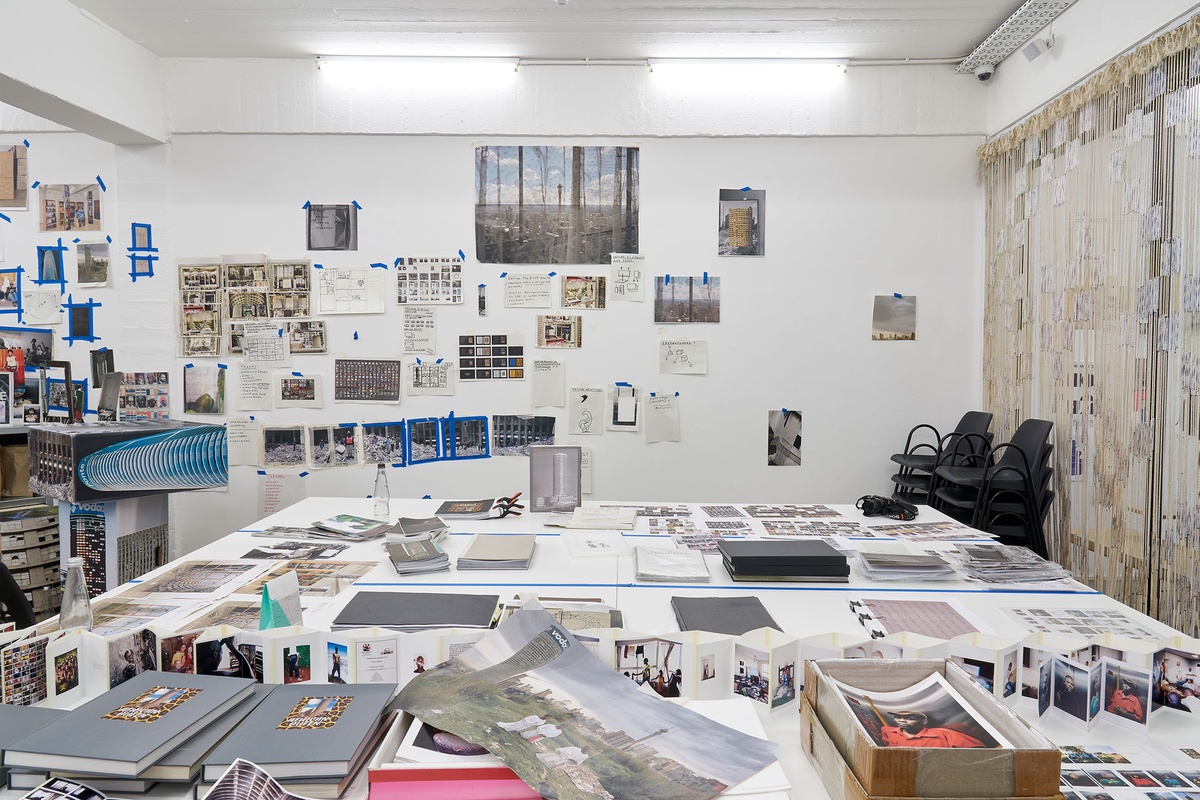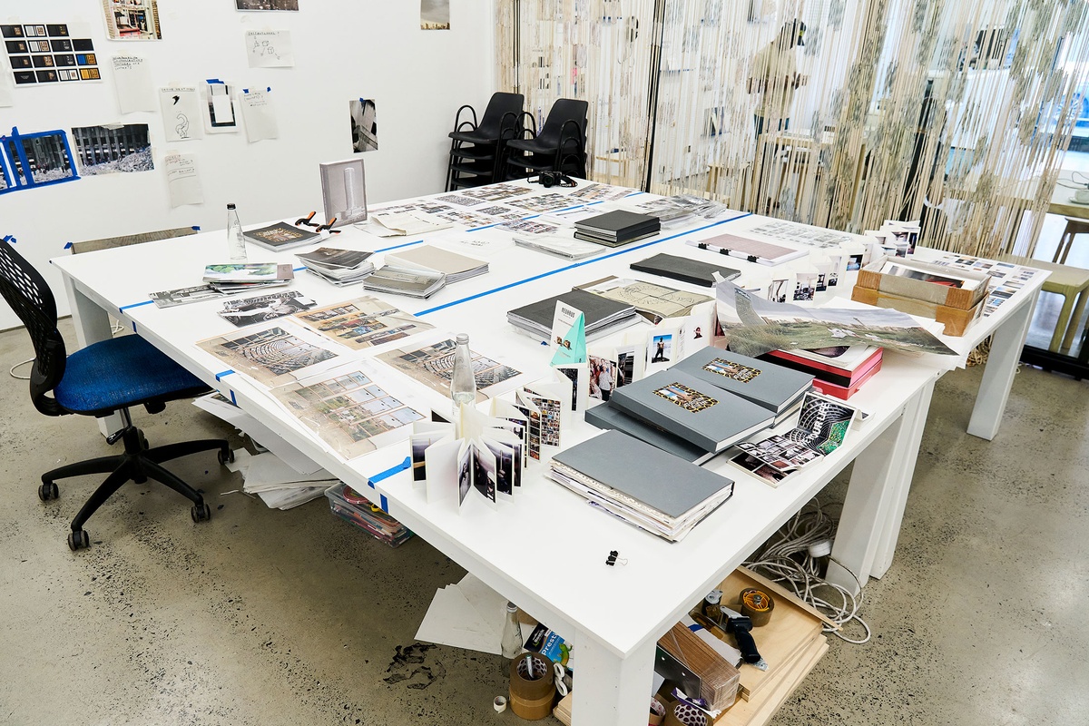 Four distinct book towers are in production. A dummy for tower one, The Book to Begin, is on display at A4 in February 2025 during the Cape Town Art Fair. (The previous year, during the Cape Town Art Fair 2024, the artists invited visiting curators and local practitioners into workshop environments to explore strategies of installation and use for book towers that were then in their prototype phase.) The Book to Begin relates to the period 2008–2012 and contains notebooks, dummies and prototypes of the artists’ earliest attempts at editing the Ponte photographs and associated printed-matter debris into a book.