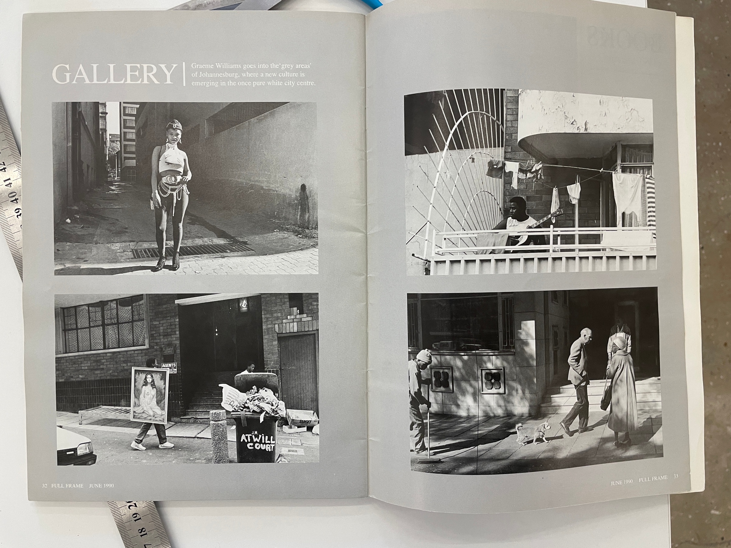 Article on the photography of Graeme Williams in the first issue of Full Frame, a journal of South African documentary photography, in June 1990. The series of photographs would later be included in Williams’ photobook The Inner City (2000), and subsequently featured in Sean O’Toole’s Photo Book! Photo-Book! Photobook! exhibition in 2022. Image courtesy of A4 Arts Foundation.