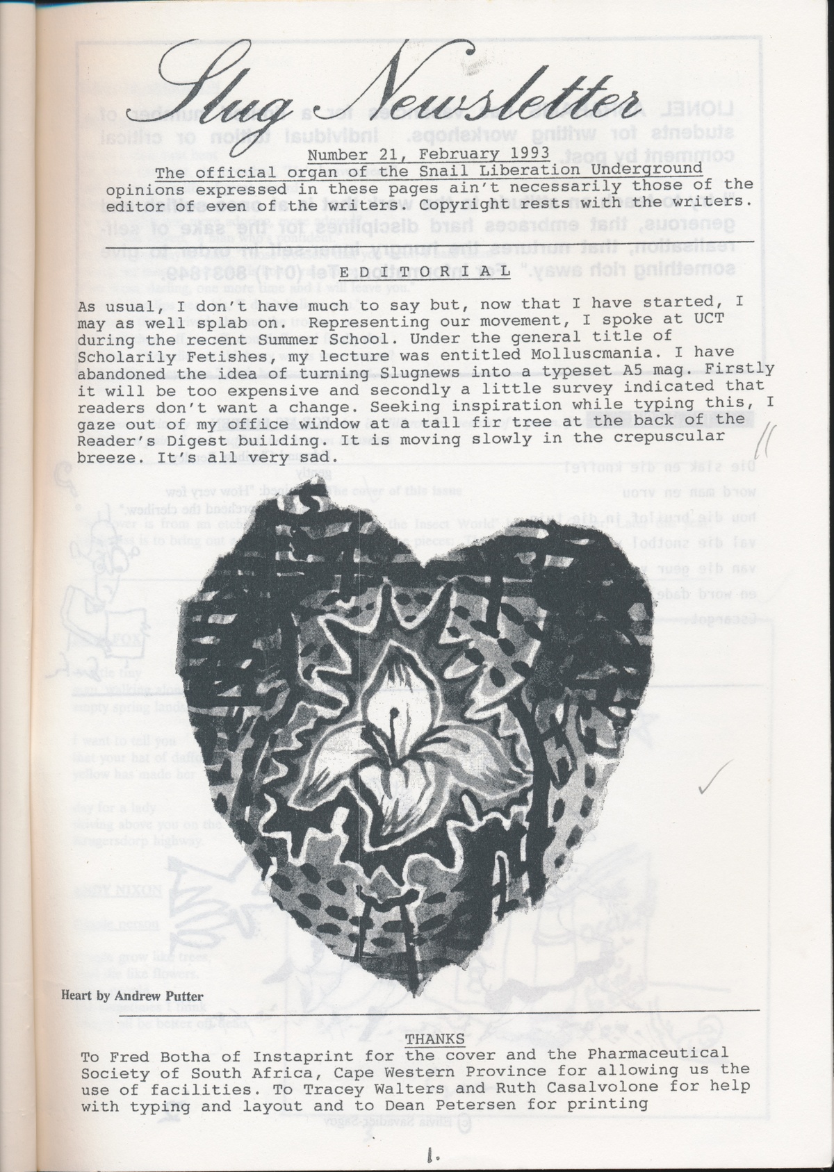 Van der Shyffe, S. (eds.) (1993) ‘Poems, prose, mollusciana, nonsense, clippings, doggerel, essays, cartoons, graphics, science, wonder, pretence’, Slug Newsletter, No. 21.