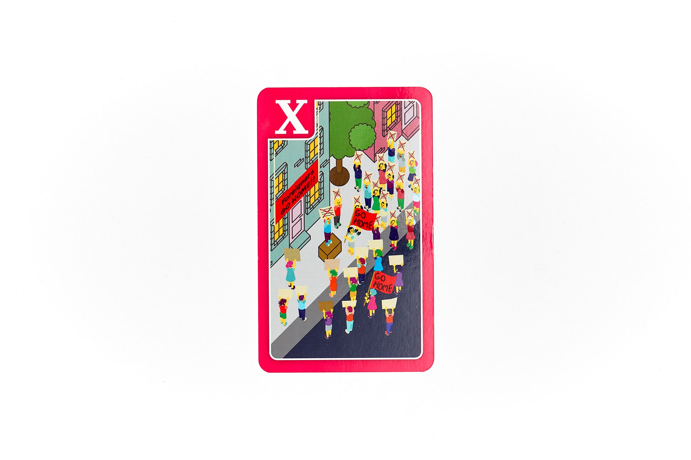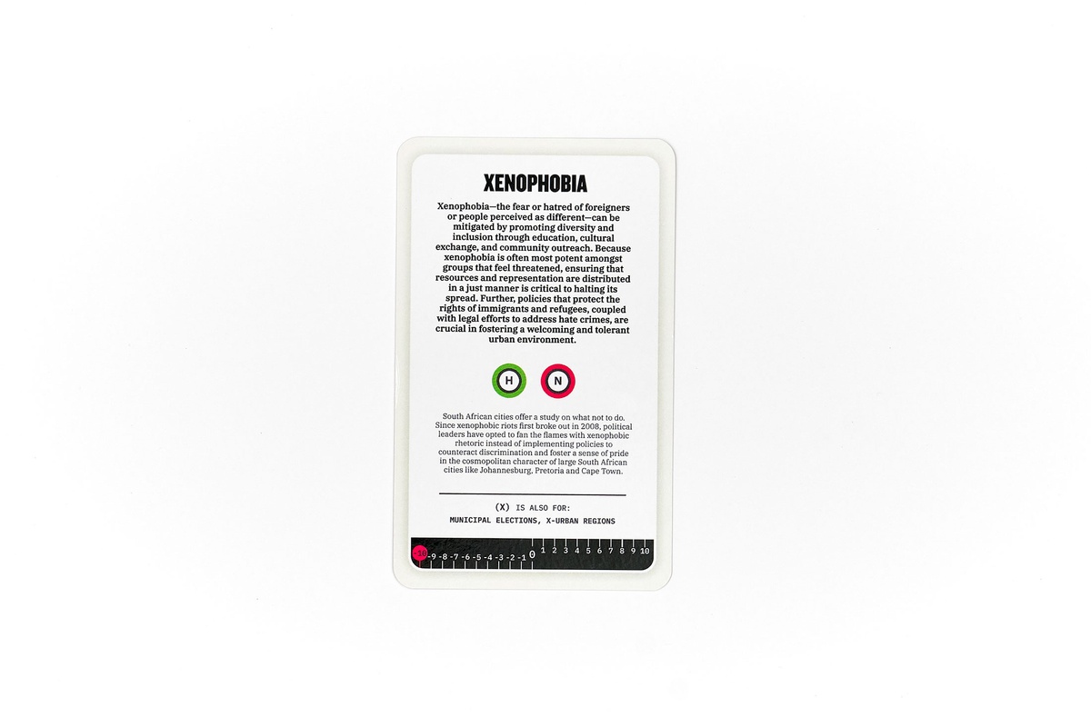 Card: Xenophobia (2024), Urban Canvas Deck Main, Shift Game Set Prototype. 8 x 13 cm. Image courtesy of A4 Arts Foundation.