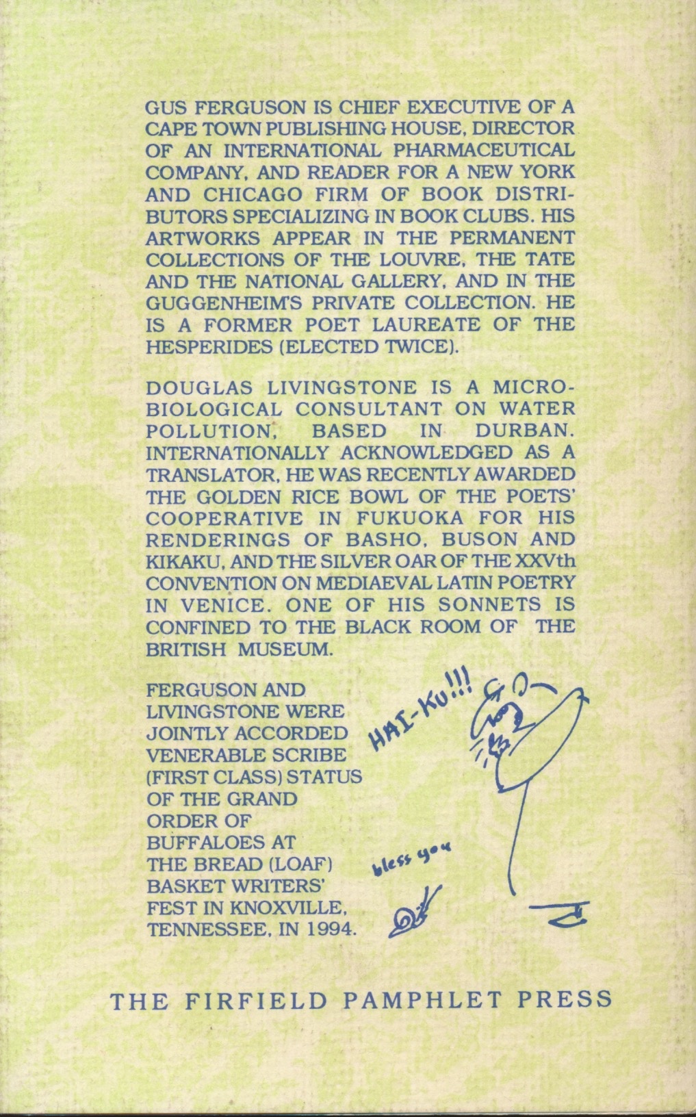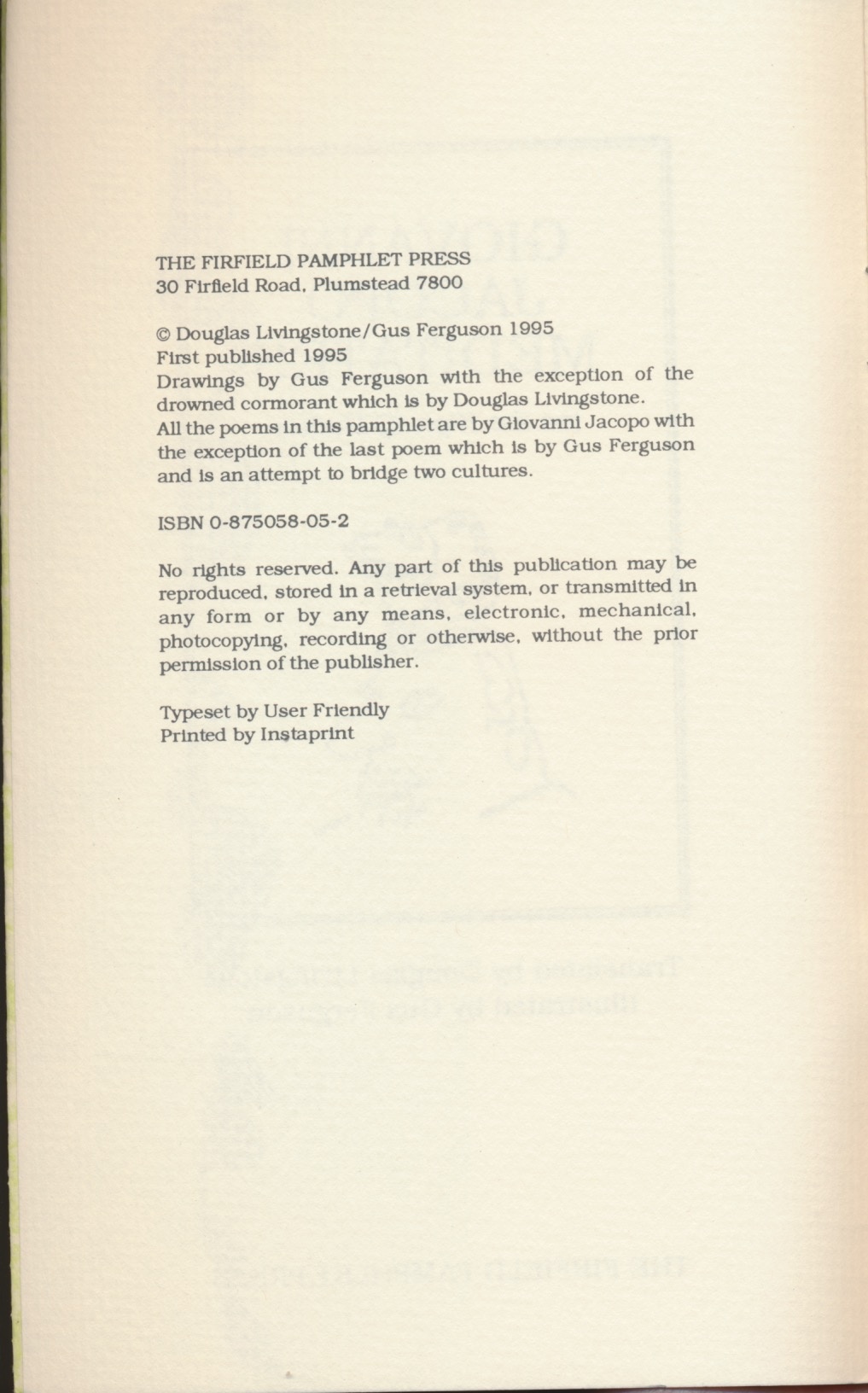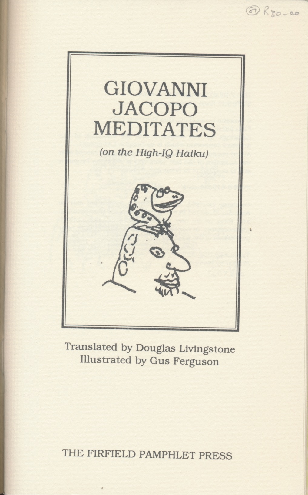 Livingston, D. (trans.) (1995) Giovanni Jacopo Meditates: (on the High-IQ Haiku). Cape Town: Firfield Pamphlet Press.