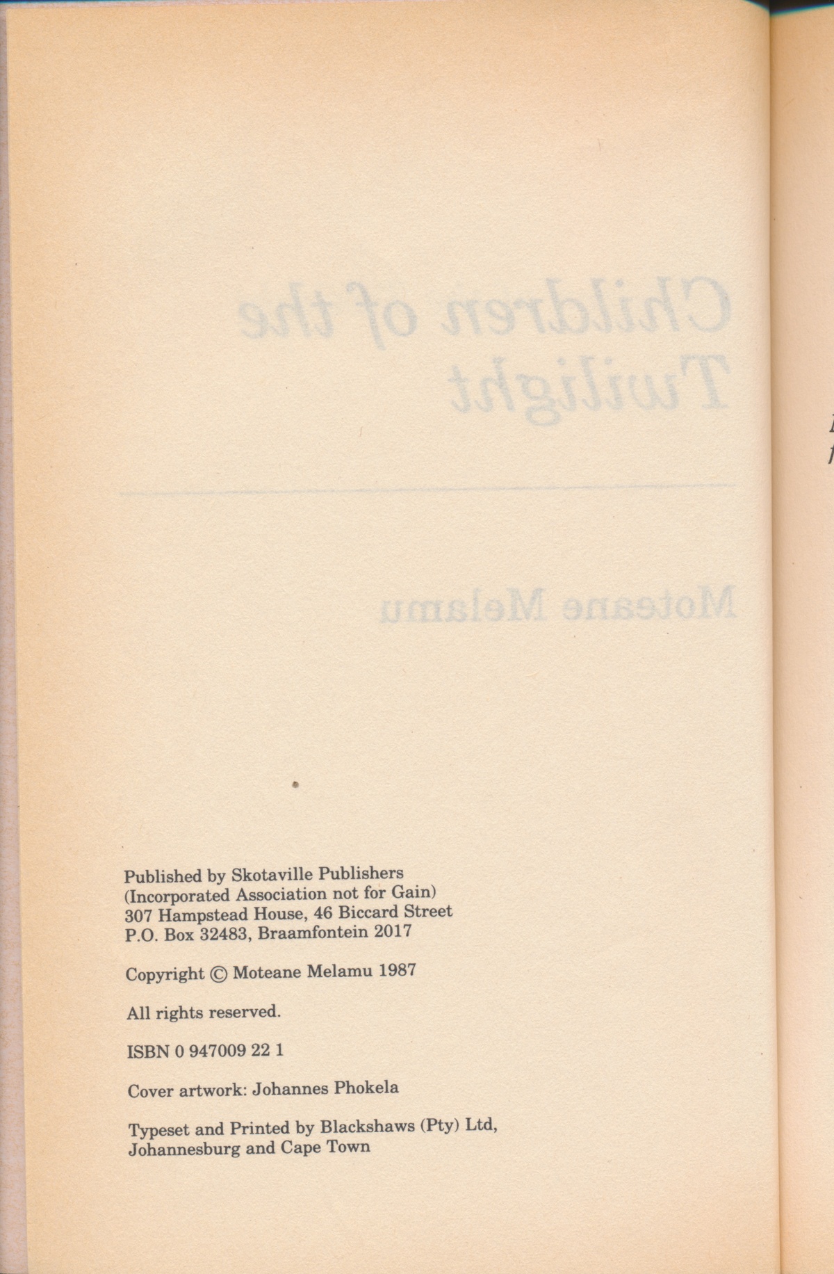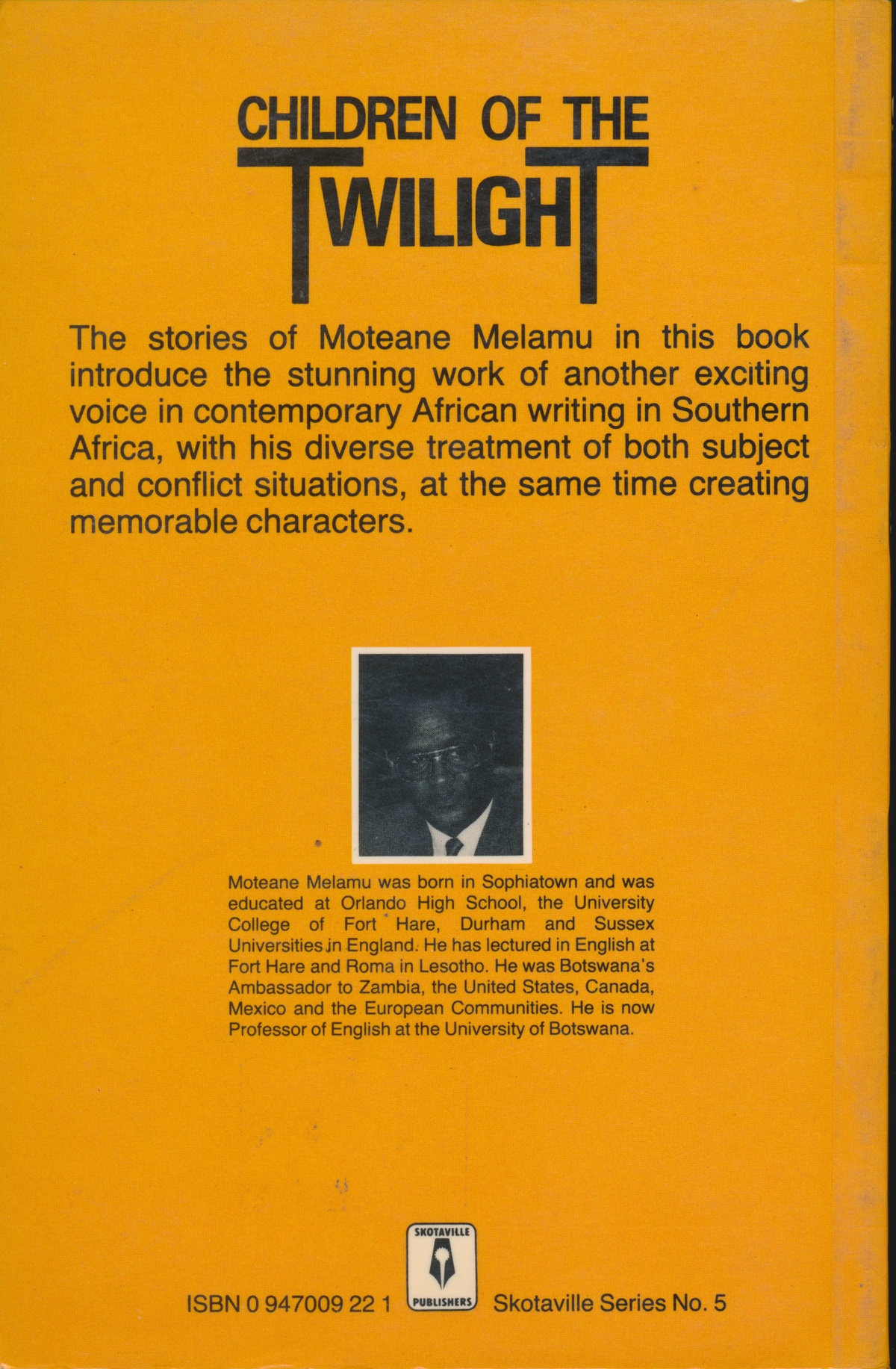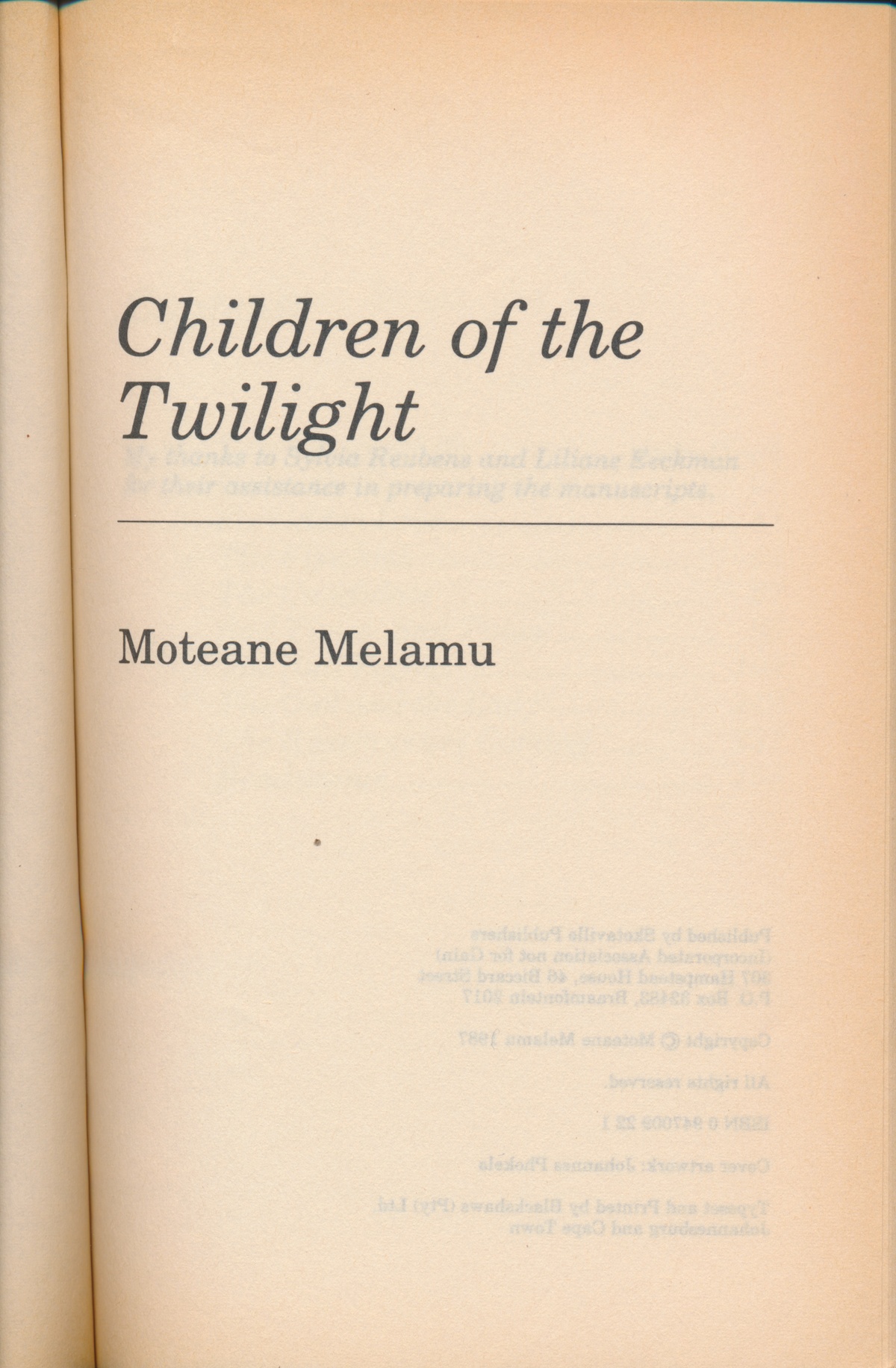 Melamu, M. (1987) Children of the Twilight: The stories of Moteane Melamu. Johannesburg: Skotaville Publishers.