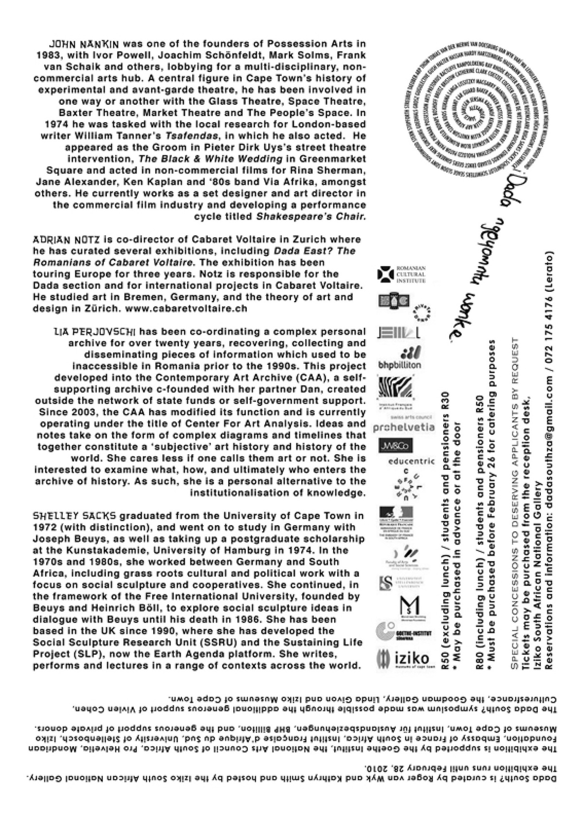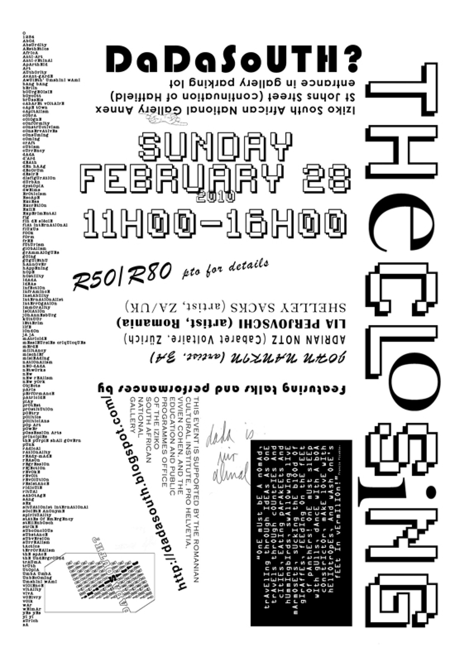 Poster: Smith, K. & Van Wyk, R. (2009) Dada South? Closing flyer. Designed by Christian Nerf. 10.5 x 14.85 cm. Image courtesy of Kathryn Smith and Roger van Wyk.
