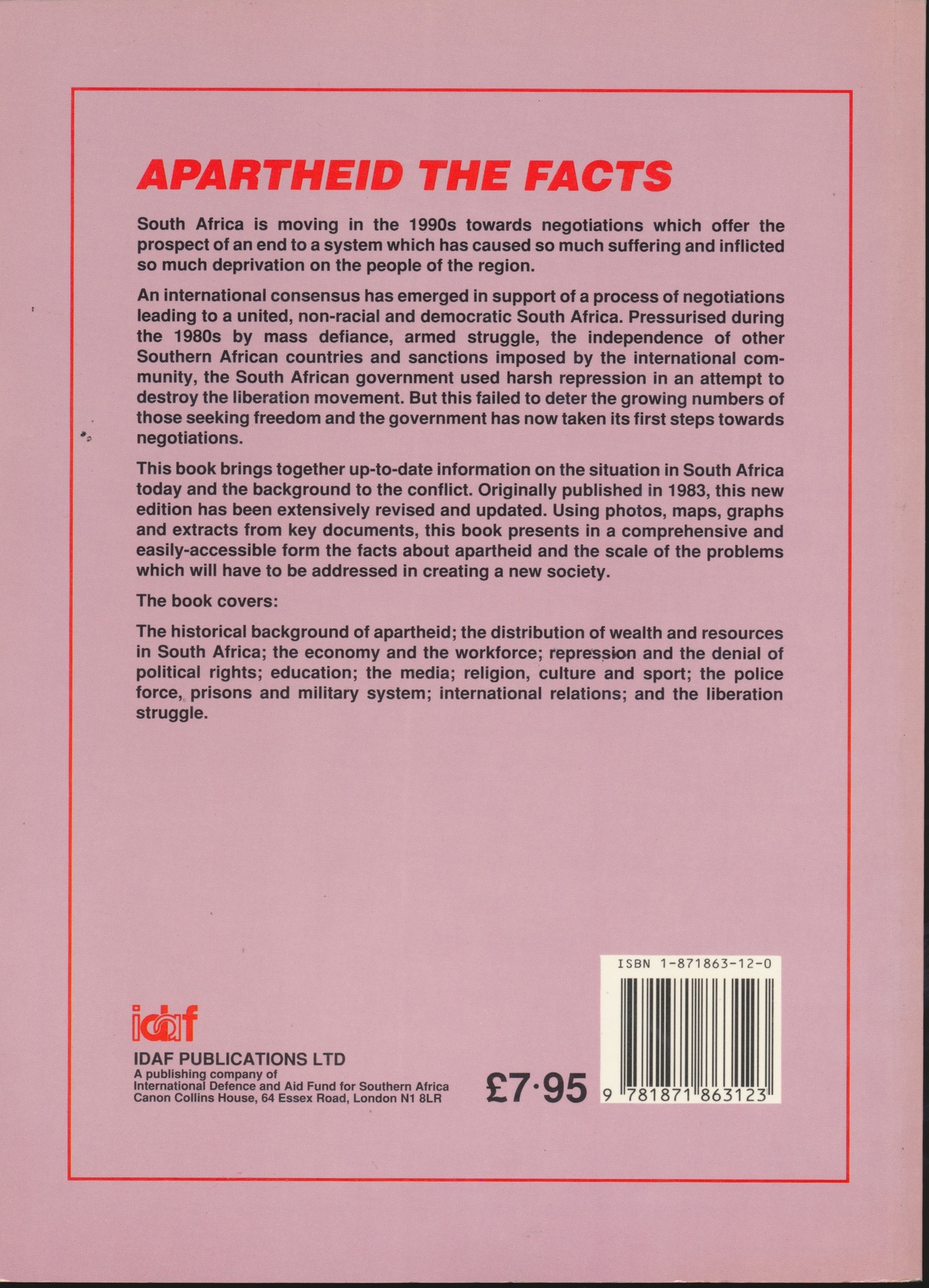 IDAF (1991) Apartheid: The Facts. Rev. edn. London: International Defence and Aid Fund for Southern Africa.