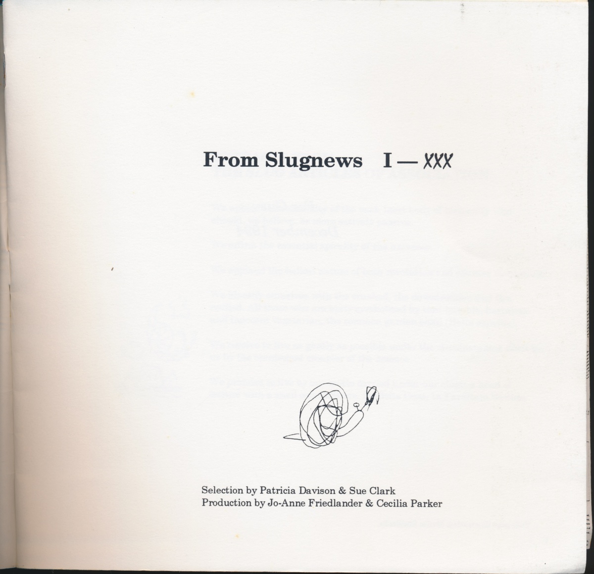 Davidson, P. and Clark, S. (eds.) (1994) From Slug News 1 - xxx: A selection by Patricia Davison & Sue Clark. Self-published.