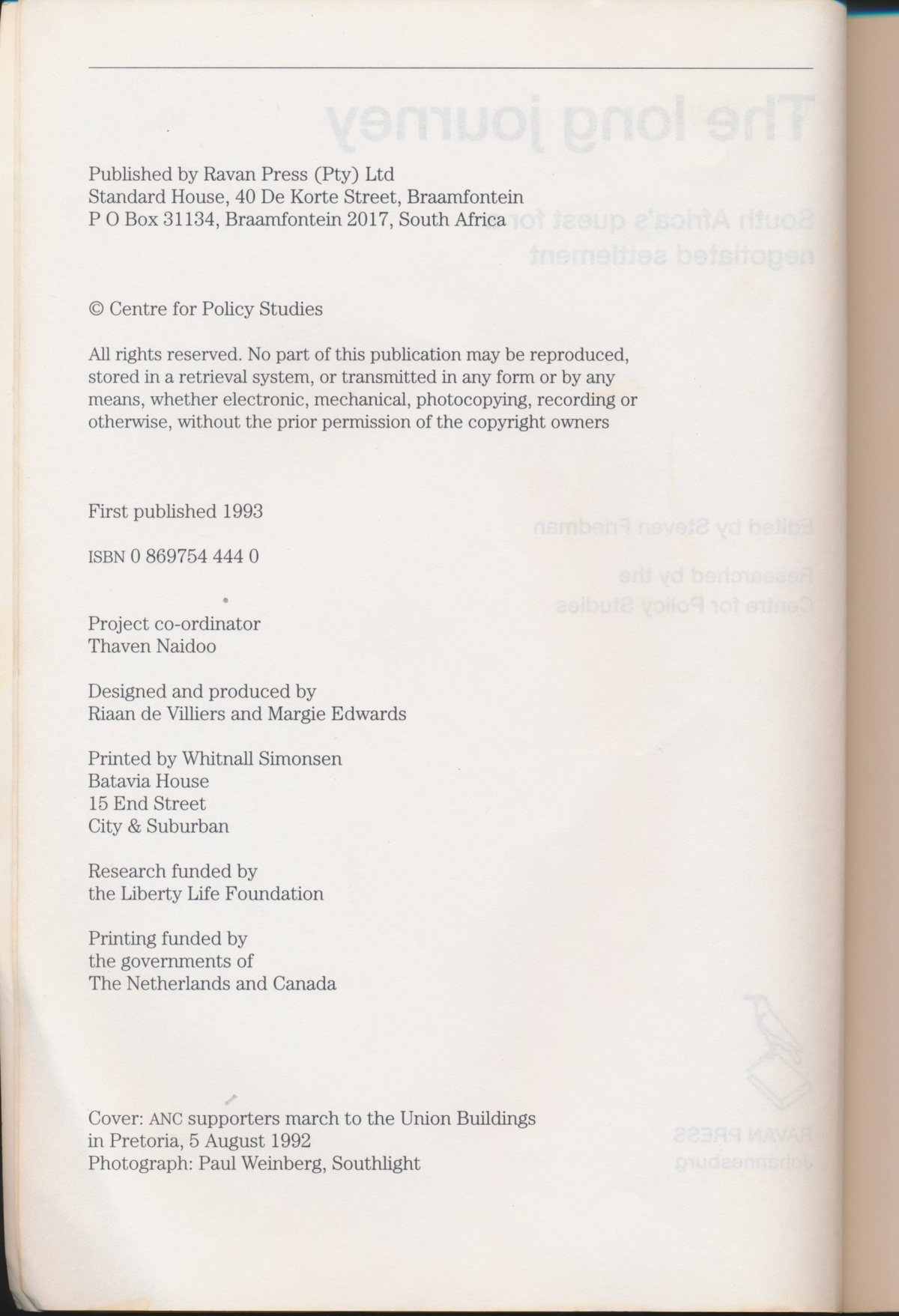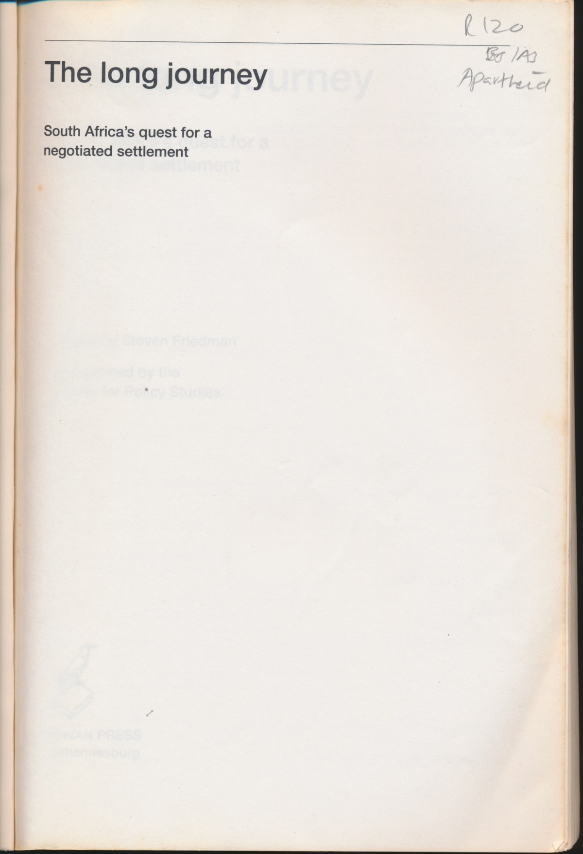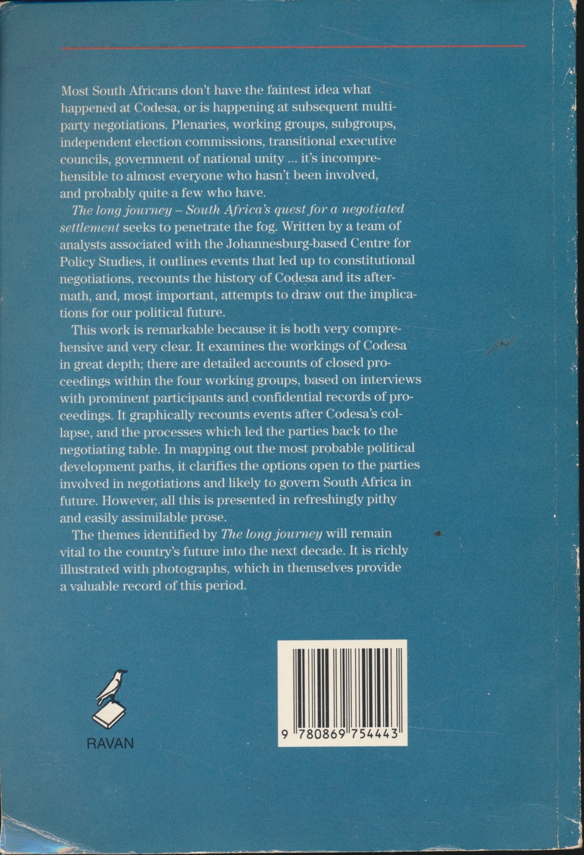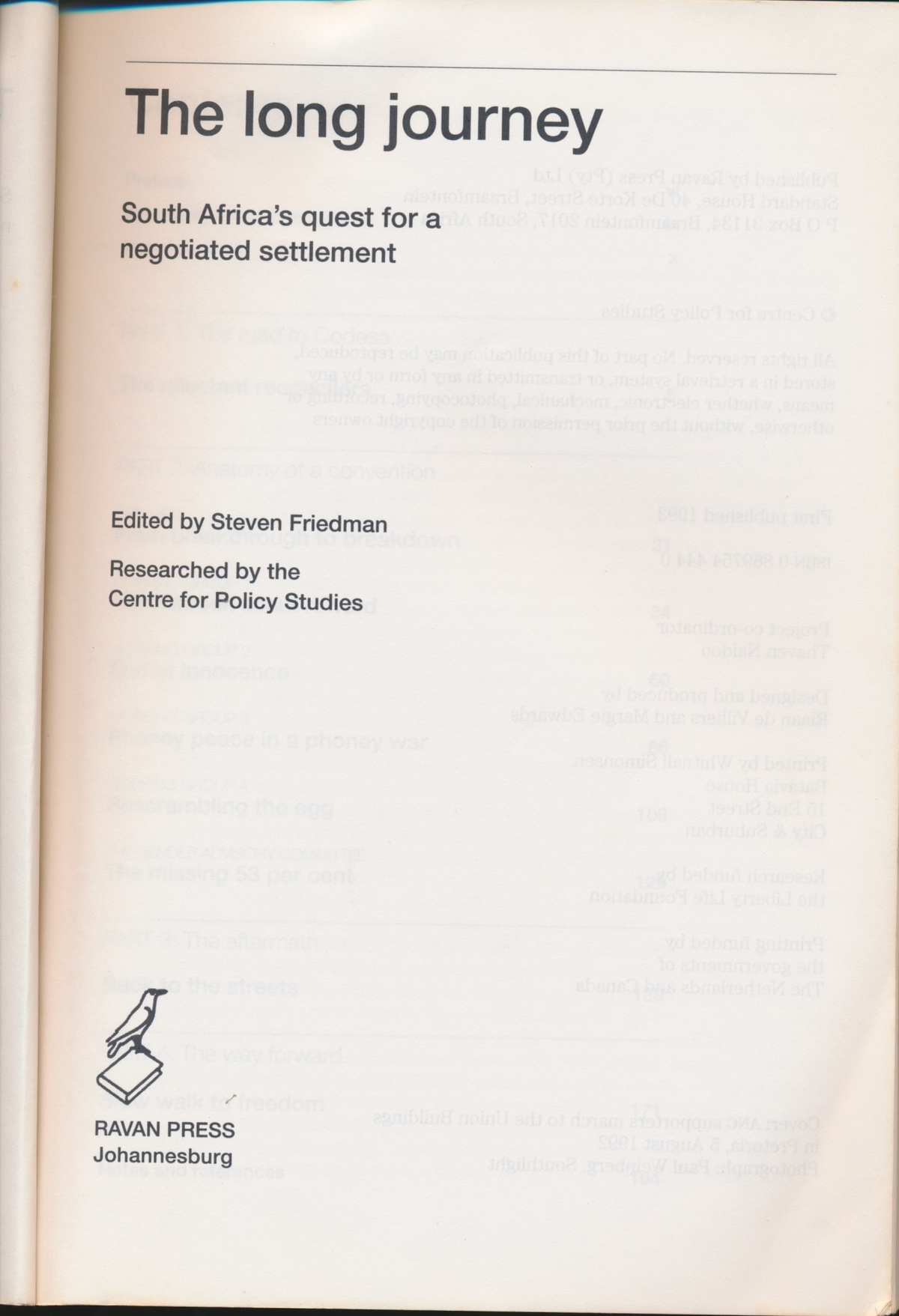 Friedman, S. (eds.) (1993) The long journey: South Africa’s quest for a negotiated settlement. Johannesburg: Ravan Press.