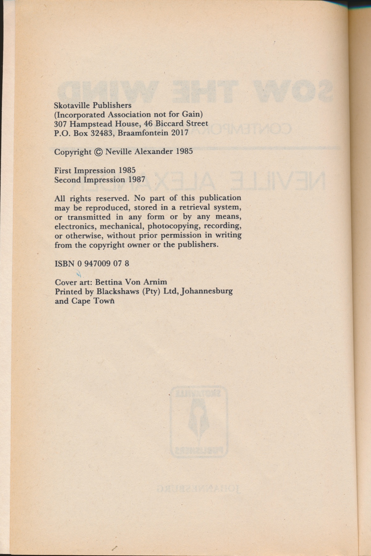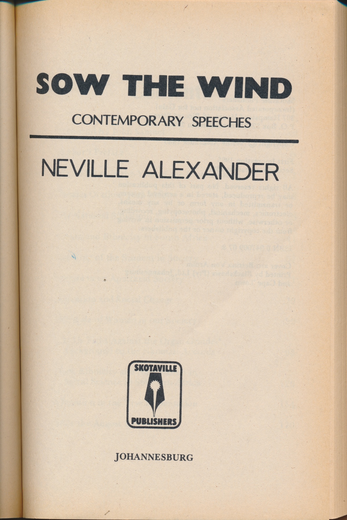 Alexander, N. (eds.) (1987) Sow the Wind: Contemporary Speeches. Johannesburg: Skotaville Publishers.