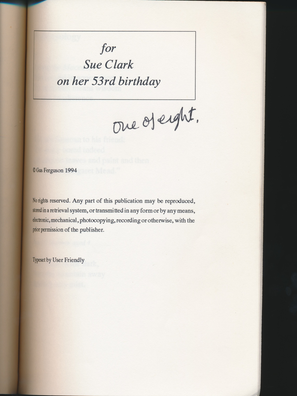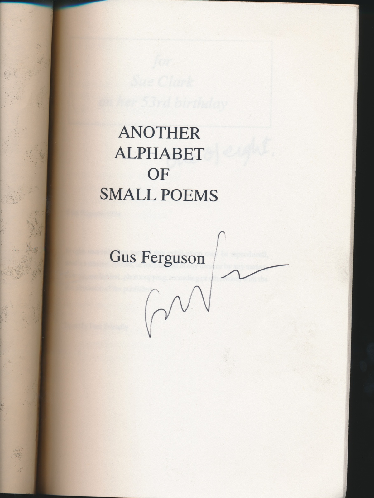 Ferguson, G. (1994) Another Alphabet of Small Poems: For Sue Clark on her 53rd Birthday. Self-published.