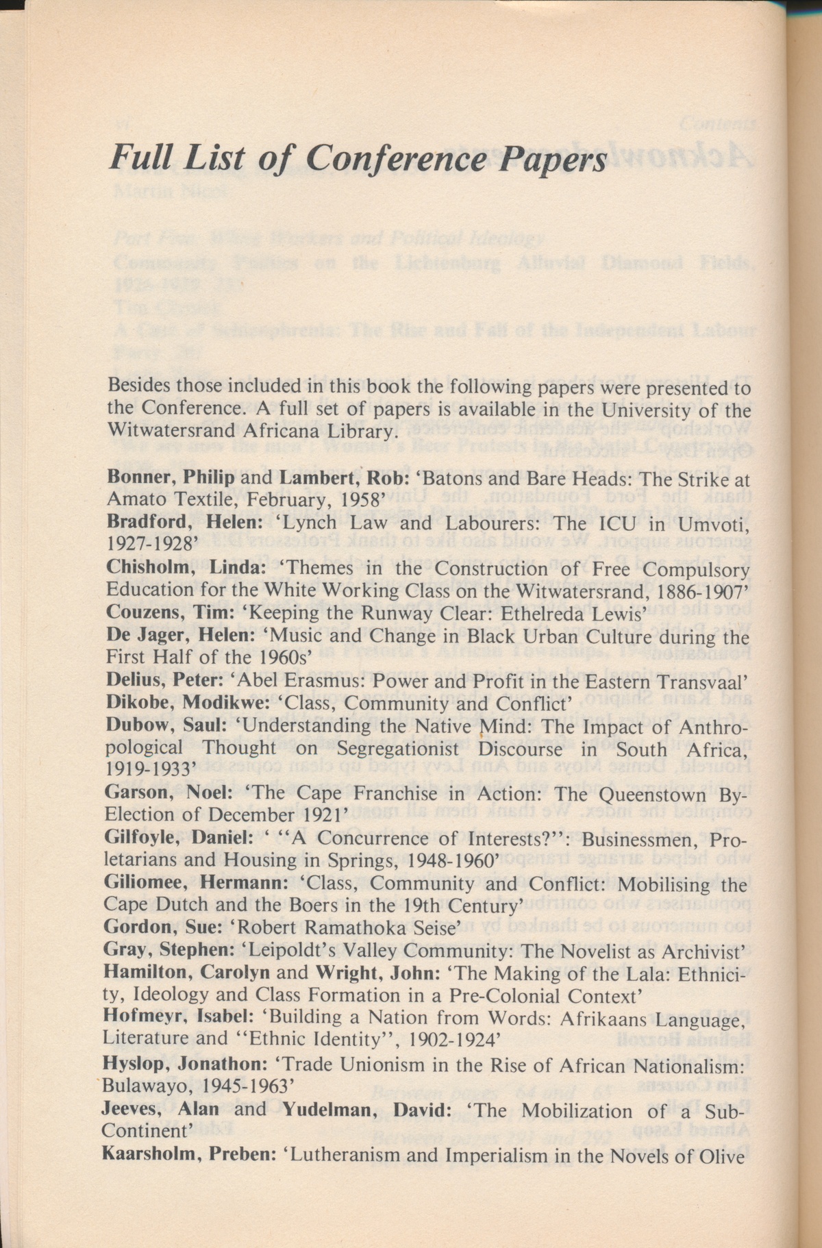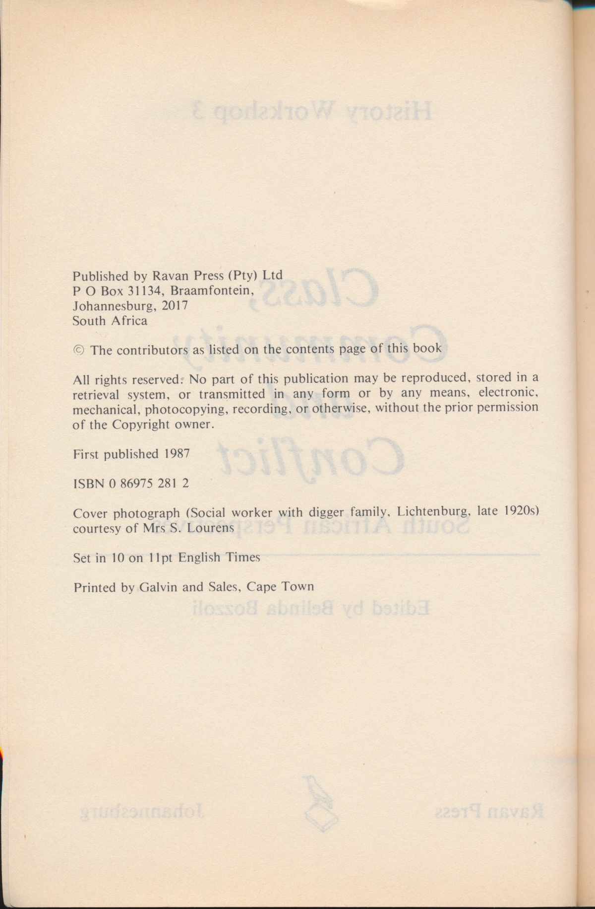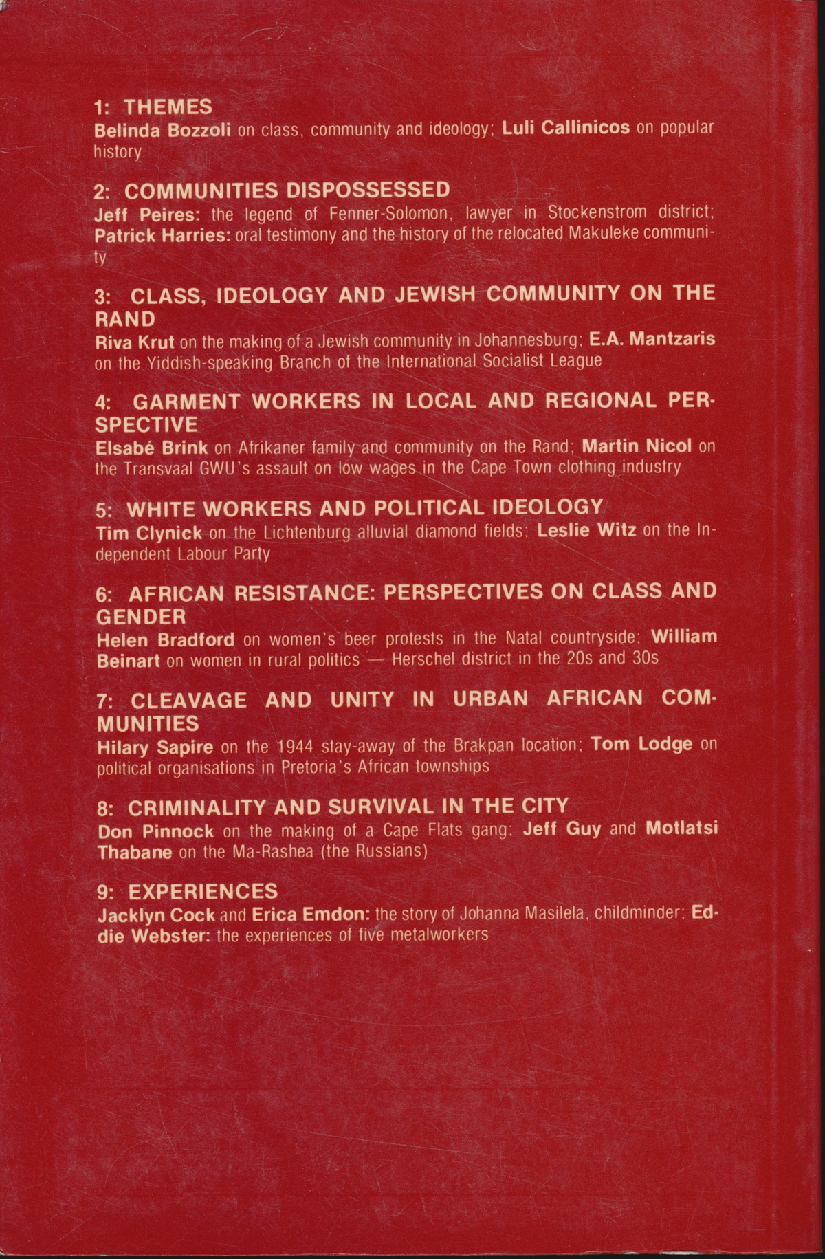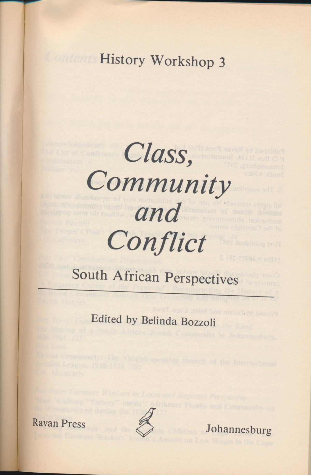 Bozzoli, B. (eds.) (1987) Class, Community and Conflict: South African Perspectives. Johannesburg: Ravan Press.