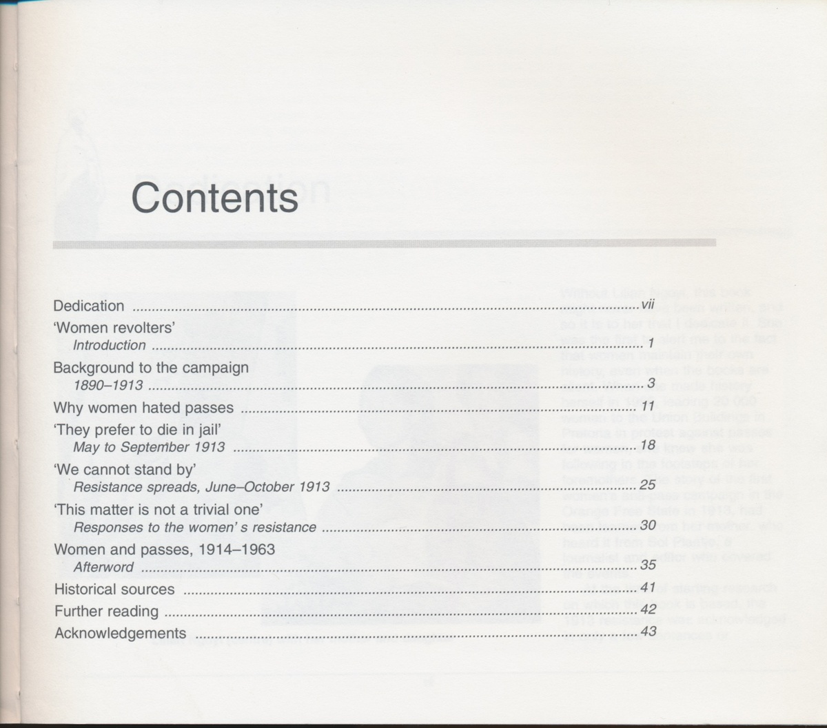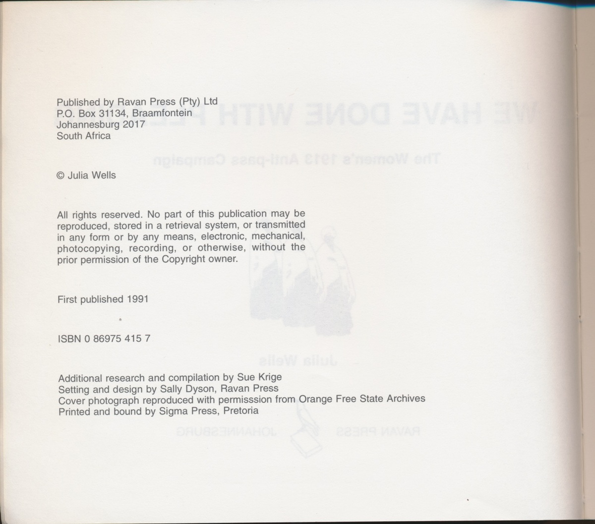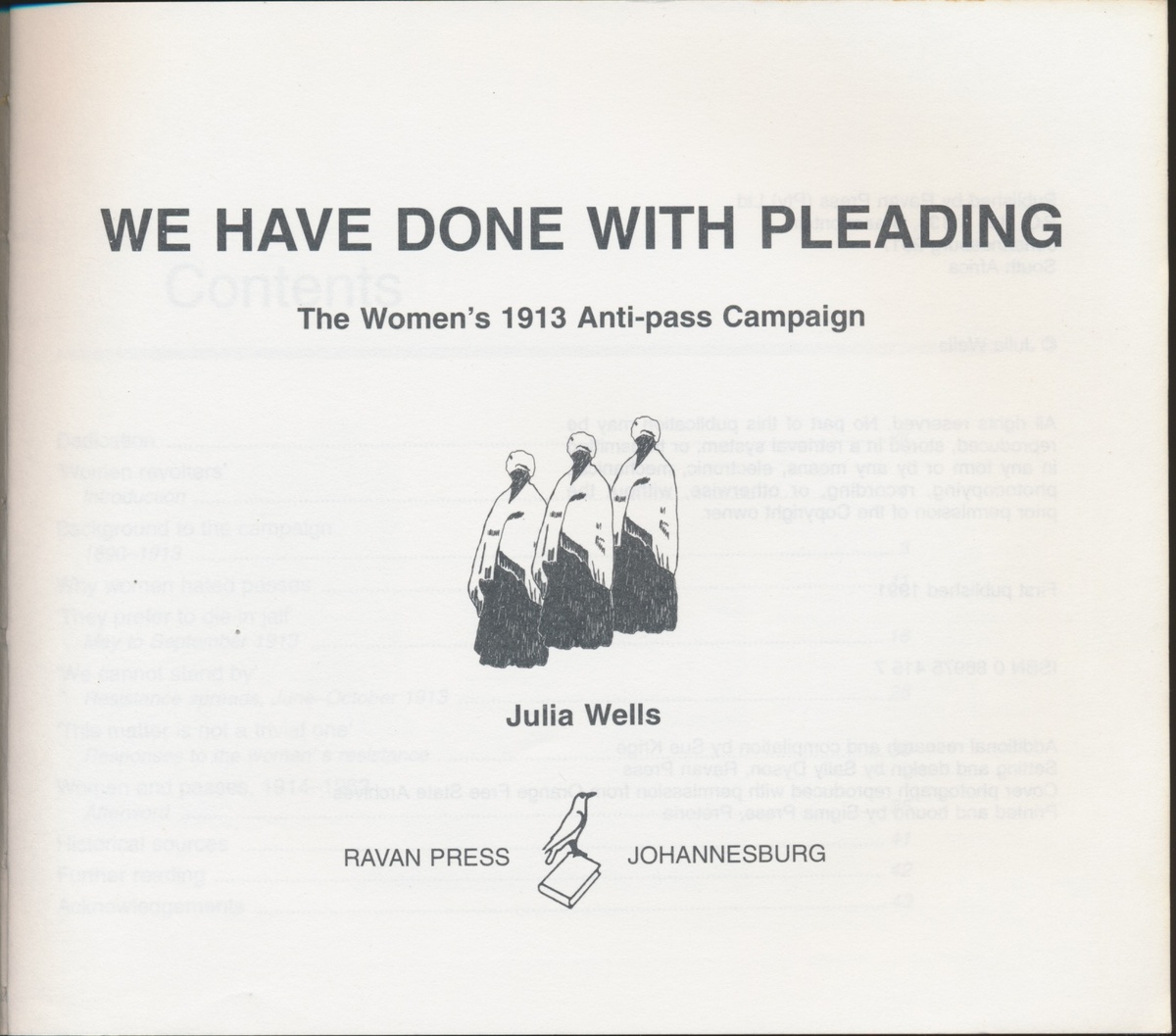 Wells, J. (1991) We have done with pleading: The women’s 1913 anti-pass campaign. Johannesburg: Ravan Press.
