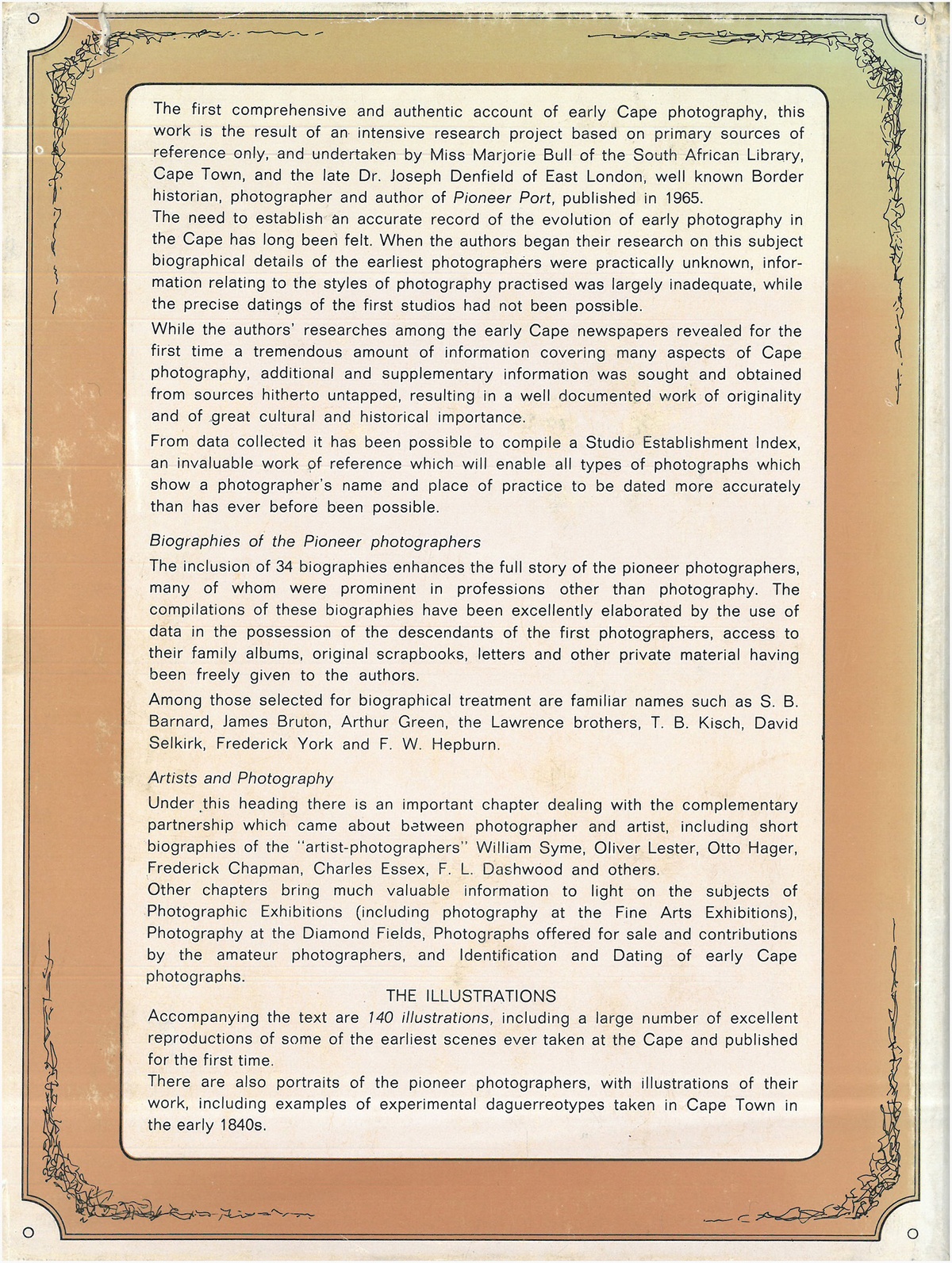 Bull, M. and Denfield, J. (1970) Secure the Shadow: The Story of Cape Photography from its beginnings to the end of 1870. Cape Town: Terence McNally.