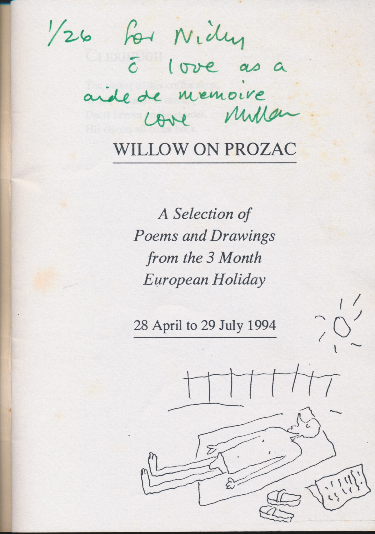 Ferguson, G. (1994) Willow on Prozac: A Selection of Poems and Drawings from the 3 Month European Holiday. 1/26 edn. Self-published.