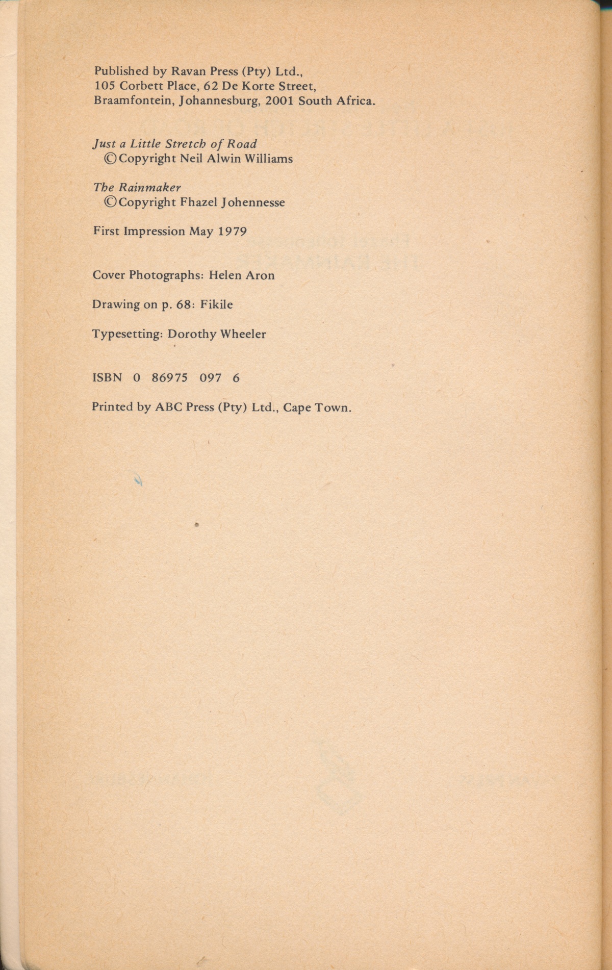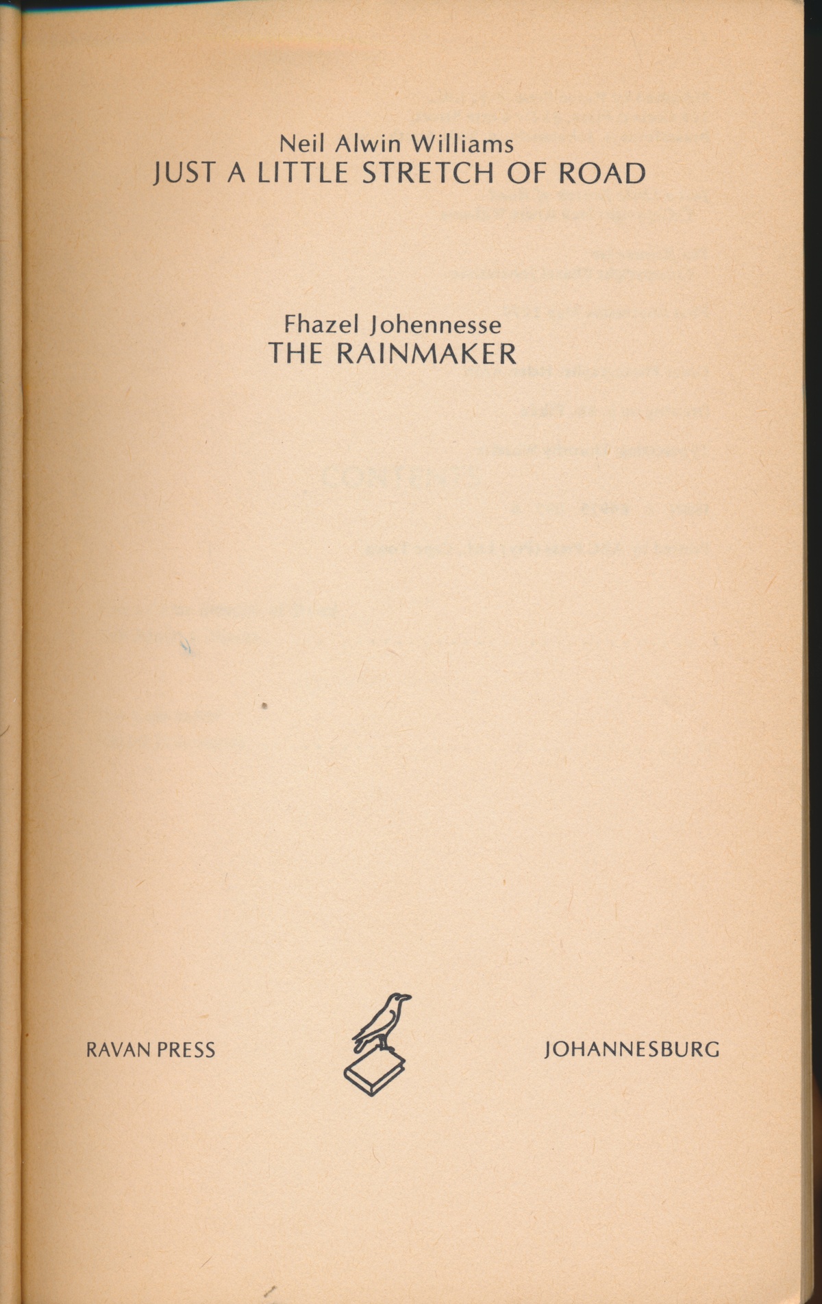 Johennesse, F. and Williams, N.A. (1979) Just a Little Stretch of Road / The Rainmaker. Johannesburg: Ravan Press.